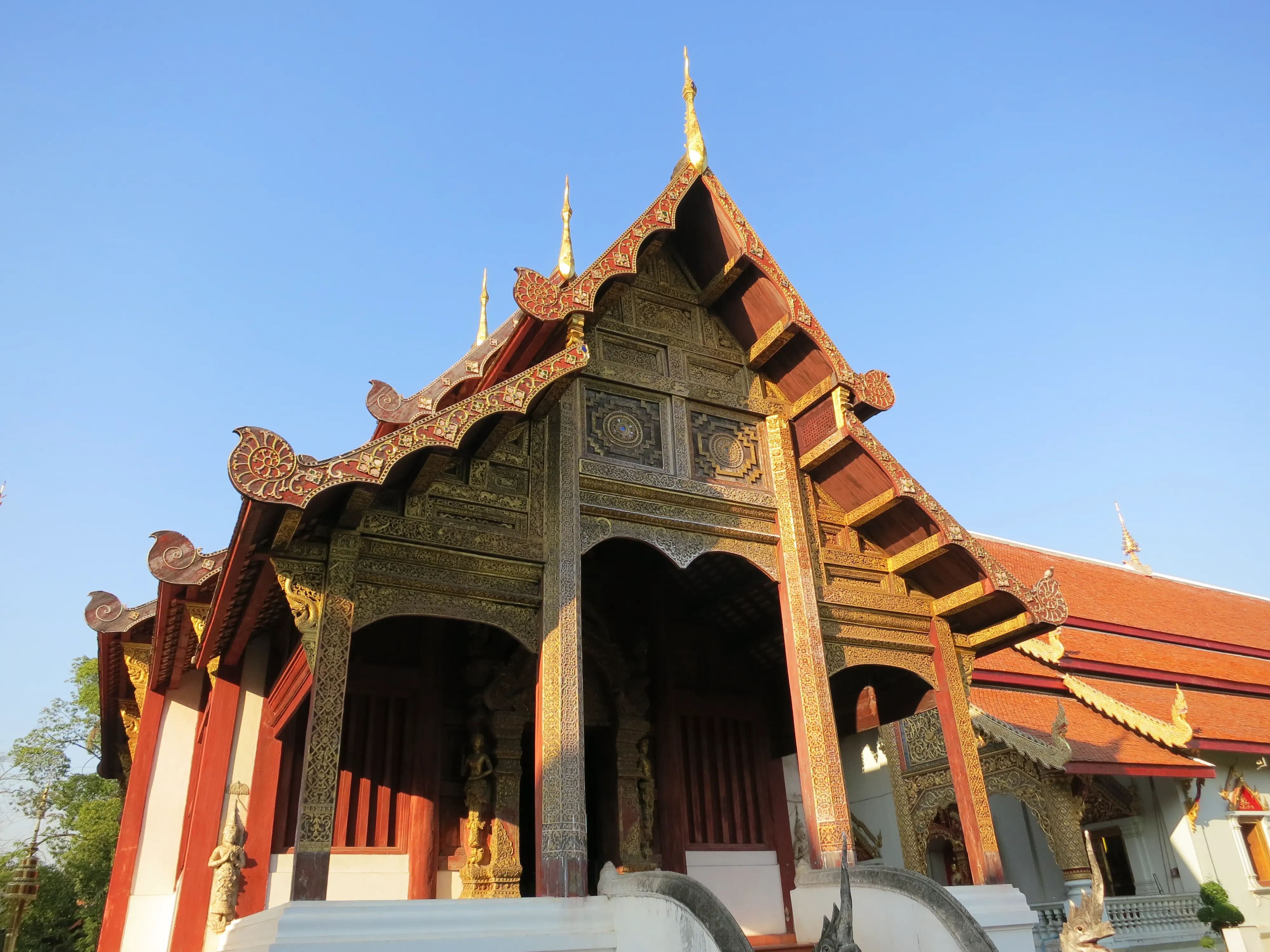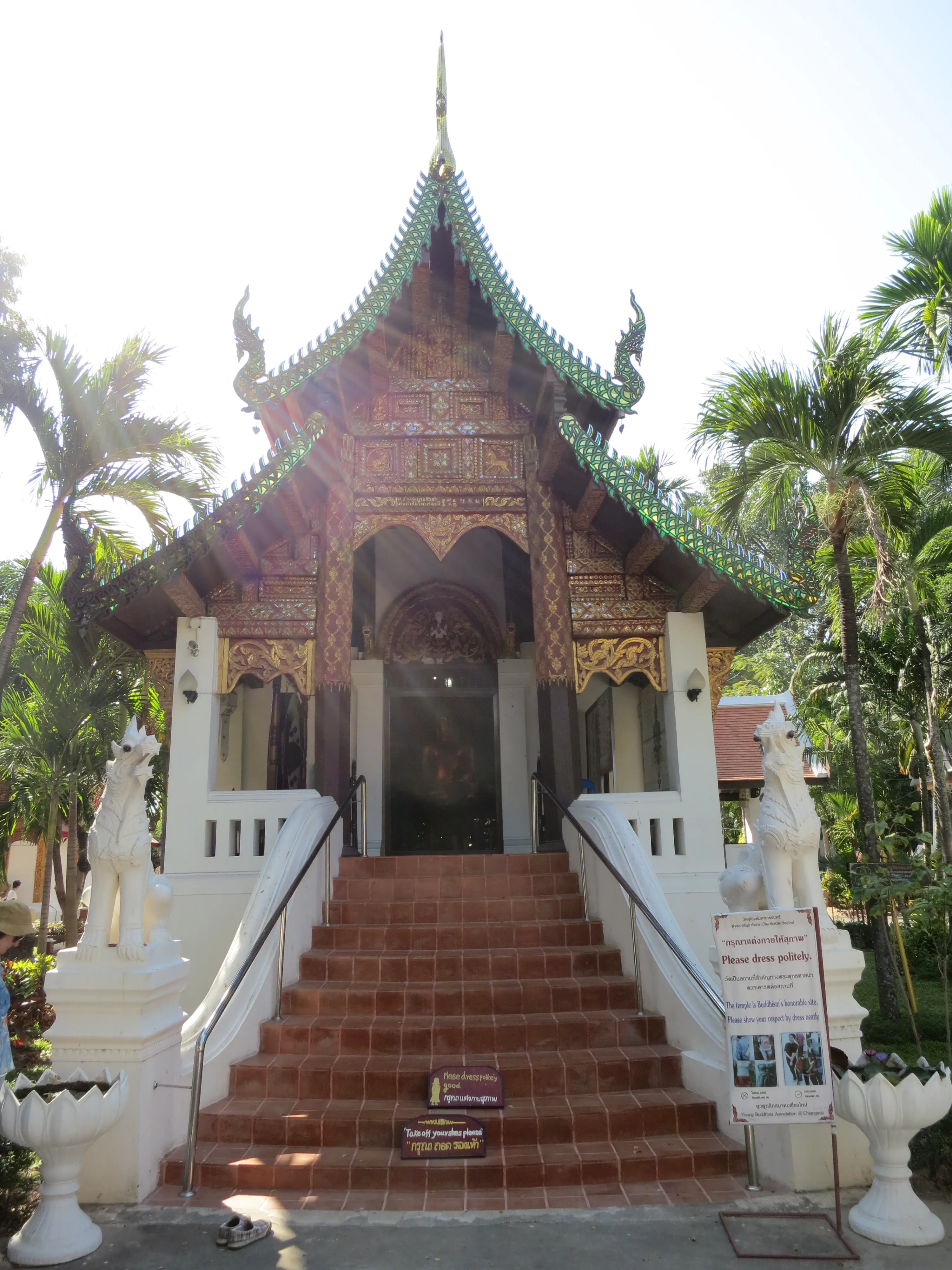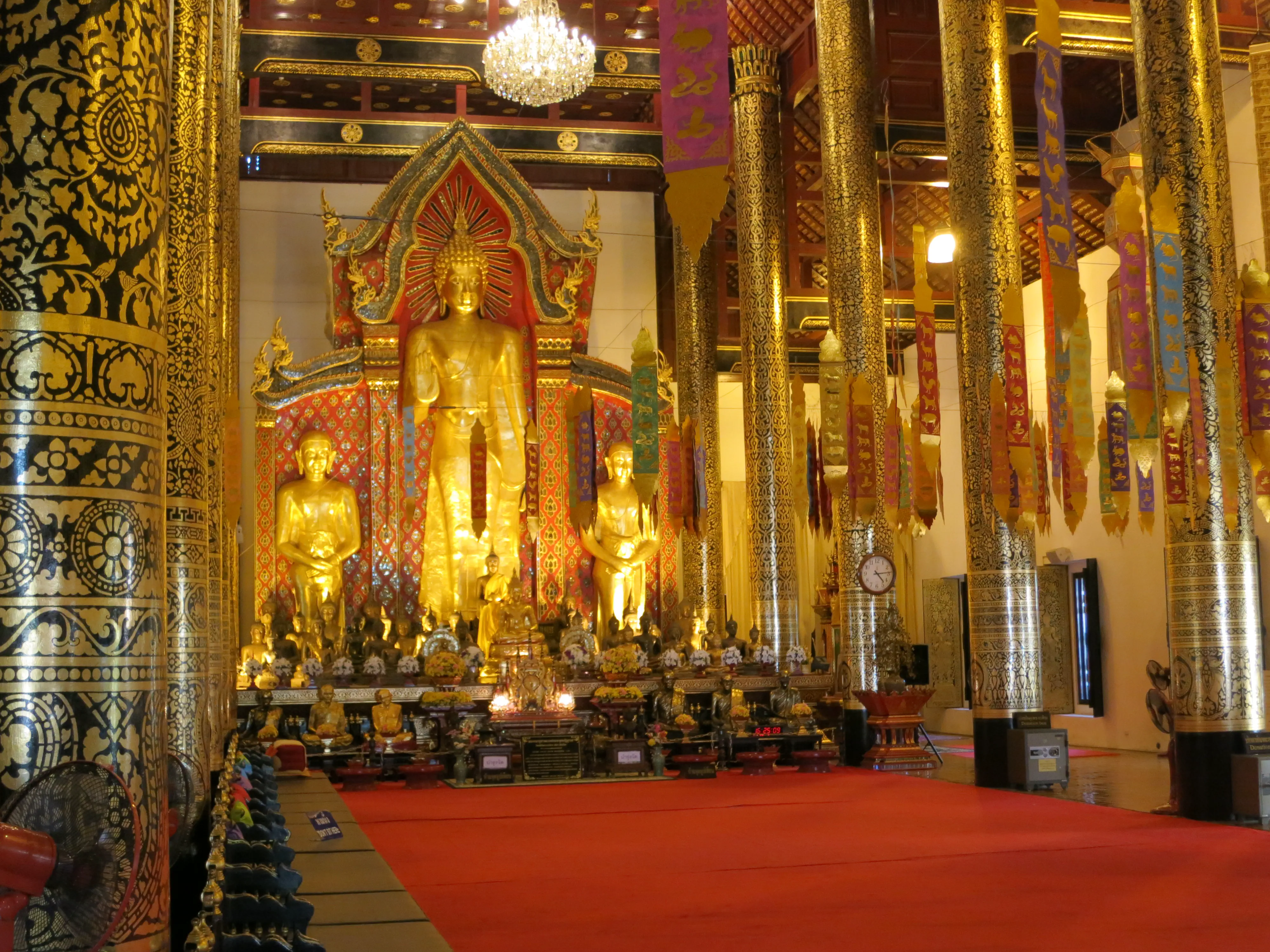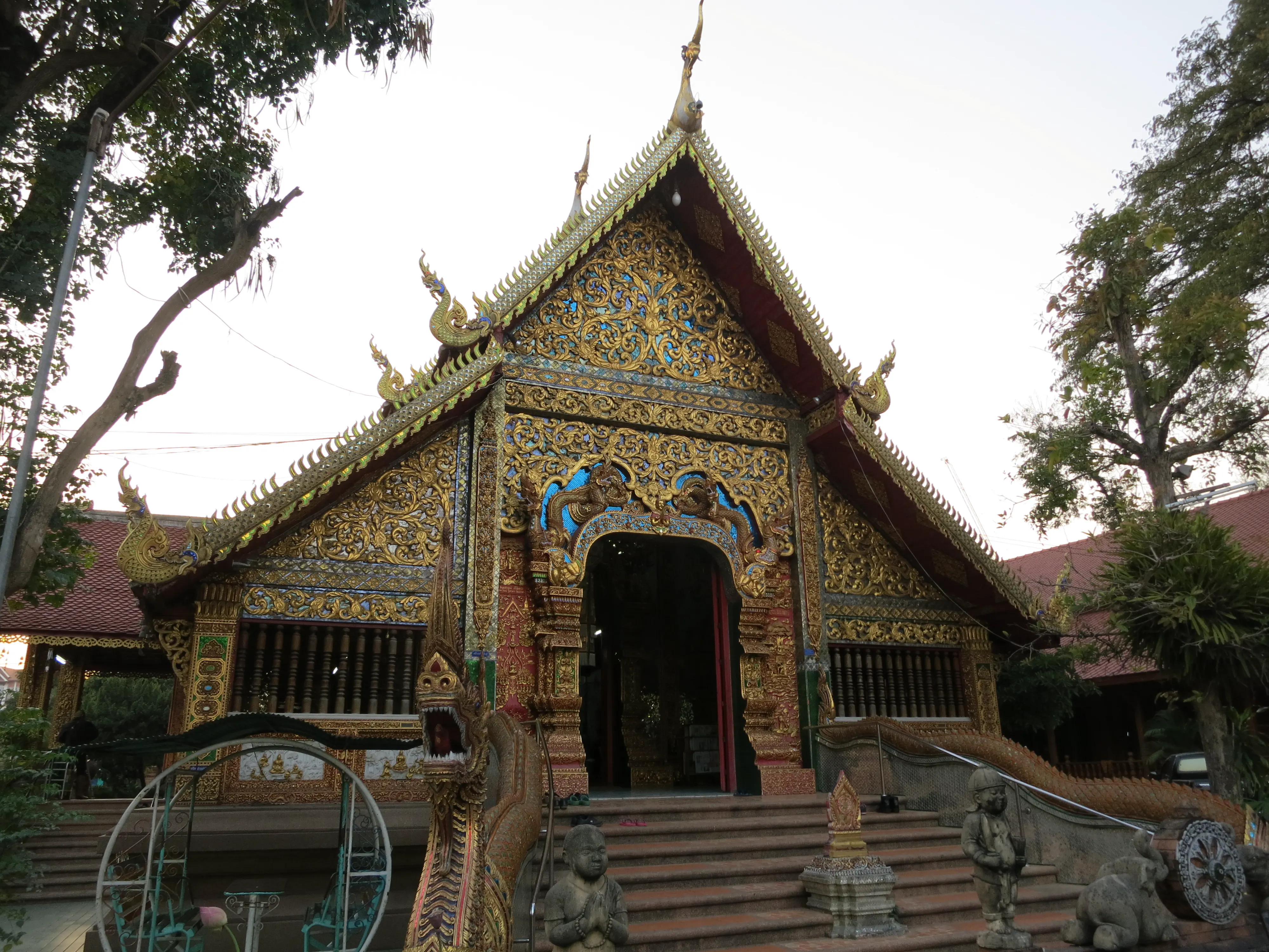 After arriving in Chiang Mai we successfully checked into our hotel, the Sira Boutique hotel, located just inside the moat in the old town, near the north gate. It is surprisingly nice inside, the room is neatly appointed and clean. The bed is pretty hard, which has been typical for the hotels we have stayed at during the trip. I guess that hard beds are a thing in Asia. I took a small break to put a cold towel on my still-sunburned shoulders, after which we left the hotel and started out on a walking tour of old Chiang Mai. The city itself is much more picturesque than either Patong or Bangkok, and much cleaner.