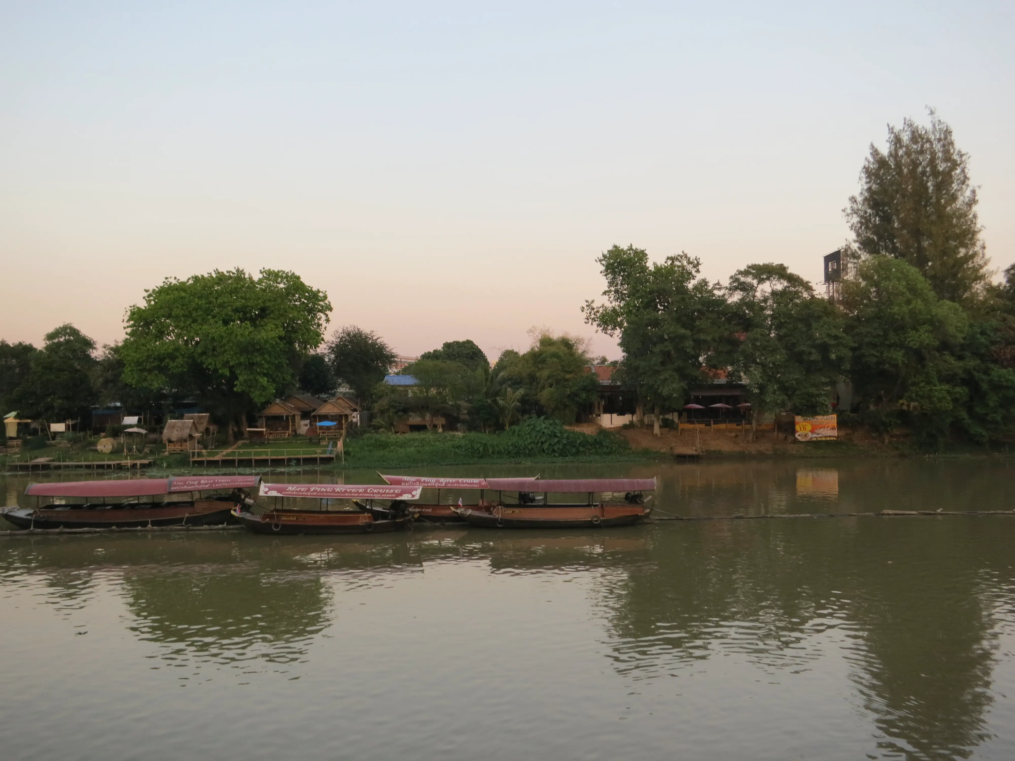 We visited about a dozen temples during the course of the afternoon; apparently there are over 300 in Chiang Mai. We certainly won’t be able to visit them all, but we saw some of the major ones. One of the temples we visited was Wat Chiang Man, the oldest temple in Chiang Mai. We also visited Wat Chedi Luang, which is where the Emerald Buddha that we saw in the Royal Palace used to be located. We also visited Wat Phra Sing. We went on a bit south of the old town to find Wat Chai Mongkhon, then had a brief break as we sat on a bench outside the temple, looking out over the Ping river. We walked back to the hotel by way of the Chiang Mai night market, which was just being set up (the sun went down as we arriving at Wat Chai Mongkhon, and our walk back to the hotel took place in the early night). After arriving back at our hotel we played a couple of hands of crib, both of which Todd won, before we set out to find dinner. This turned out to be a bit more challenging than we expected; by 9 PM it seemed that most major restaurants had already closed. After about 20 minutes of walking (and seriously contemplating just getting snacks at 7-Eleven) we returned to the restaurant we had lunch at - the first time we repeated a restaurant during the trip!