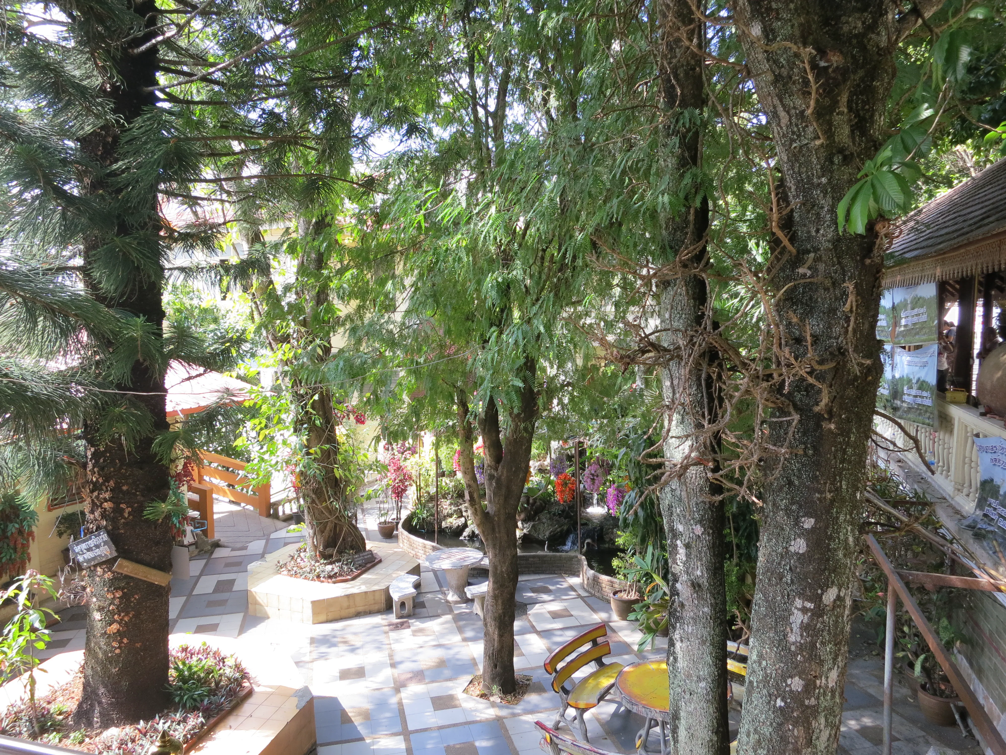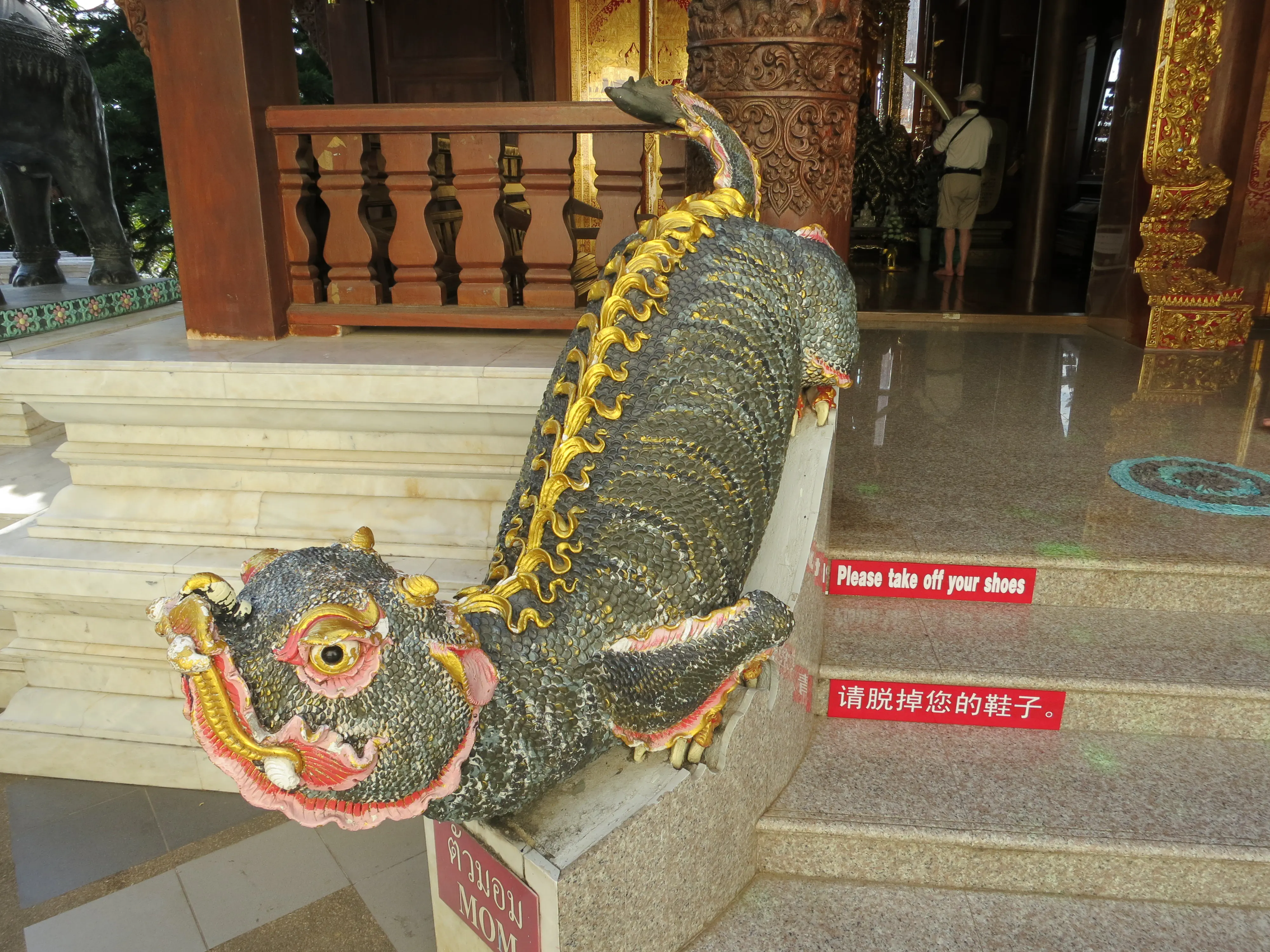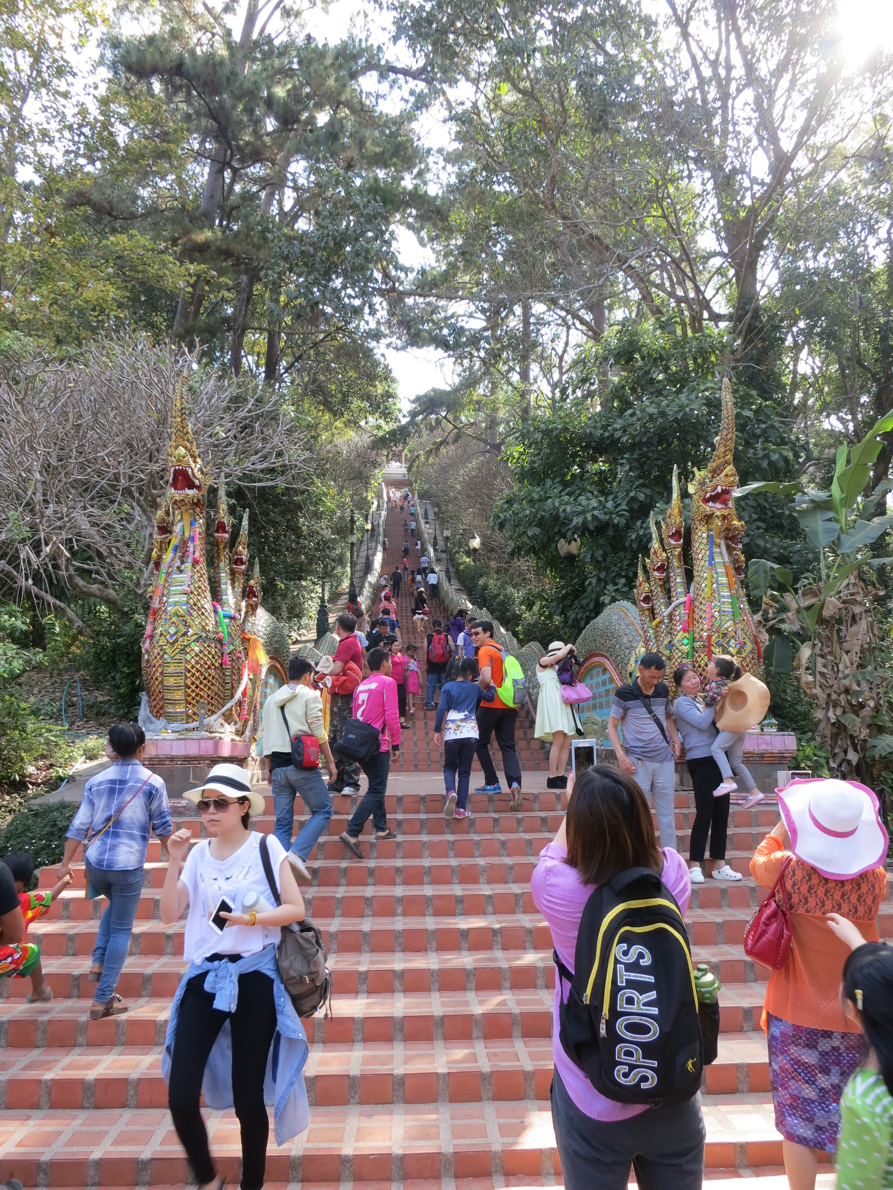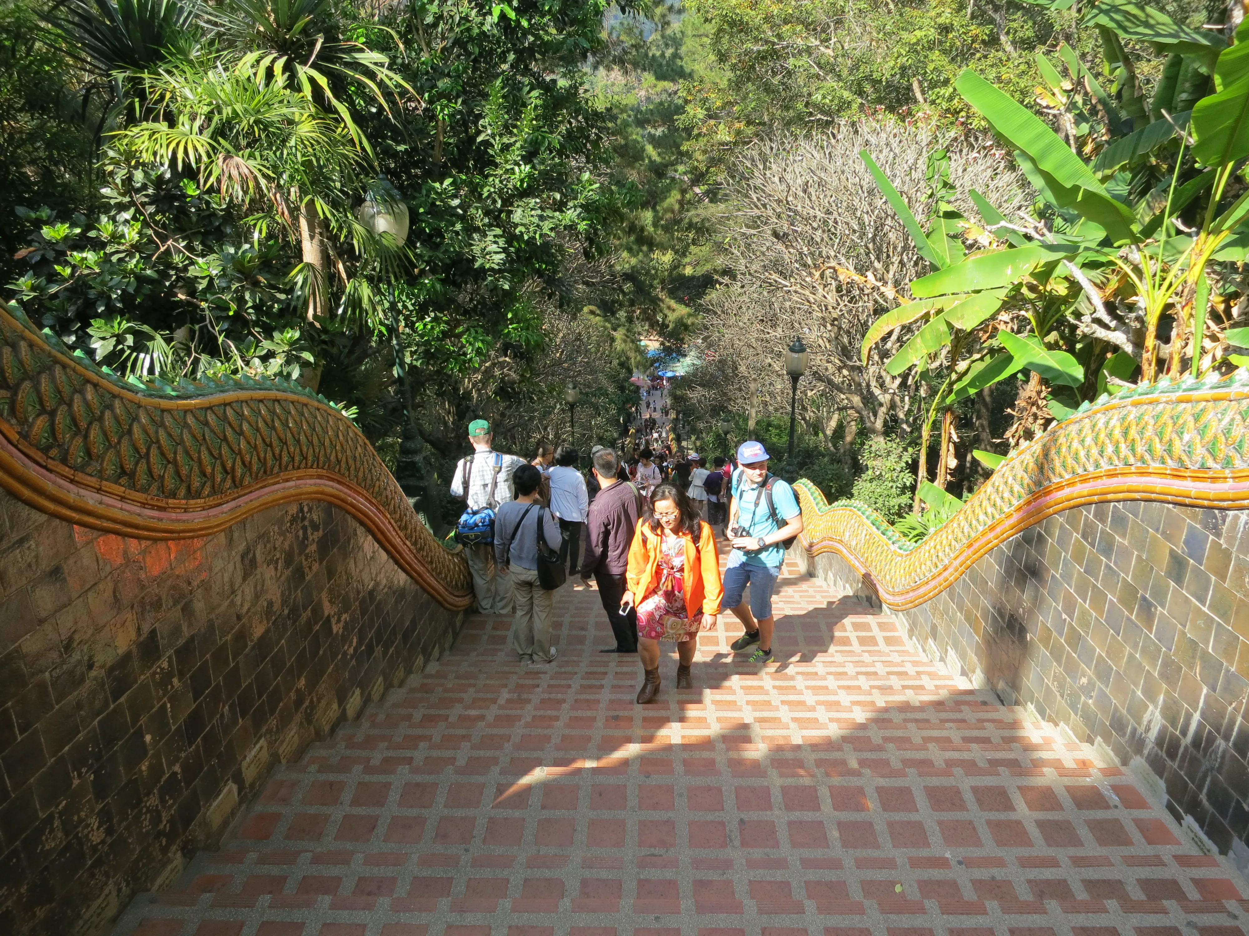 Another day of walking! We got up and left the hotel just after 9:15 in the morning, a respectably early start for a full day of touring. I had read the previous evening that we could pick up a cheap ride to the Doi Suthep temple just outside the Chang Phuak (north) gate, which was conveniently just across the road from our hotel. We crossed the moat and got into a songtheaw, which is basically a red pickup truck with a covered bench in the back for people to sit in. This vehicle, rickety as it was, made the trip up the Doi Suthep mountain without too many complaints. It certainly spewed some gross looking black smog though; emission standards are much less stringent here. After a 45 minute ride, with many twists and turns, we arrived at what appeared to be a small market with many vendors selling us cheap trinkets and food. We walked through the market to arrive at the base of the 308 step staircase which lead up to the temple. The walk up was no issue; it was crowded however so I wasn’t able to get any really nice photos. We toured through the temple and looked out over the city of Chiang Mai; it was hazy though so it was difficult to make out the city.