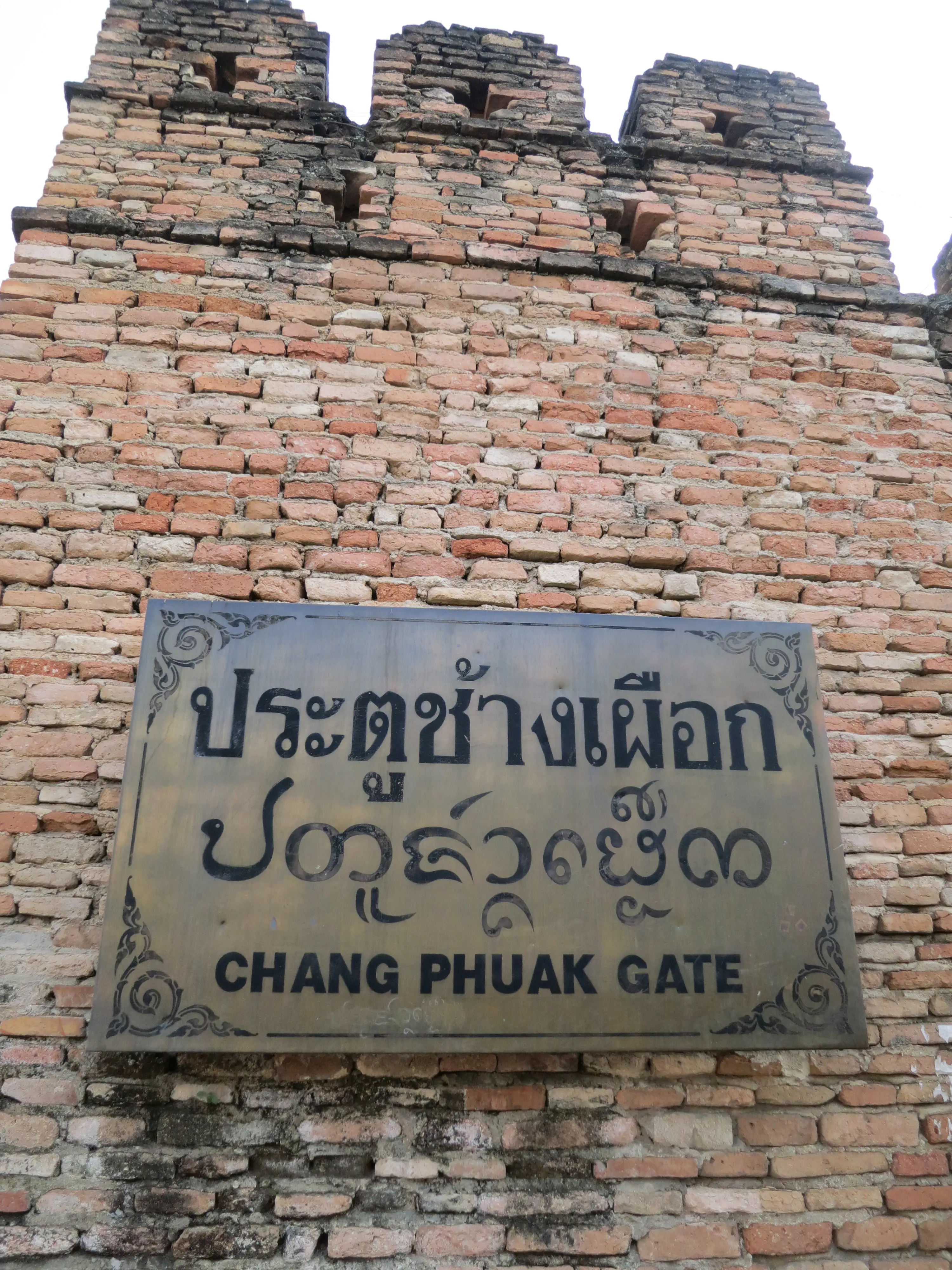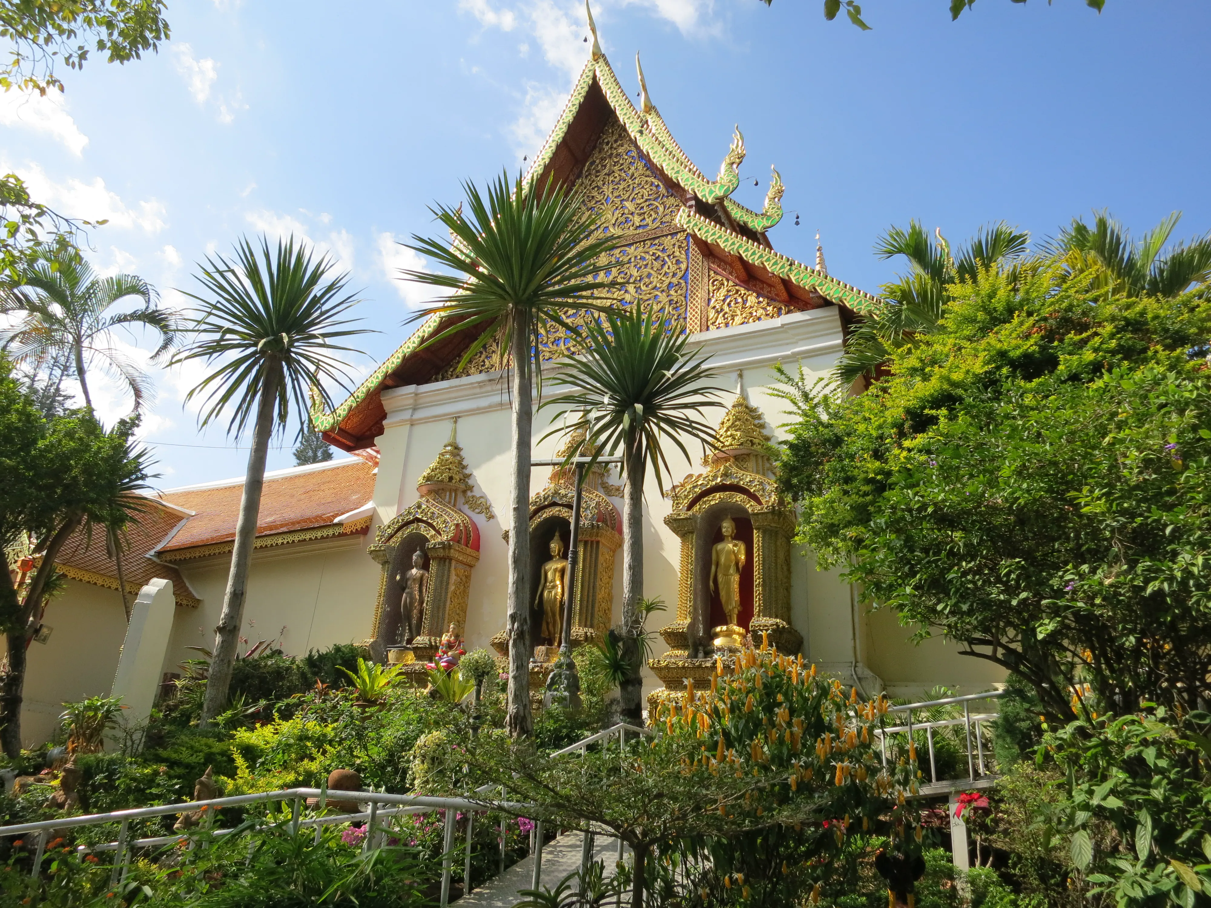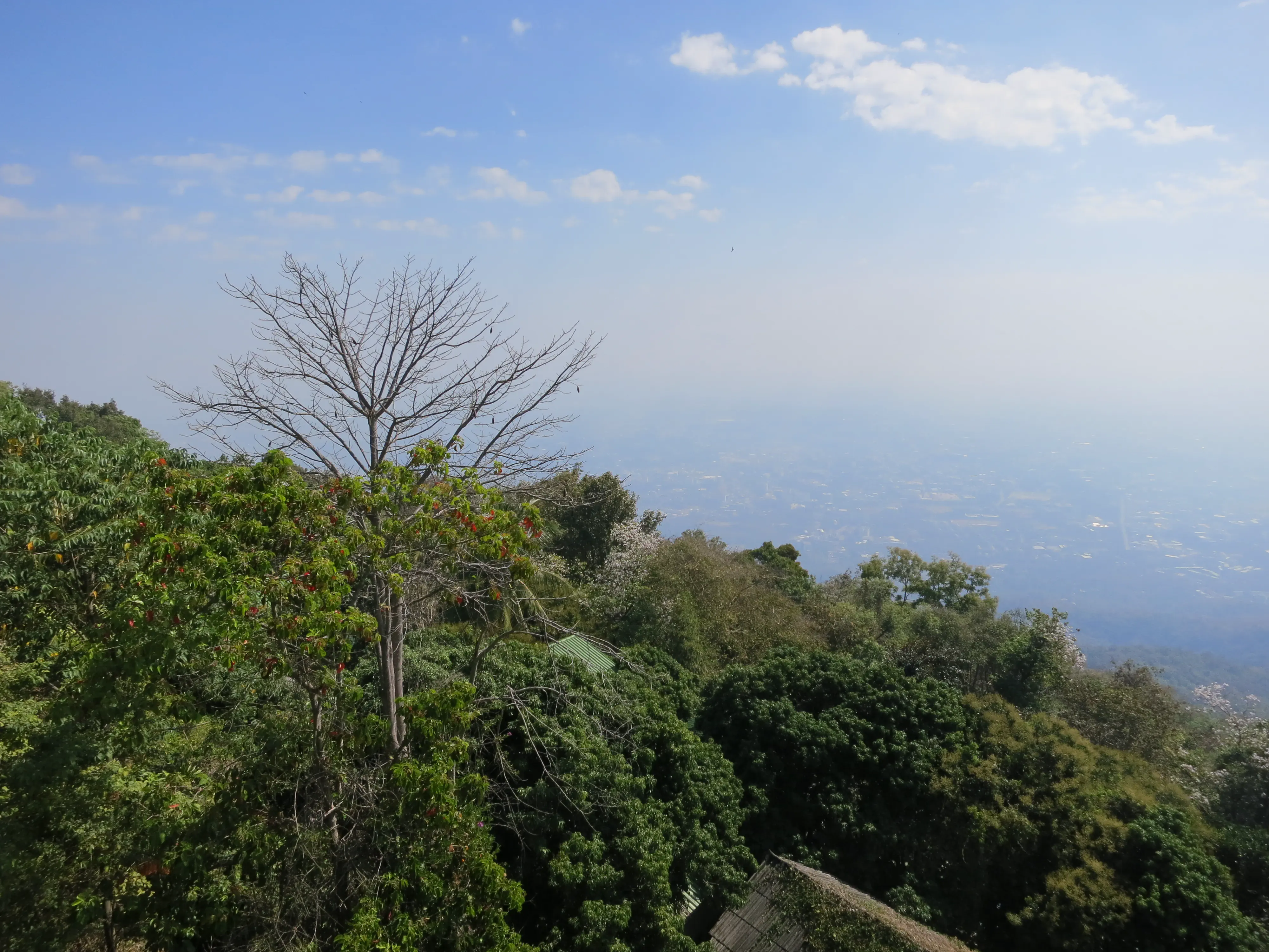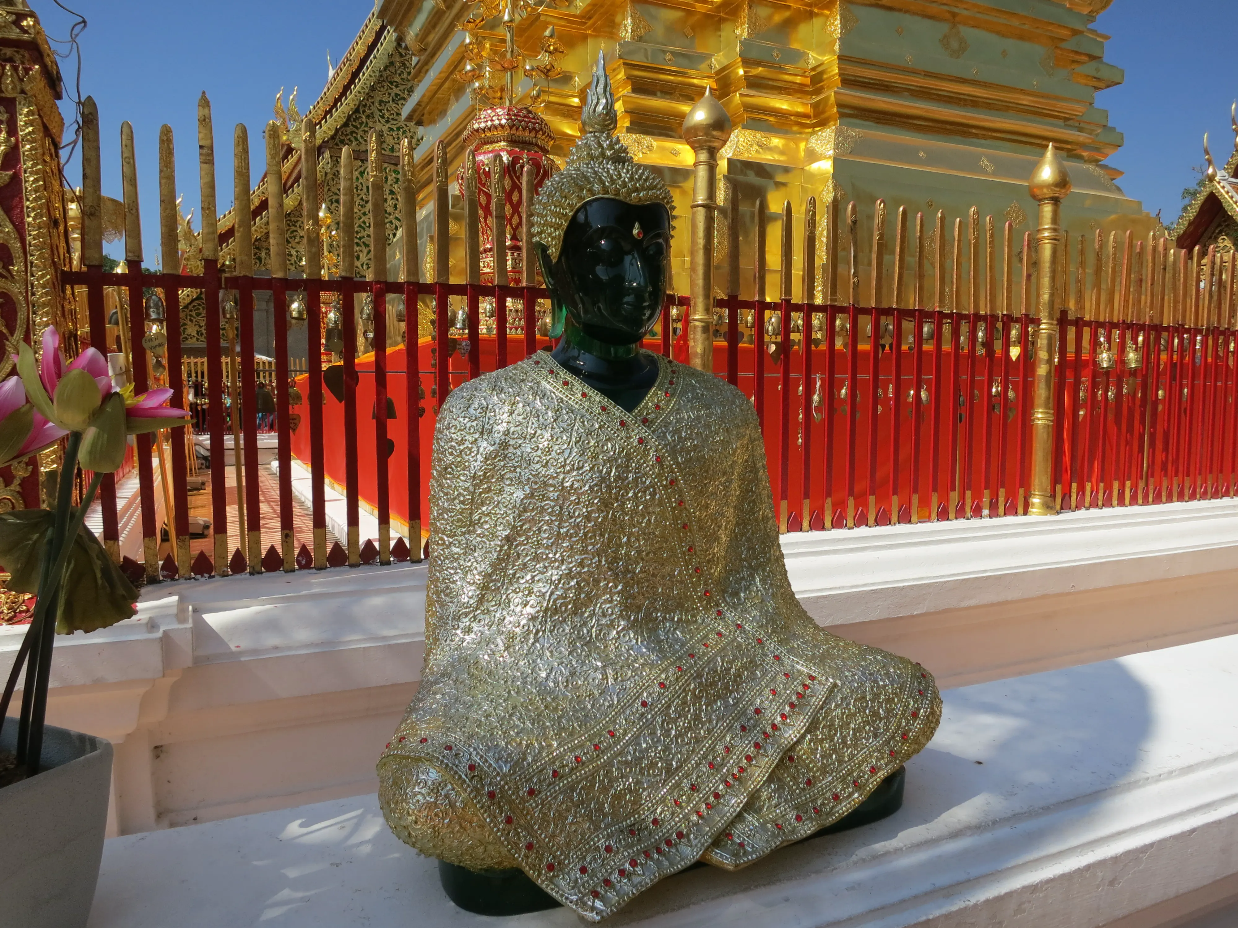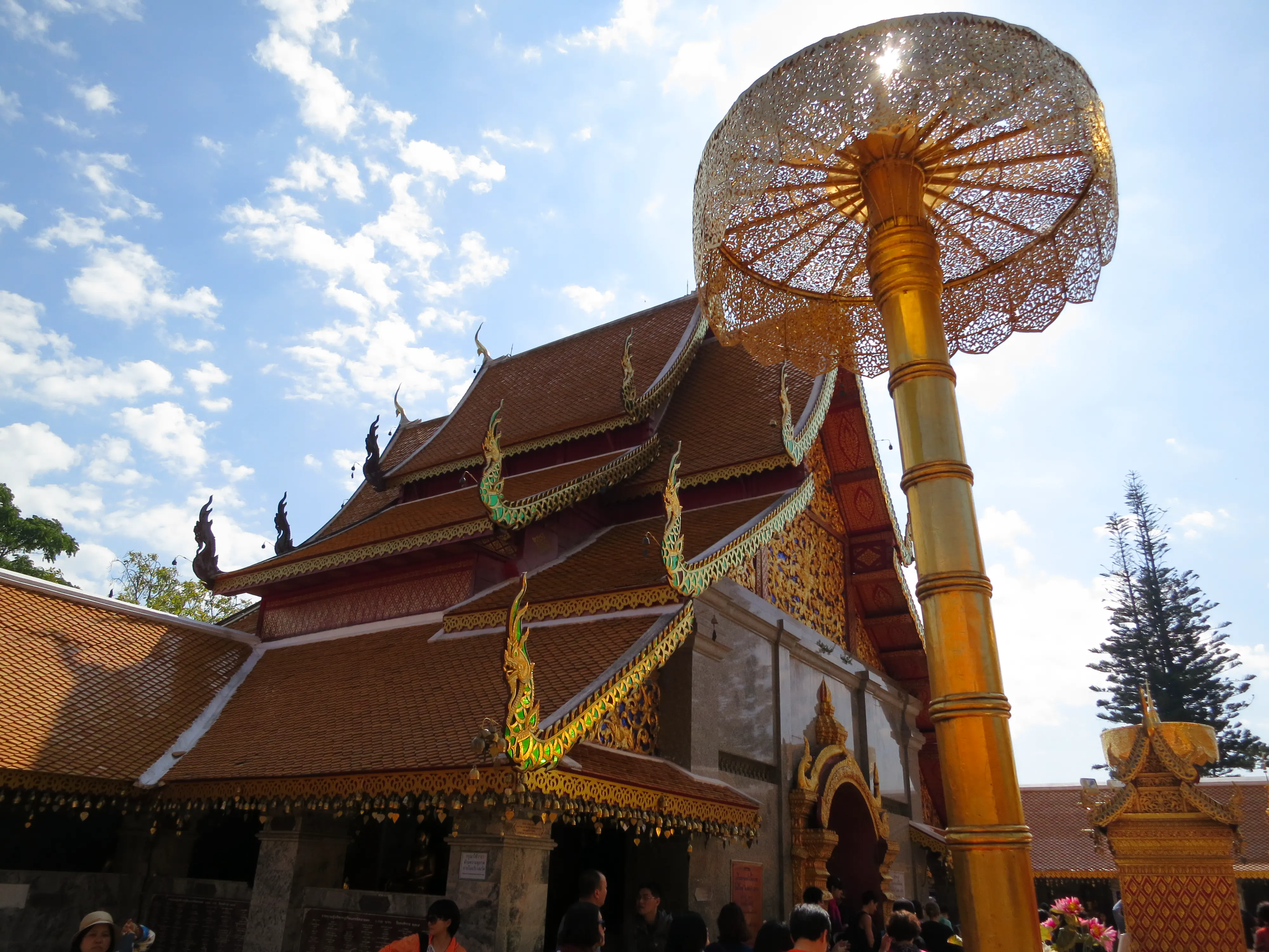 Another day of walking! We got up and left the hotel just after 9:15 in the morning, a respectably early start for a full day of touring. I had read the previous evening that we could pick up a cheap ride to the Doi Suthep temple just outside the Chang Phuak (north) gate, which was conveniently just across the road from our hotel. We crossed the moat and got into a songtheaw, which is basically a red pickup truck with a covered bench in the back for people to sit in. This vehicle, rickety as it was, made the trip up the Doi Suthep mountain without too many complaints. It certainly spewed some gross looking black smog though; emission standards are much less stringent here. After a 45 minute ride, with many twists and turns, we arrived at what appeared to be a small market with many vendors selling us cheap trinkets and food. We walked through the market to arrive at the base of the 308 step staircase which lead up to the temple. The walk up was no issue; it was crowded however so I wasn’t able to get any really nice photos. We toured through the temple and looked out over the city of Chiang Mai; it was hazy though so it was difficult to make out the city.