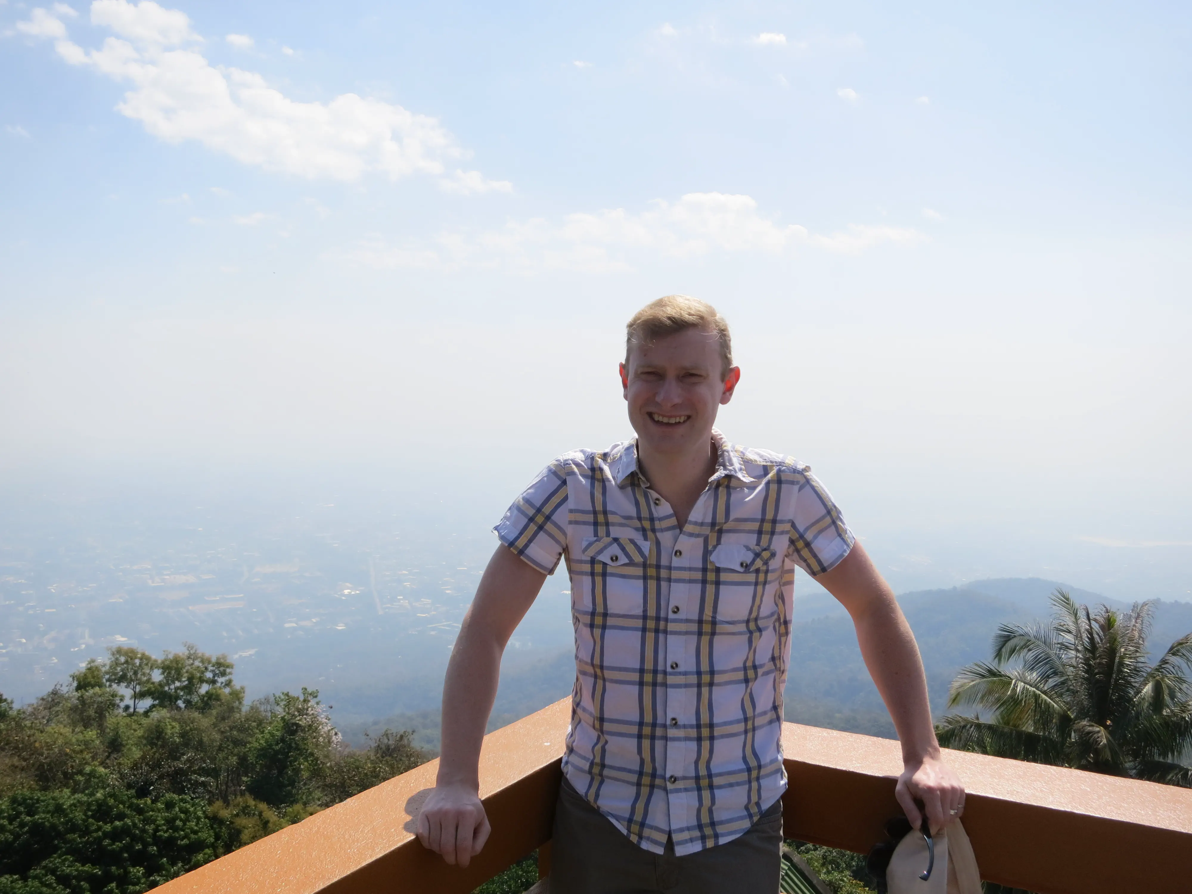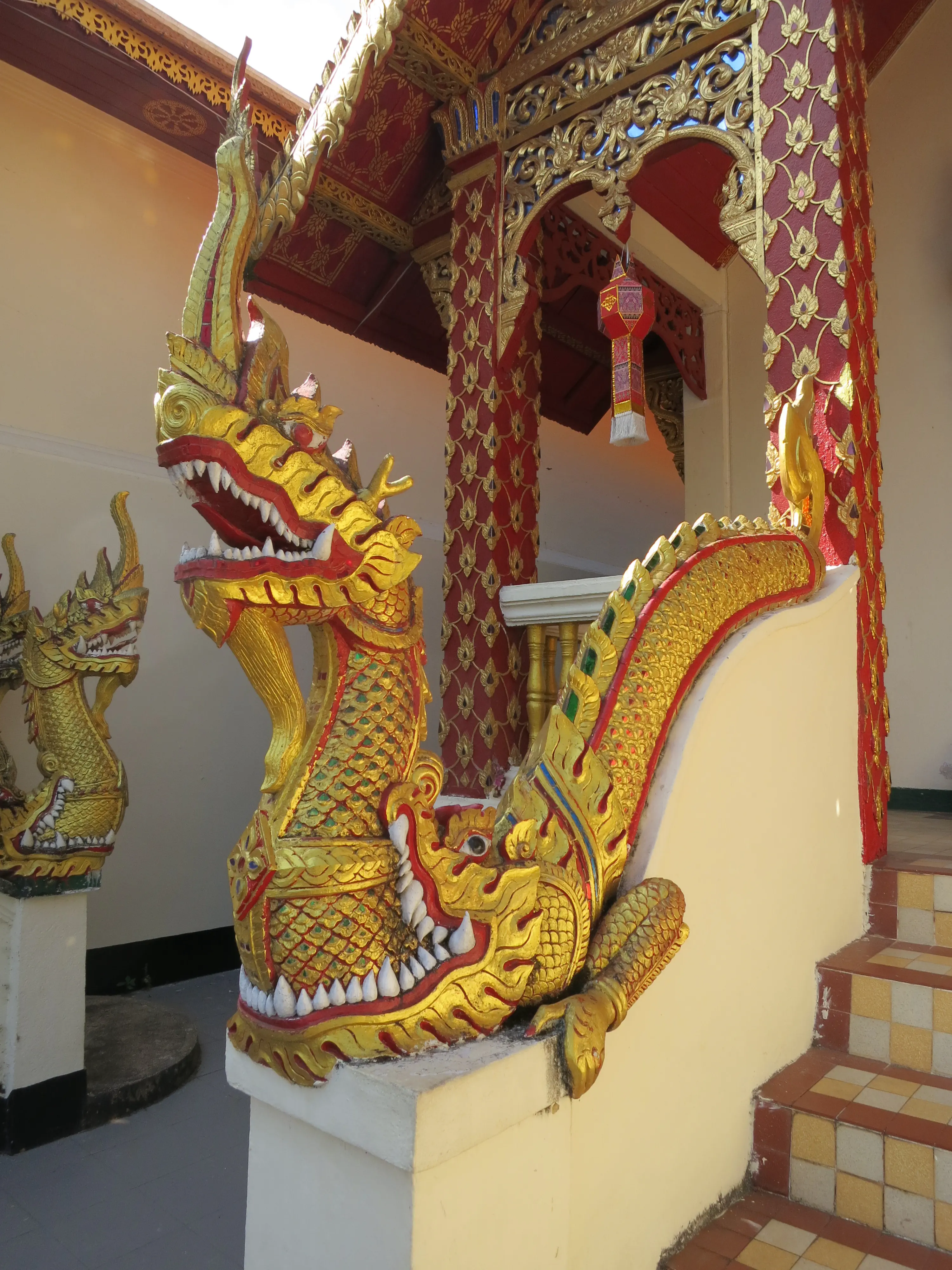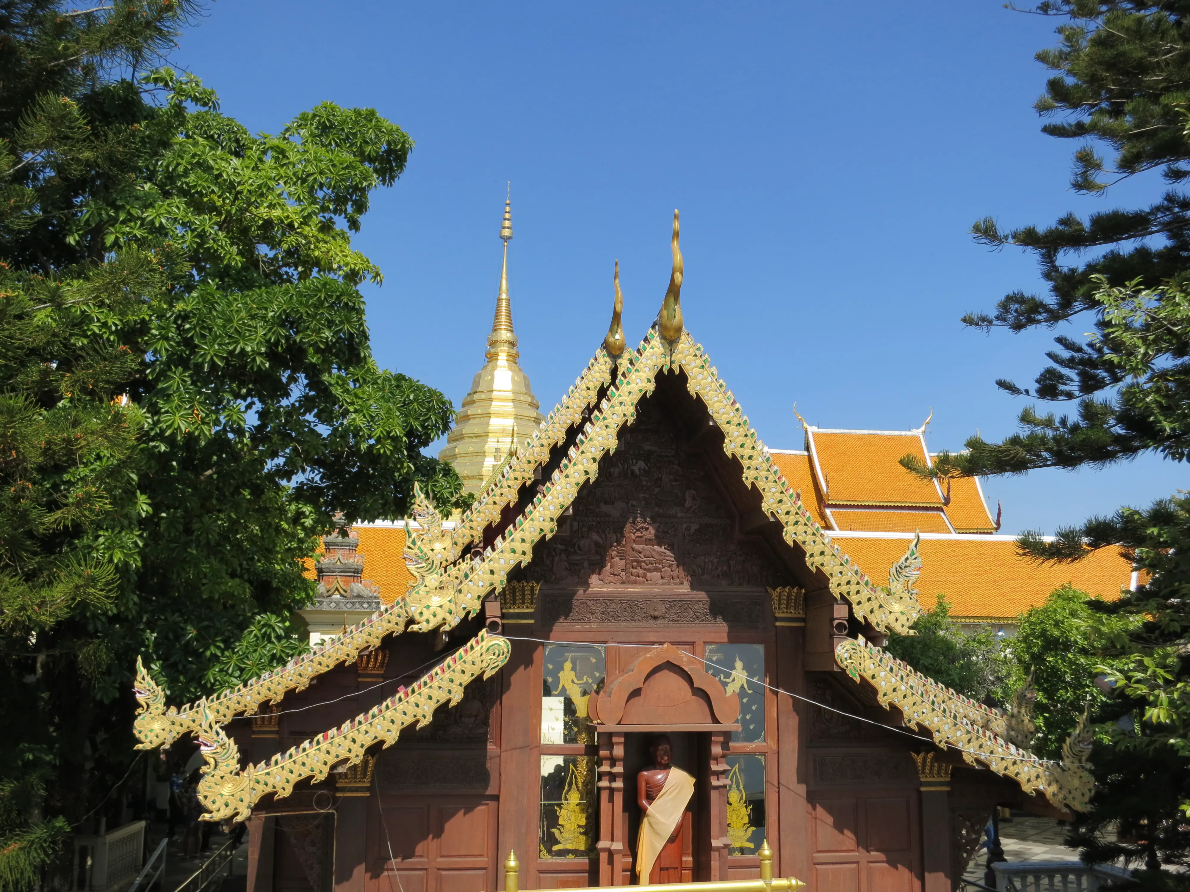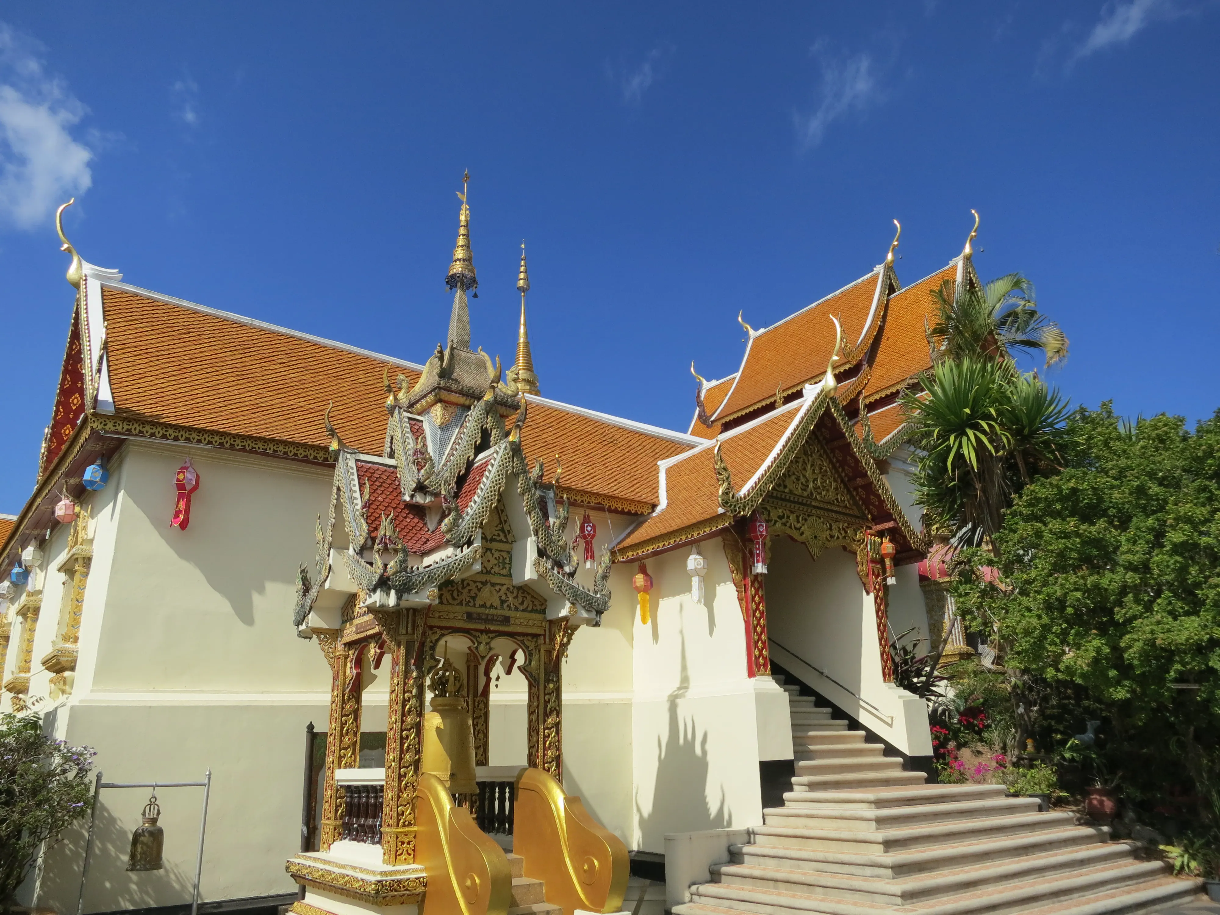 Another day of walking! We got up and left the hotel just after 9:15 in the morning, a respectably early start for a full day of touring. I had read the previous evening that we could pick up a cheap ride to the Doi Suthep temple just outside the Chang Phuak (north) gate, which was conveniently just across the road from our hotel. We crossed the moat and got into a songtheaw, which is basically a red pickup truck with a covered bench in the back for people to sit in. This vehicle, rickety as it was, made the trip up the Doi Suthep mountain without too many complaints. It certainly spewed some gross looking black smog though; emission standards are much less stringent here. After a 45 minute ride, with many twists and turns, we arrived at what appeared to be a small market with many vendors selling us cheap trinkets and food. We walked through the market to arrive at the base of the 308 step staircase which lead up to the temple. The walk up was no issue; it was crowded however so I wasn’t able to get any really nice photos. We toured through the temple and looked out over the city of Chiang Mai; it was hazy though so it was difficult to make out the city.