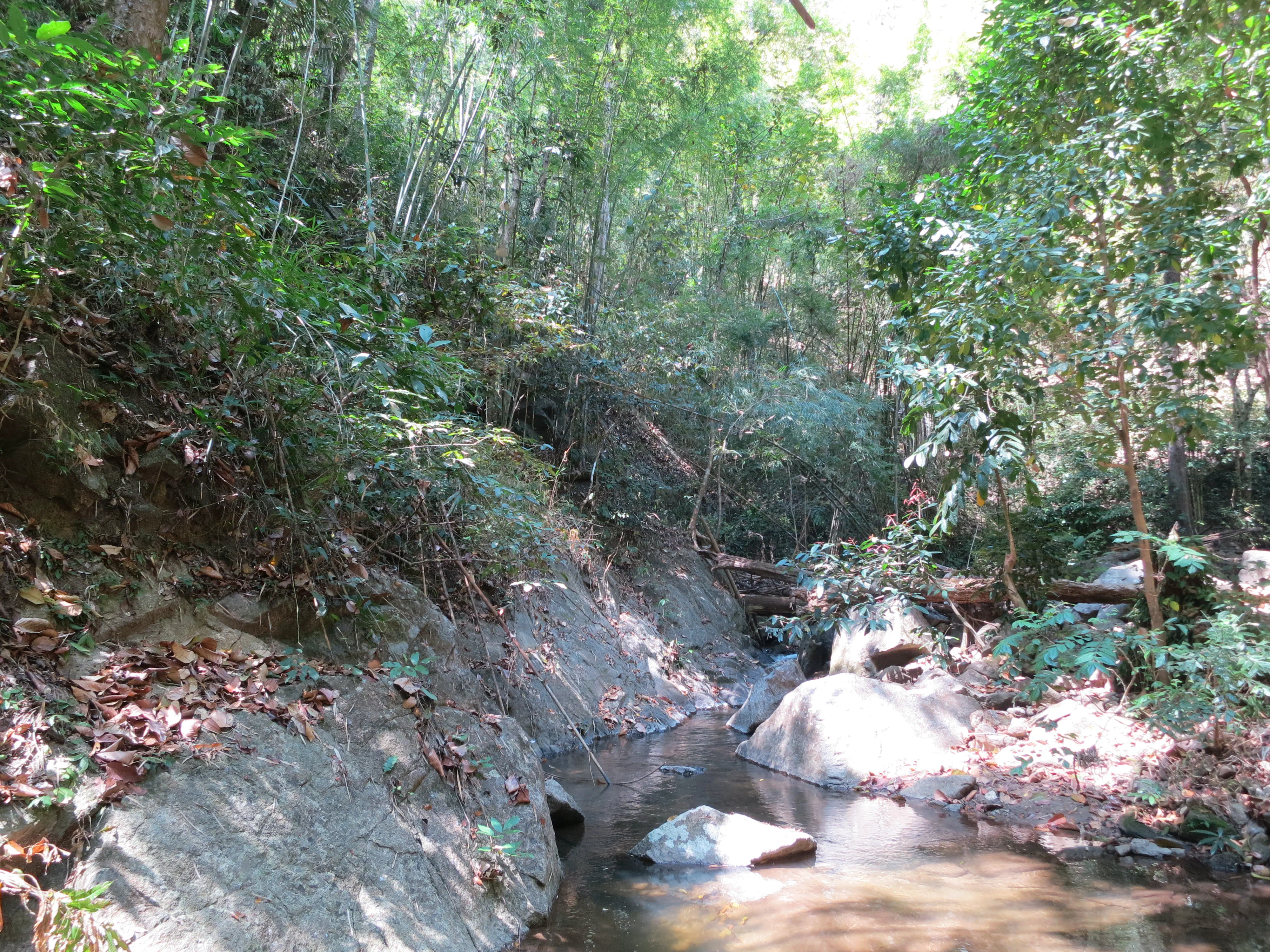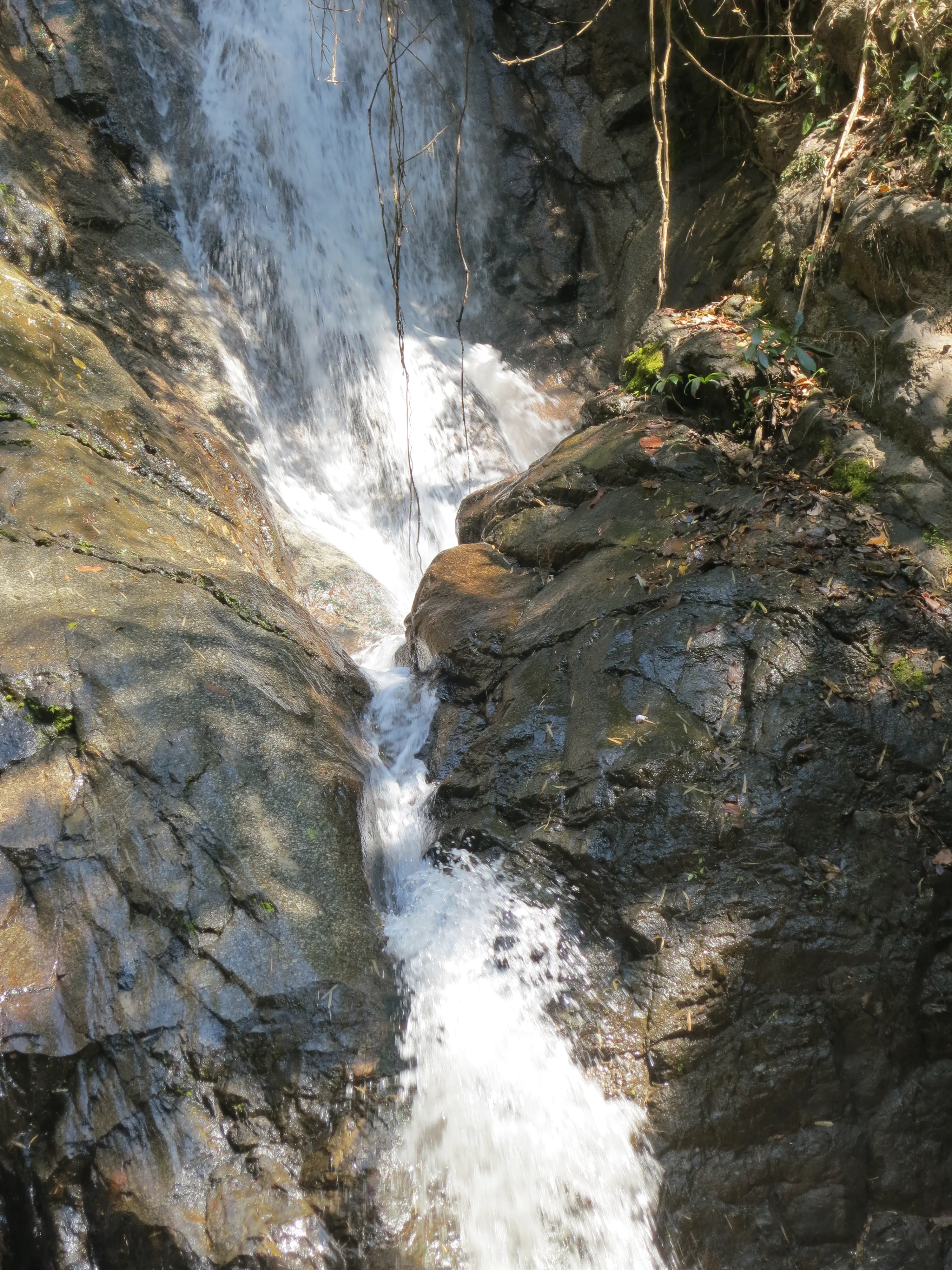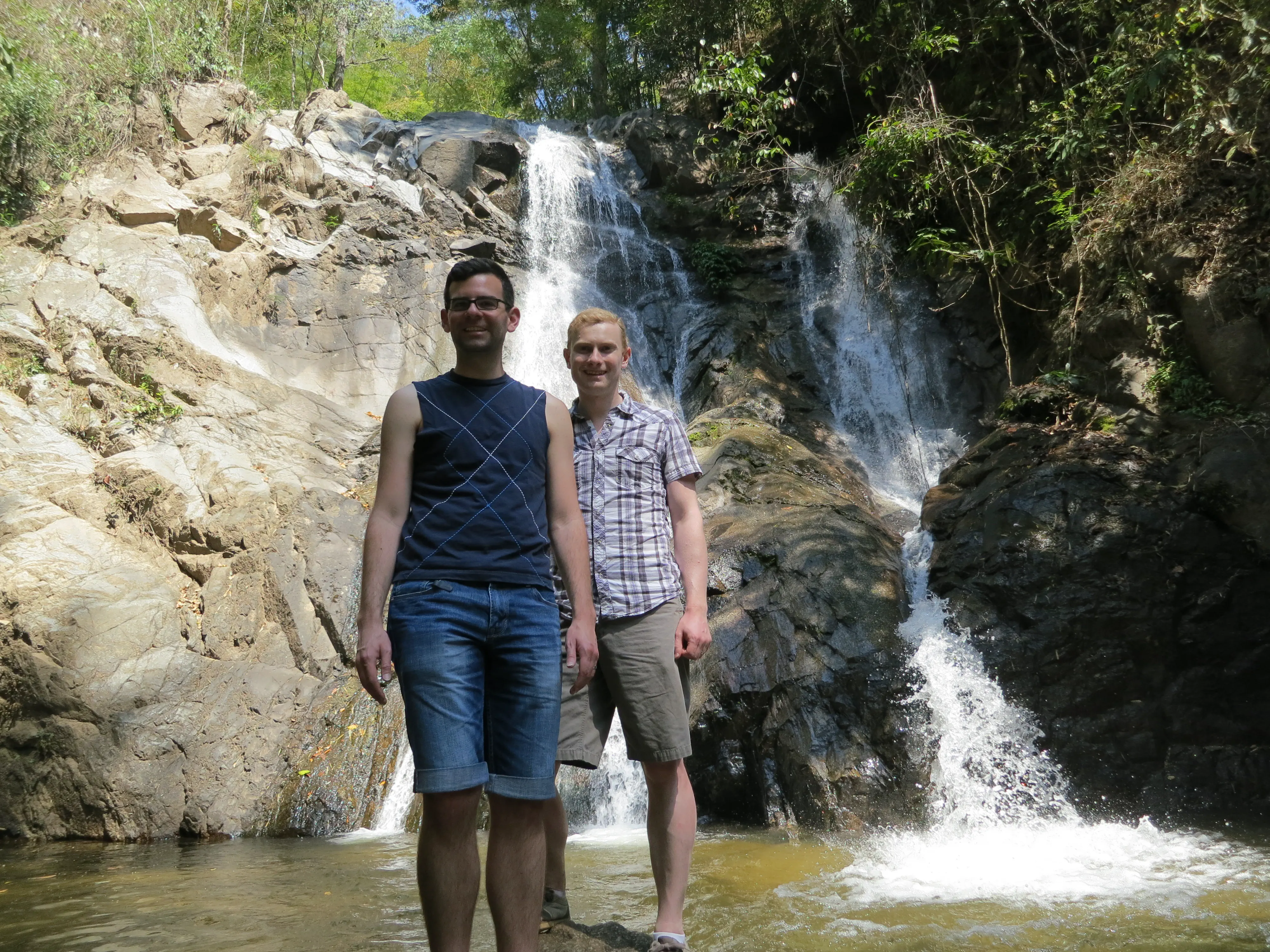 After the elephant ride we took a quick break for lunch. Lunch was simple and portable, pad thai wrapped in a banana leaf. The tour then continued with a hike in the jungle, which took us to a waterfall. The hike took about 45 minutes in each direction. It was a pretty low-intensity trail, but other people in the group seemed to have a hard time with it. Todd had no troubles though, and seemed to enjoy stretching his legs. We got some nice photos of the two of us at the falls before returning back to the songthaew. On the return trip we saw a tarantula nest, however, we didn’t see any of the tarantulas.