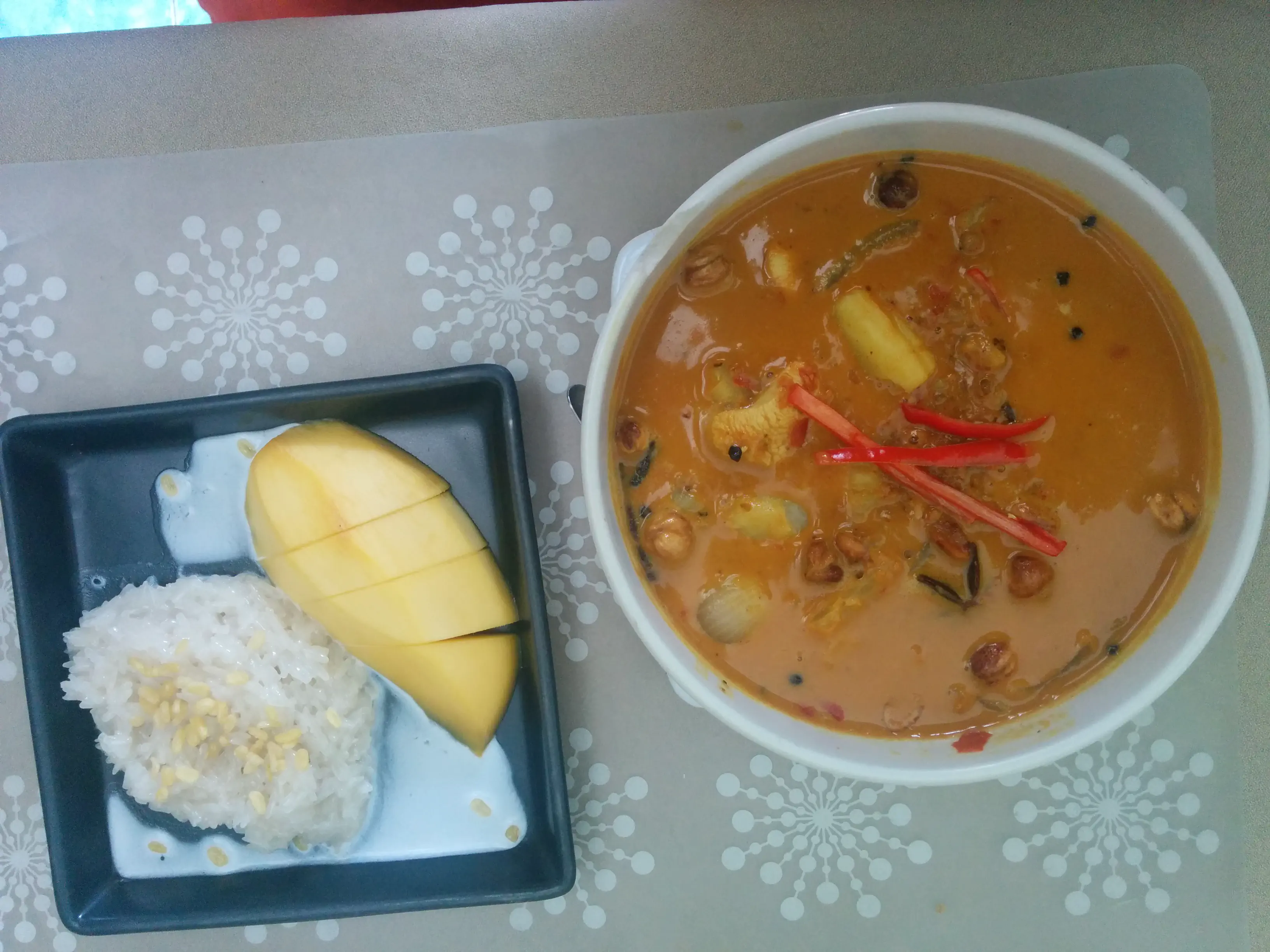 At 11 AM a songthaew picked us up and drove us to the cooking school, which was just the back half of a family house in the suburbs of Chiang Mai. We were the only people in the afternoon class, everyone else present had attended the full day class. We joined the party a little late. We started out doing a noodle dish; I learned to cook pad thai while Todd learned how to cook some other noodle dish (whose name we both forgot). After eating the pad thai (it was pretty good!) we moved onto making appetizers. I made a spicy mango salad, which I added too much spice too, while Todd made a spicy noodle dish. Both were alright, but far from the best part of the day. We next made a curry paste from scratch; then used it to cook a curry of our own. I made a panang curry while Todd made a massaman curry; both turned out to be delicious. We’re definitely going to have to try this again back in Waterloo, the only challenge will be adapting it to be cooked on an electric stovetop instead of gas. The gas provided much more heat much more quickly; we’ll need to adjust for that. Getting the ingredients may also be a bit challenging, but at the end of the class we were giving a recipe booklet so hopefully we’ll be able to figure things out. We got to chat with some of the other people attending the class; it was nice to chat with some new faces. After the curry we made a mango sticky rice, which was delicious, but at this point we were both too full to finish it.