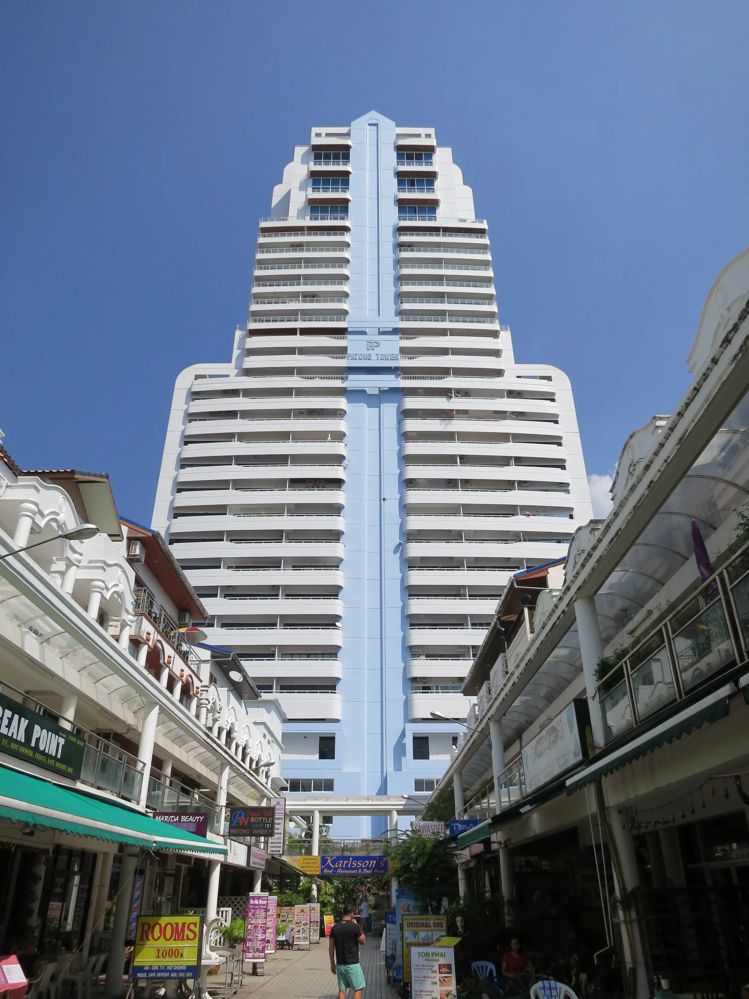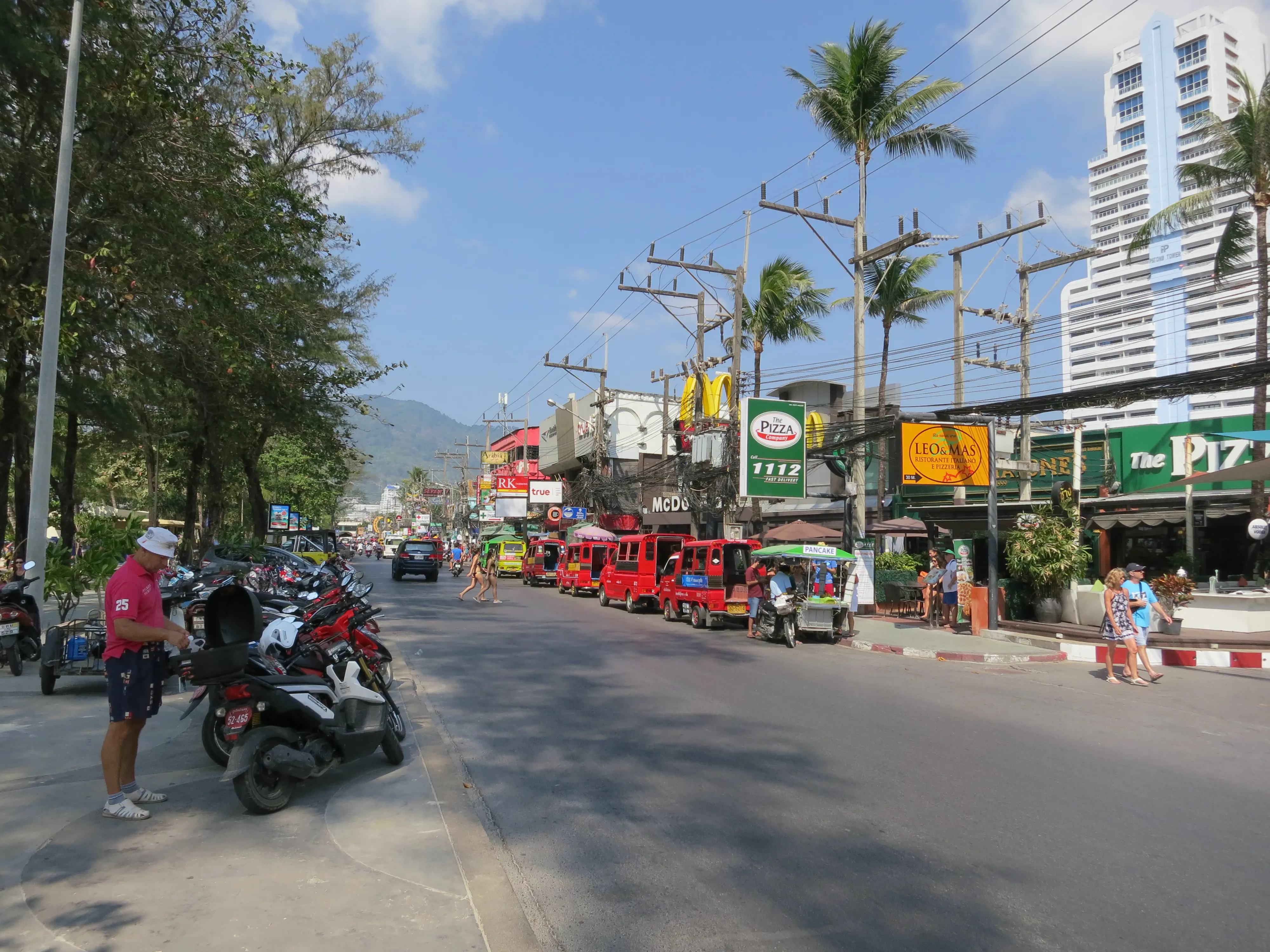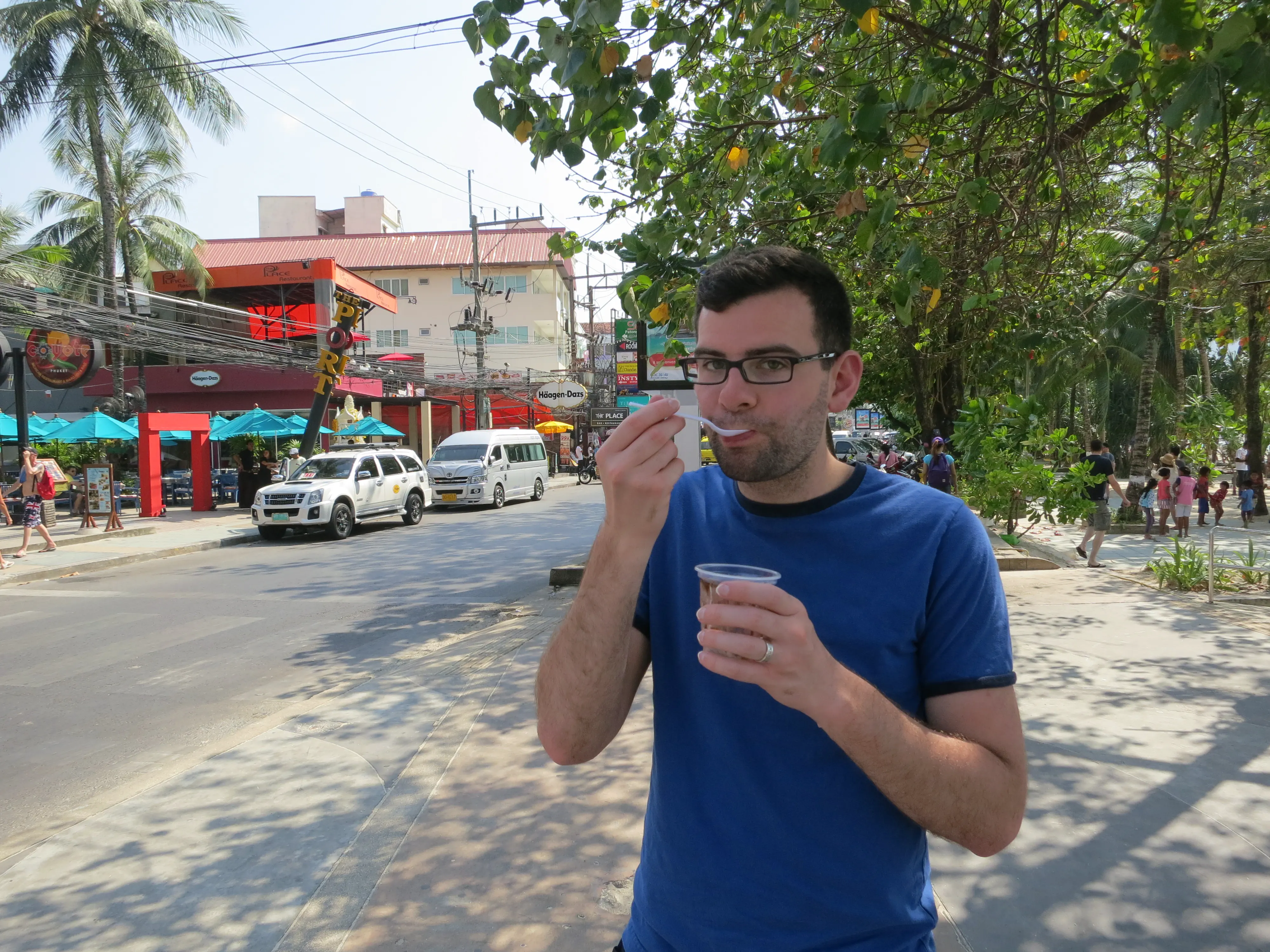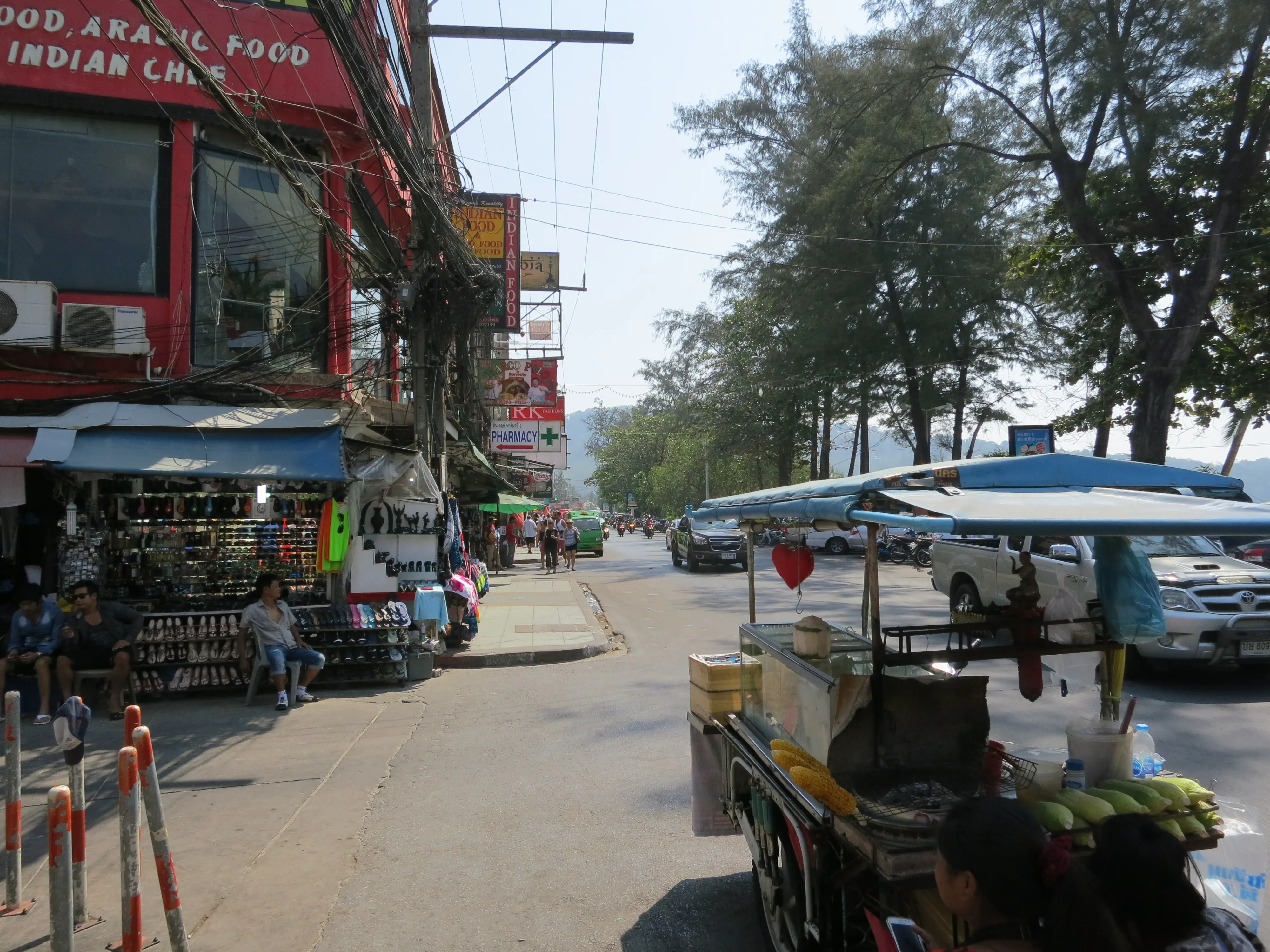 We showered, dressed, and went to find lunch. We ended up back in the street by the big resort complex at yet another restaurant; Todd had the fried rice for the first time of our trip, while I had a green curry. After lunch we went back to the hotel where I read while Todd napped, he was feeling tired and wanted to have enough energy for the evening. After a couple of hours the sun started going down, so we decided to start looking for a dinner location. We took a walk along the main drag of Patong Beach, where we ended up choosing another small Thai restaurant to eat at. I was starting to feel a bit sick to my stomach at this point, so I ordered a fried rice because it was the plainest thing available, and even still I didn’t eat more than half. We walked around for a bit before returning to the hotel; we played a couple rounds of crib. At this point I realized I’d gotten more sun than I expected and was starting to feel the heat of a bad sunburn, so I had a quick 15 minute nap with cool towels on my shoulders to help draw some of the heat out of the burn.