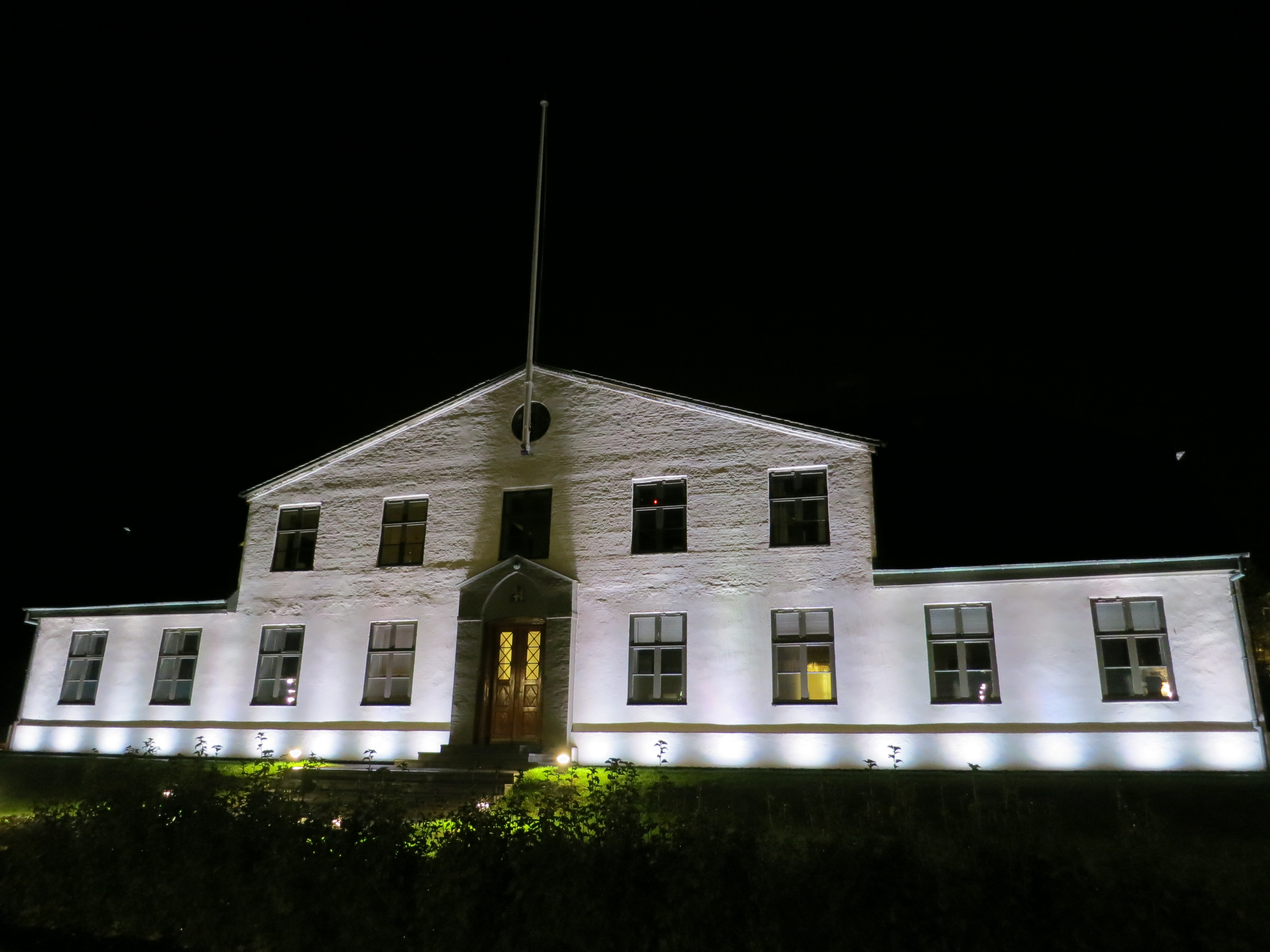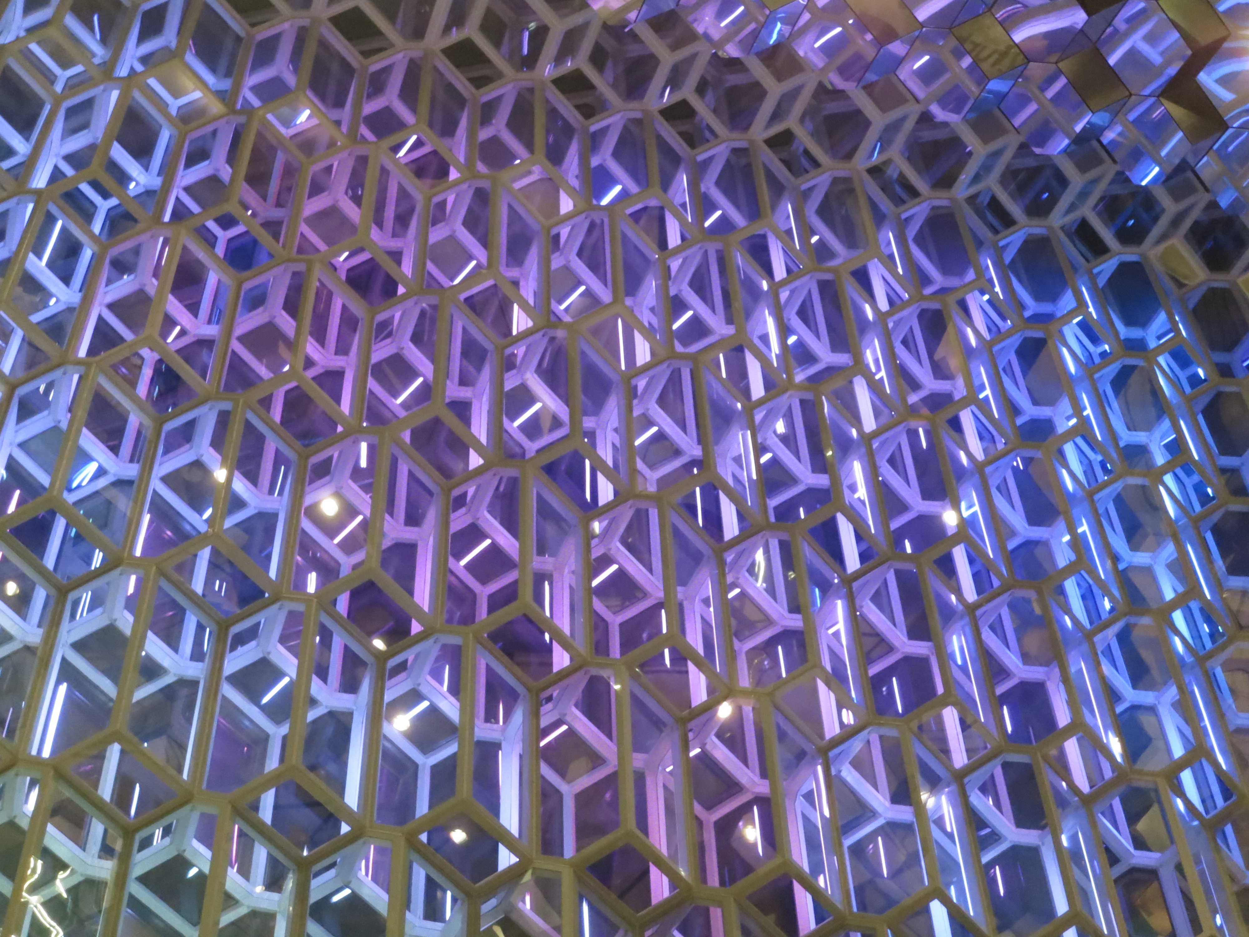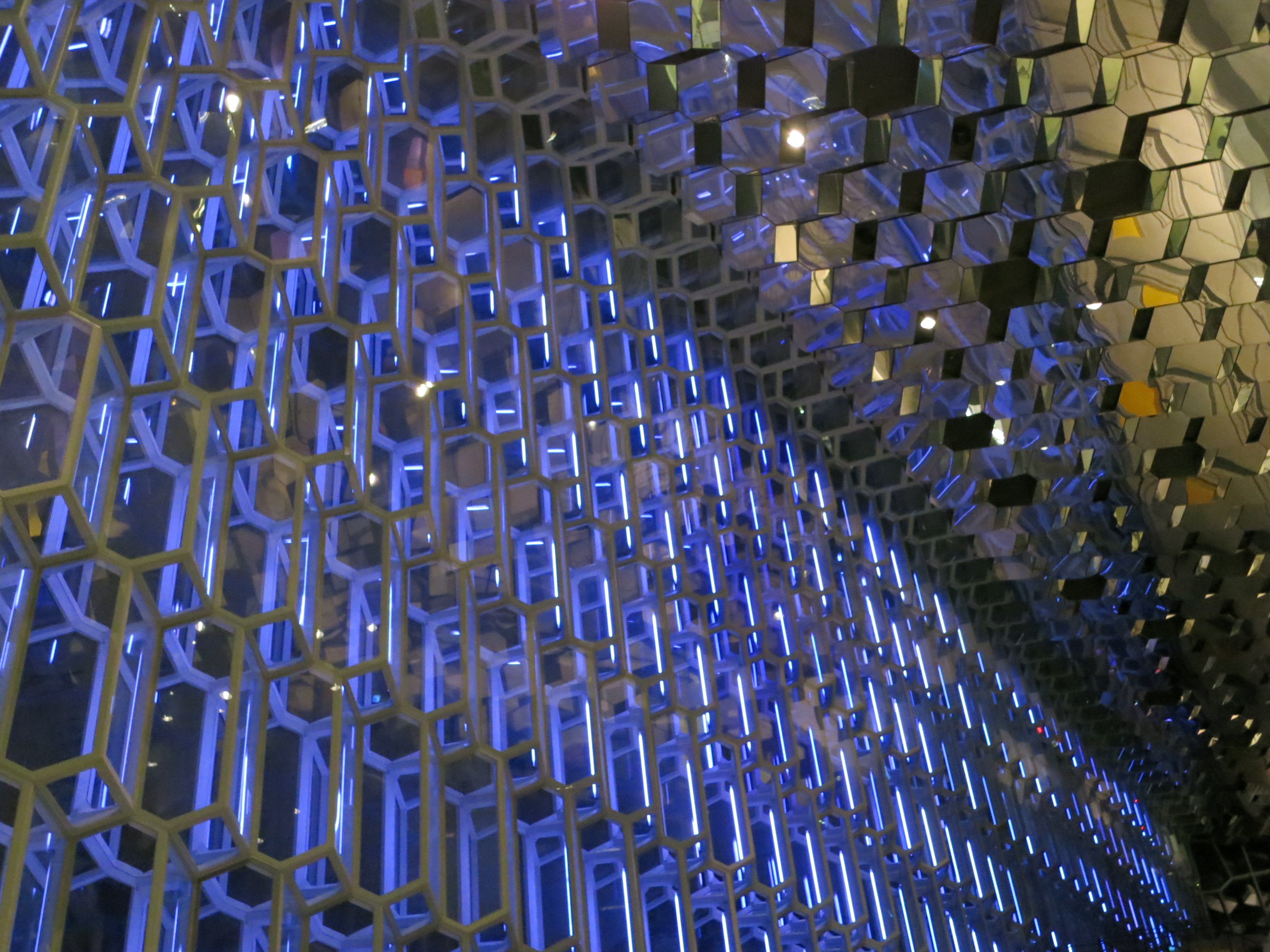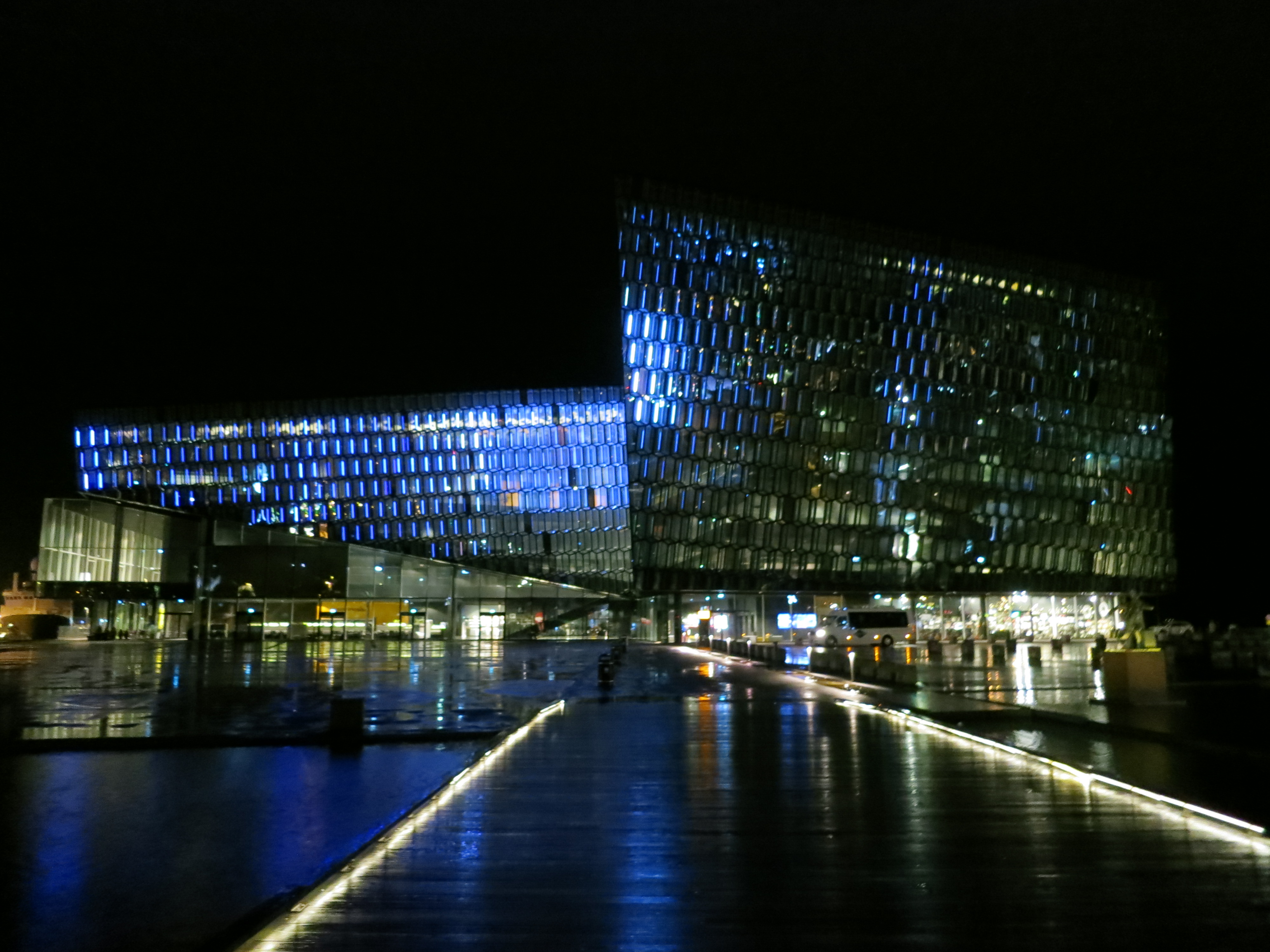 We went for dinner at 7:30 PM at Caruso, where we had a delicious Italian dinner to finish up the trip. There was a live guitar player serenading the diners, which was a nice touch. The ambience was very cozy, with lit candles on the tables and old wooden tables and chairs. After dinner we wandered around downtown; we walked over to the Harpa Concert Hall and took a quick walk through this fantastic structure. The design of the building was very interesting; there are geometric shapes everywhere. There was no performance going on, so the building was empty; luckily it was still open to the public so we were able to see some of the details up close.Stjórnarráðið (Iceland's Prime Minister's office) lit up at night