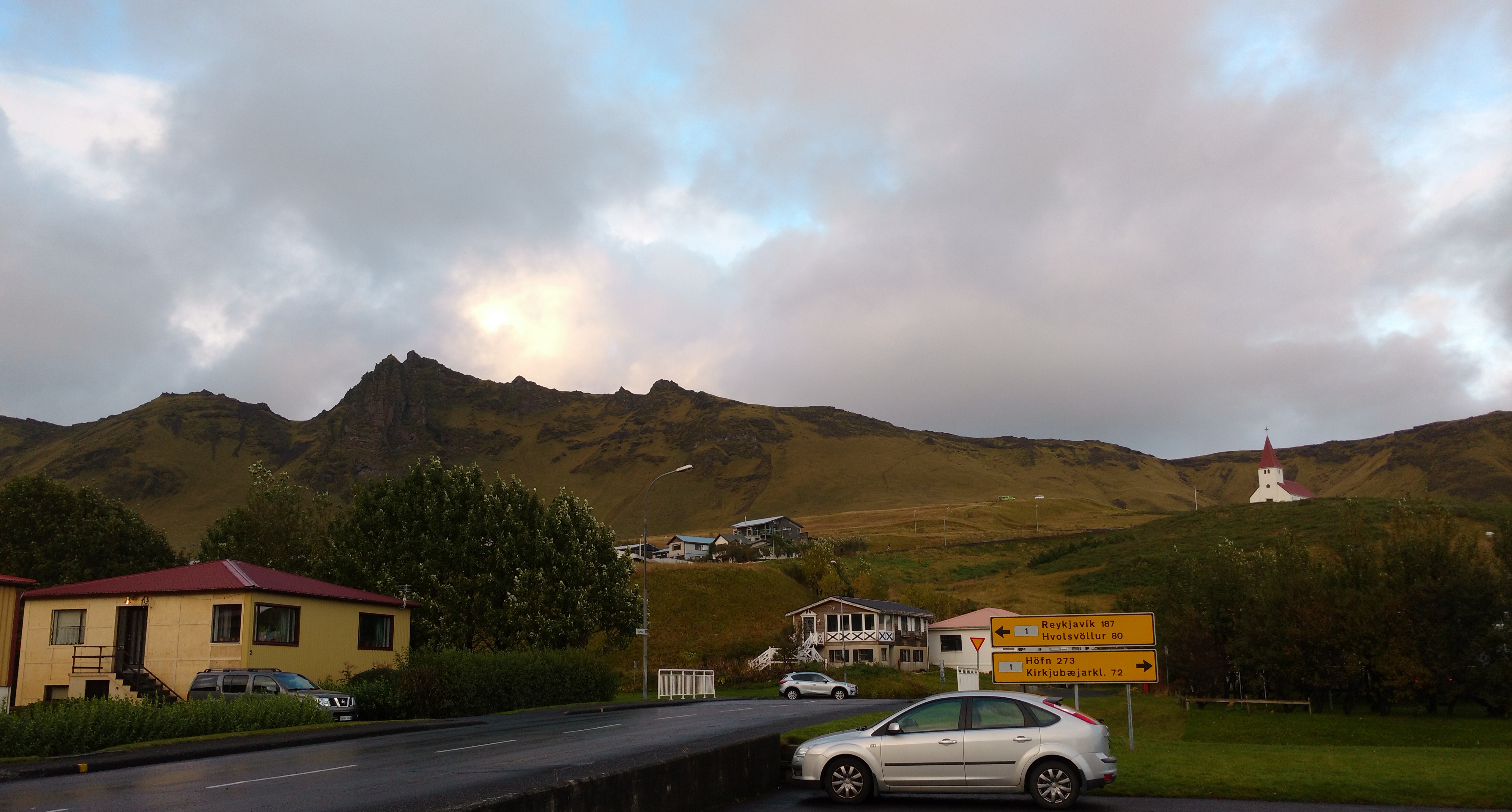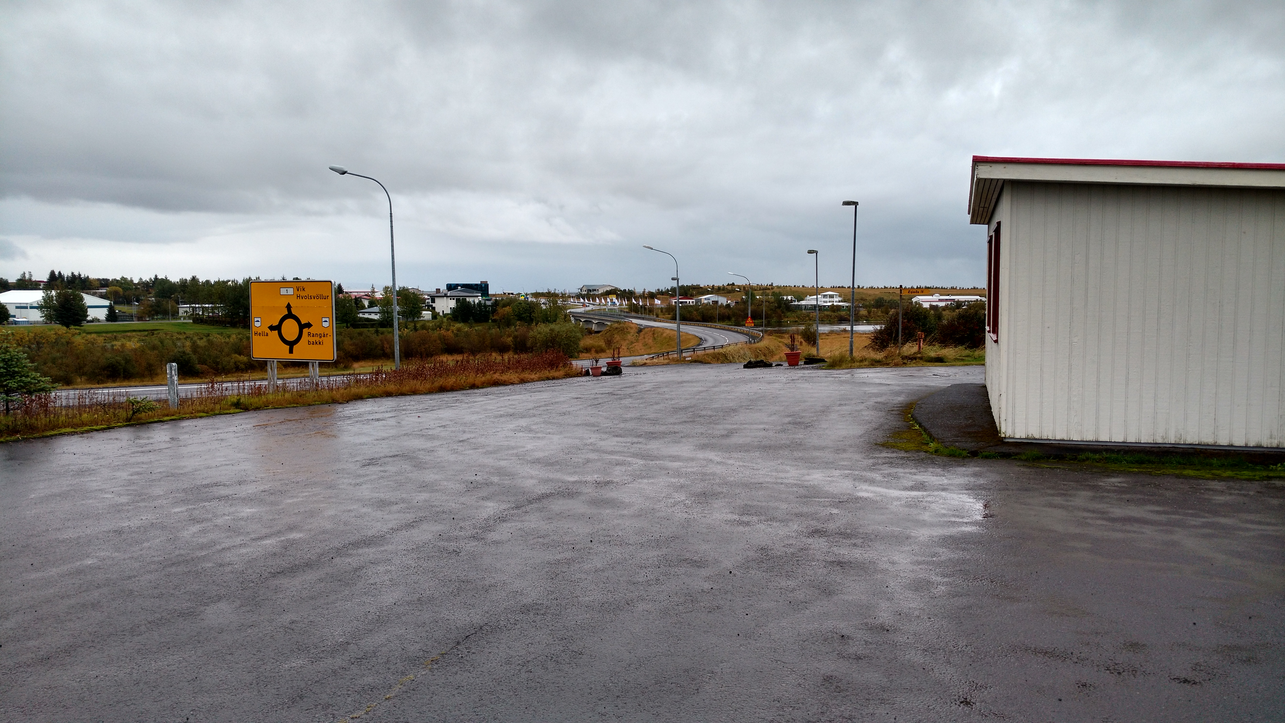 The town of Hella had a gas station right beside a small grocery store, so while Dave filled up the car the rest of us went inside and picked up some food for breakfast as well as some snacks for the road. We ended up eating a simple breakfast of pastries, yogurt, orange juice and bananas in front of the grocery store, then got into the car and started the day. It was overcast and slightly raining out, but the rain wasn’t hard enough to leave us wet.