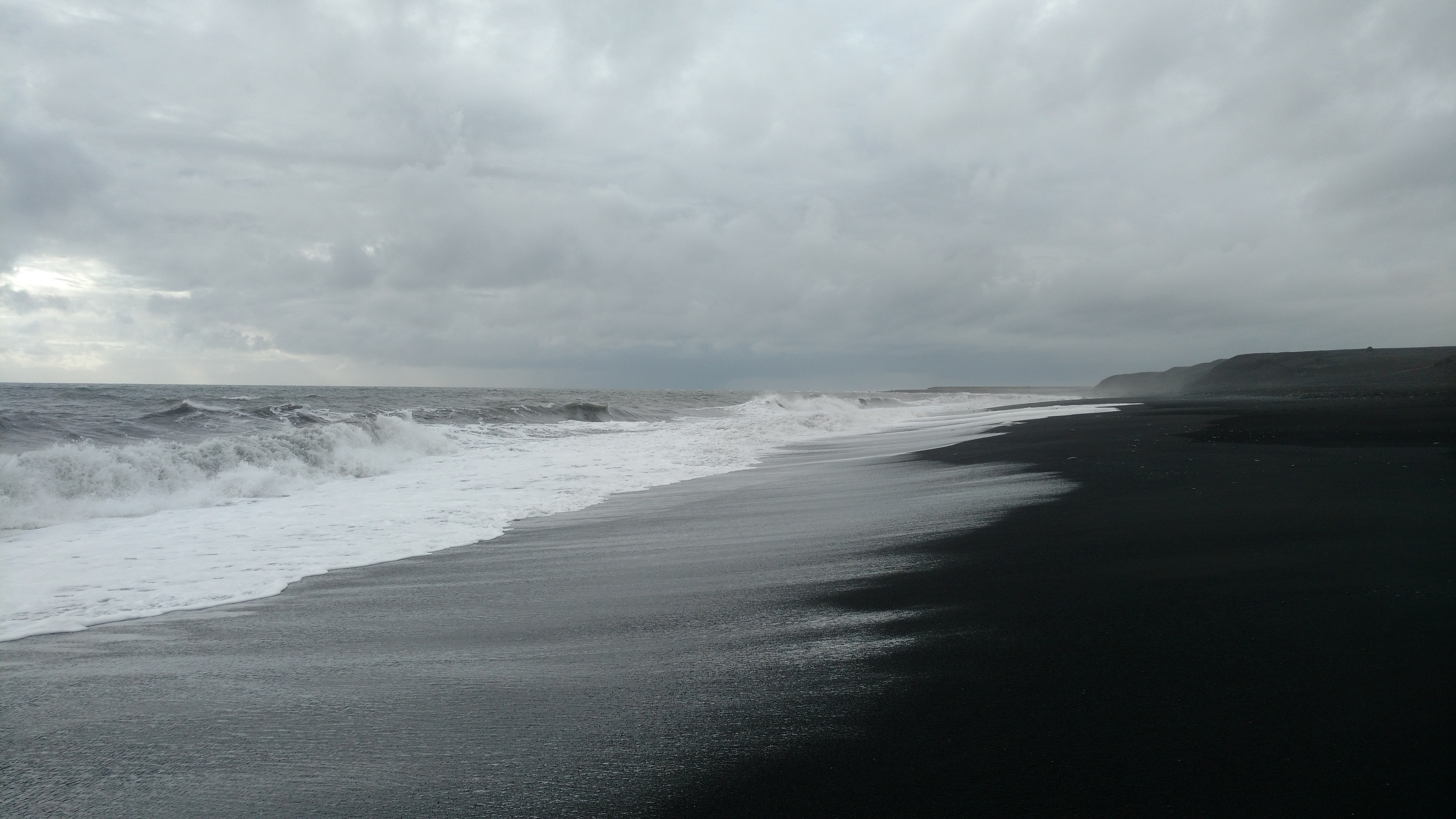 The black sand, the surf, and the sky