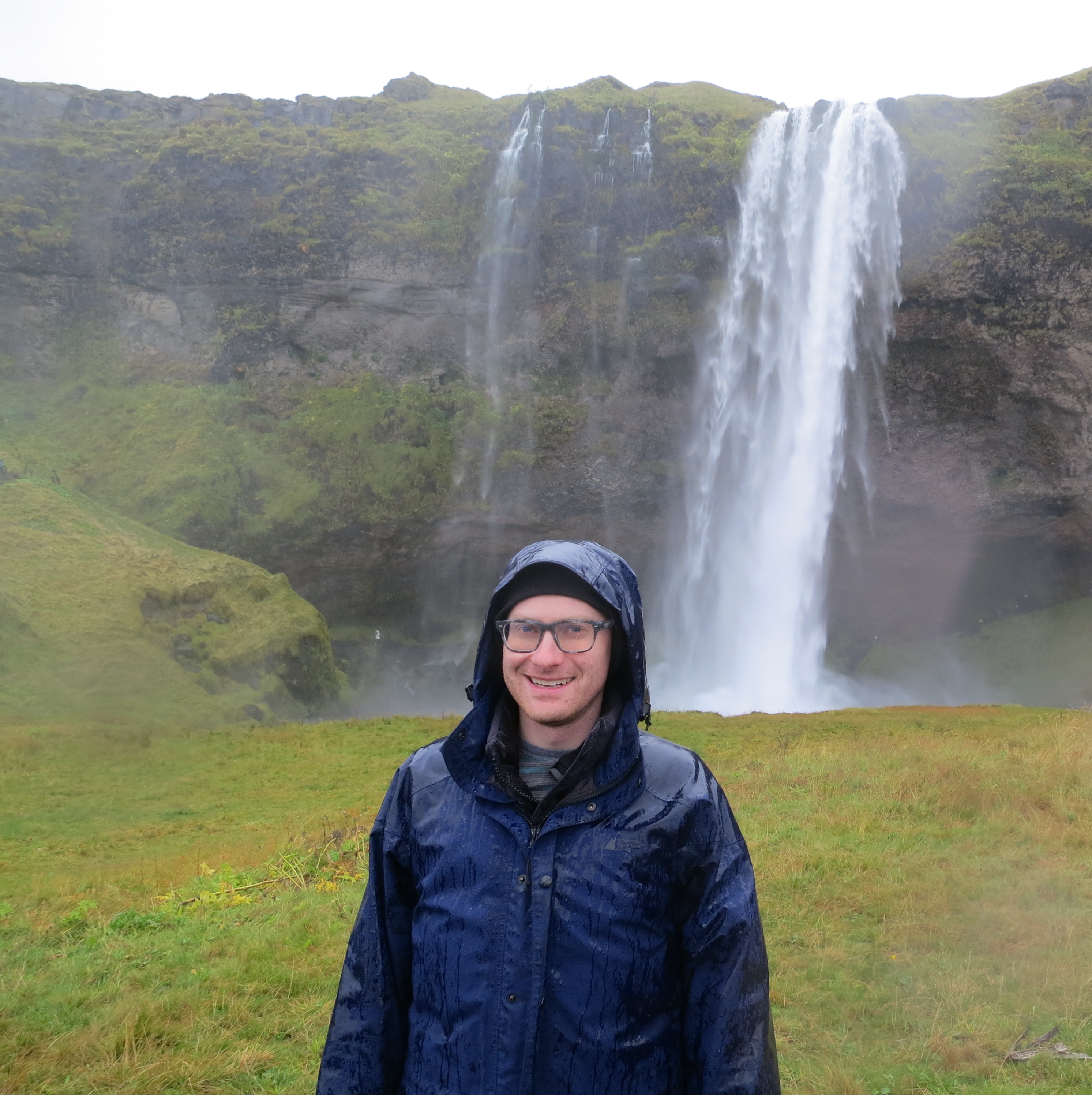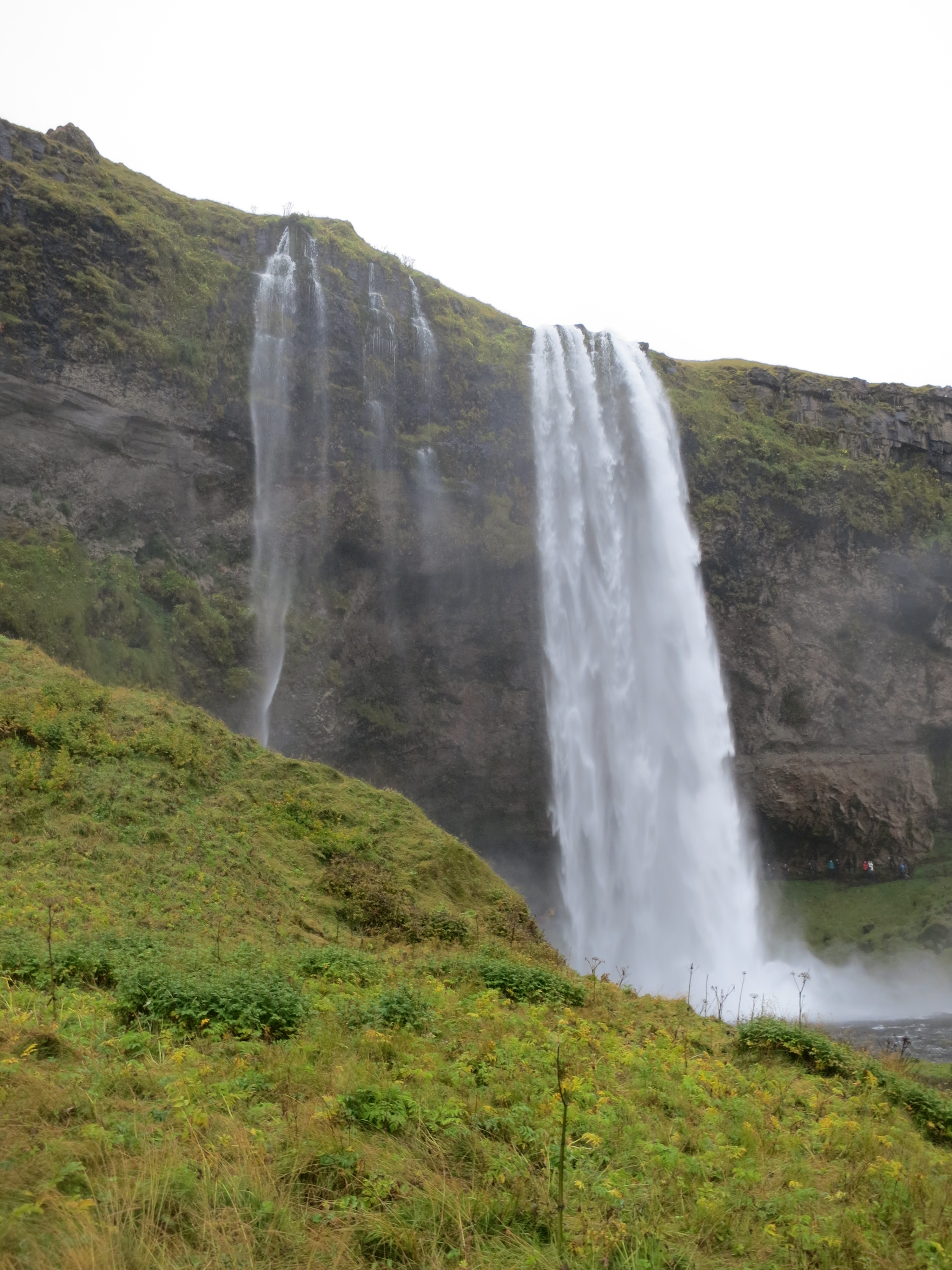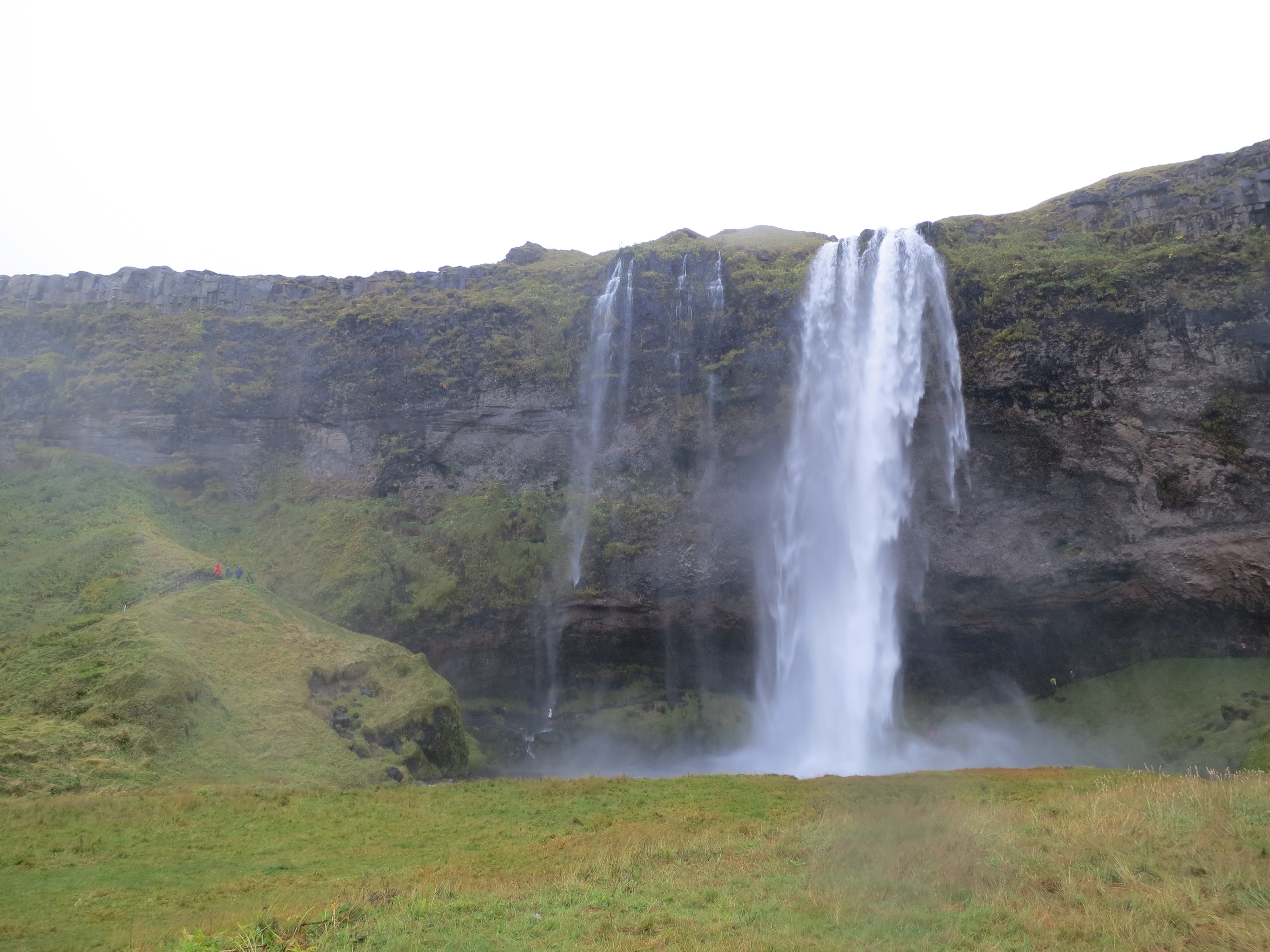 The first site we visited was the Seljalandsfoss waterfall, and it was only a 30 minute drive from Hella. This waterfall is unique due to the walking path which goes behind the waterfall, giving you a 360° perspective of the falls (and the opportunity to get wet from the spray). We got some good photos and enjoyed the walk around, however the rain was absolutely pouring down when we parked so everyone got super wet before we even got to see the waterfall. Normally they warn you that walking behind the waterfall may get you wet, however the rain was so heavy that by the time we got behind the waterfall we found that the cliff overhang provided us cover that kept us from getting much wetter. We got back in the car and quickly cranked the AC to help us start to dry off.Seljalandsfoss. The path is visible to the right