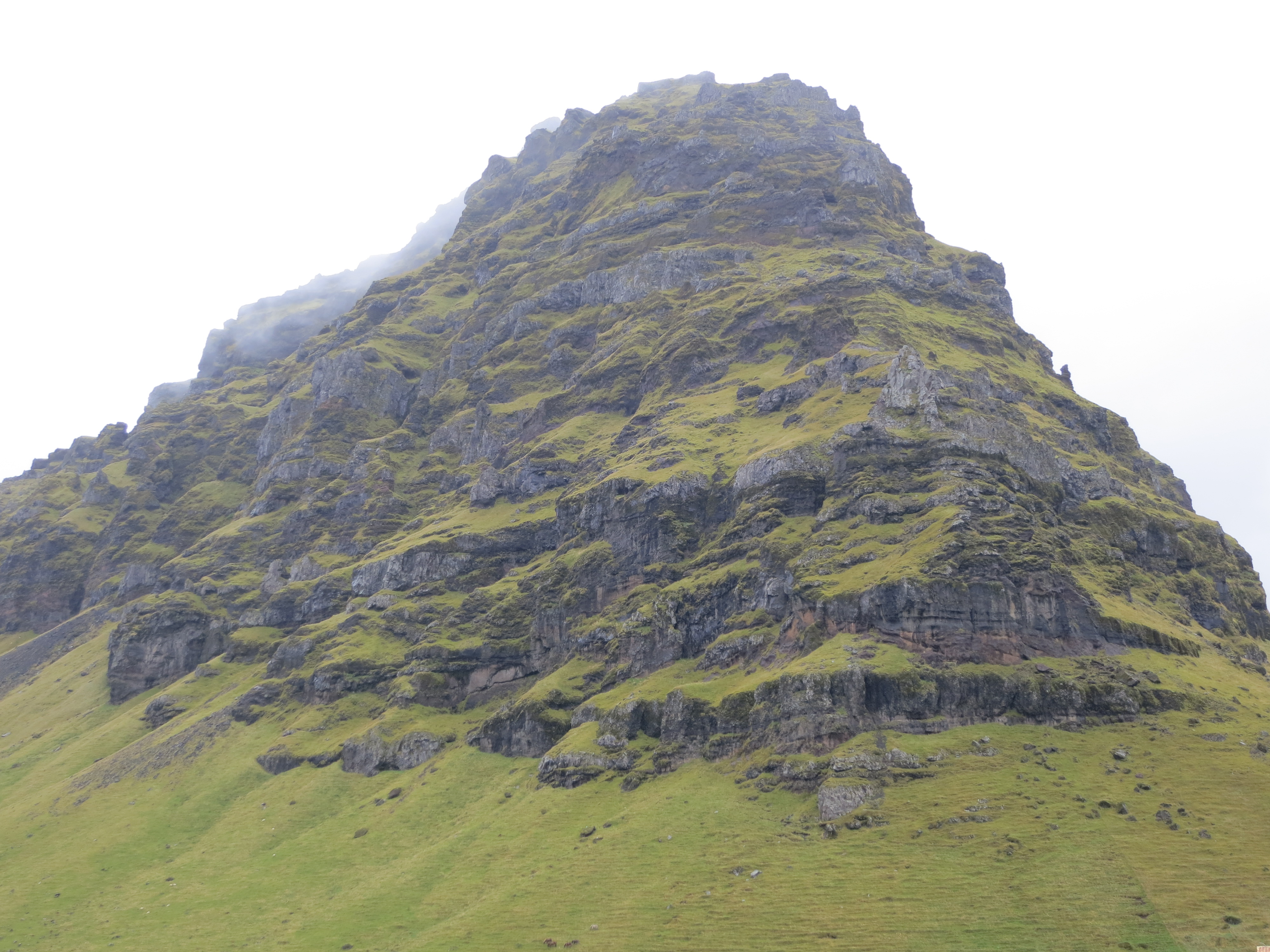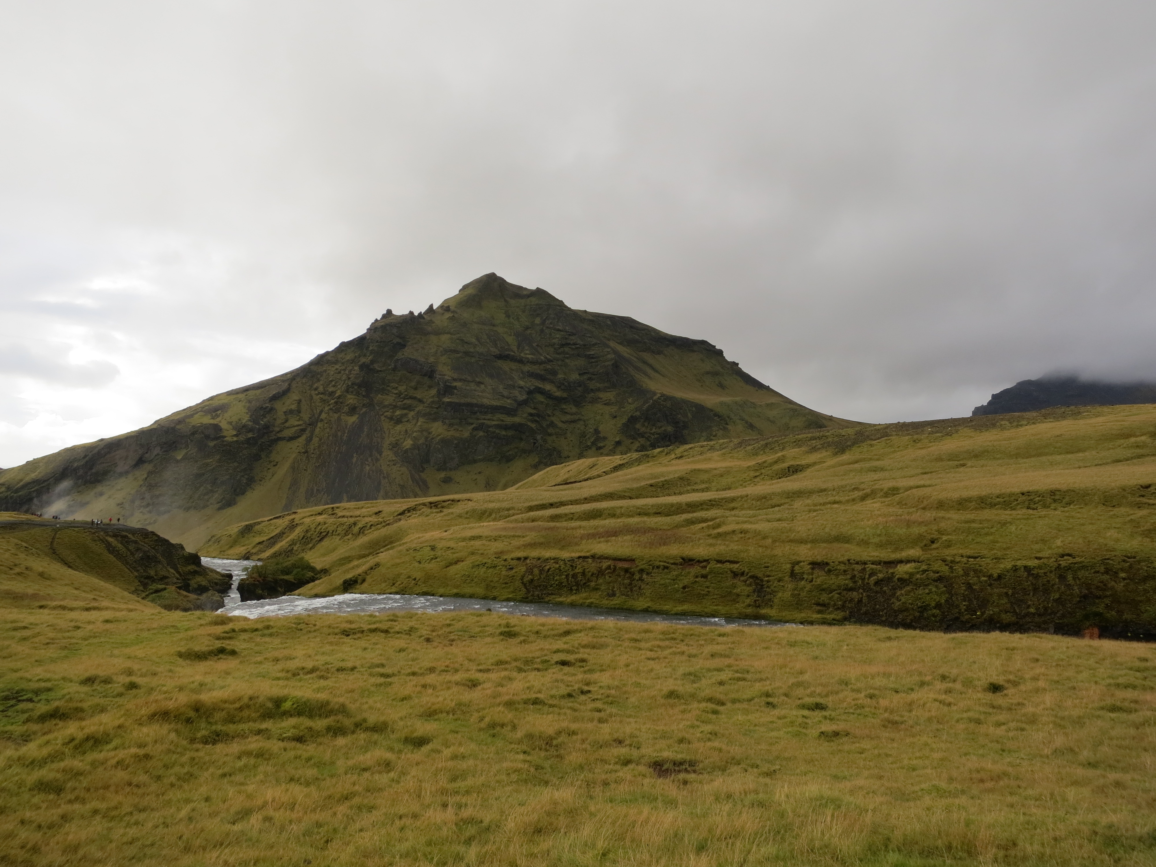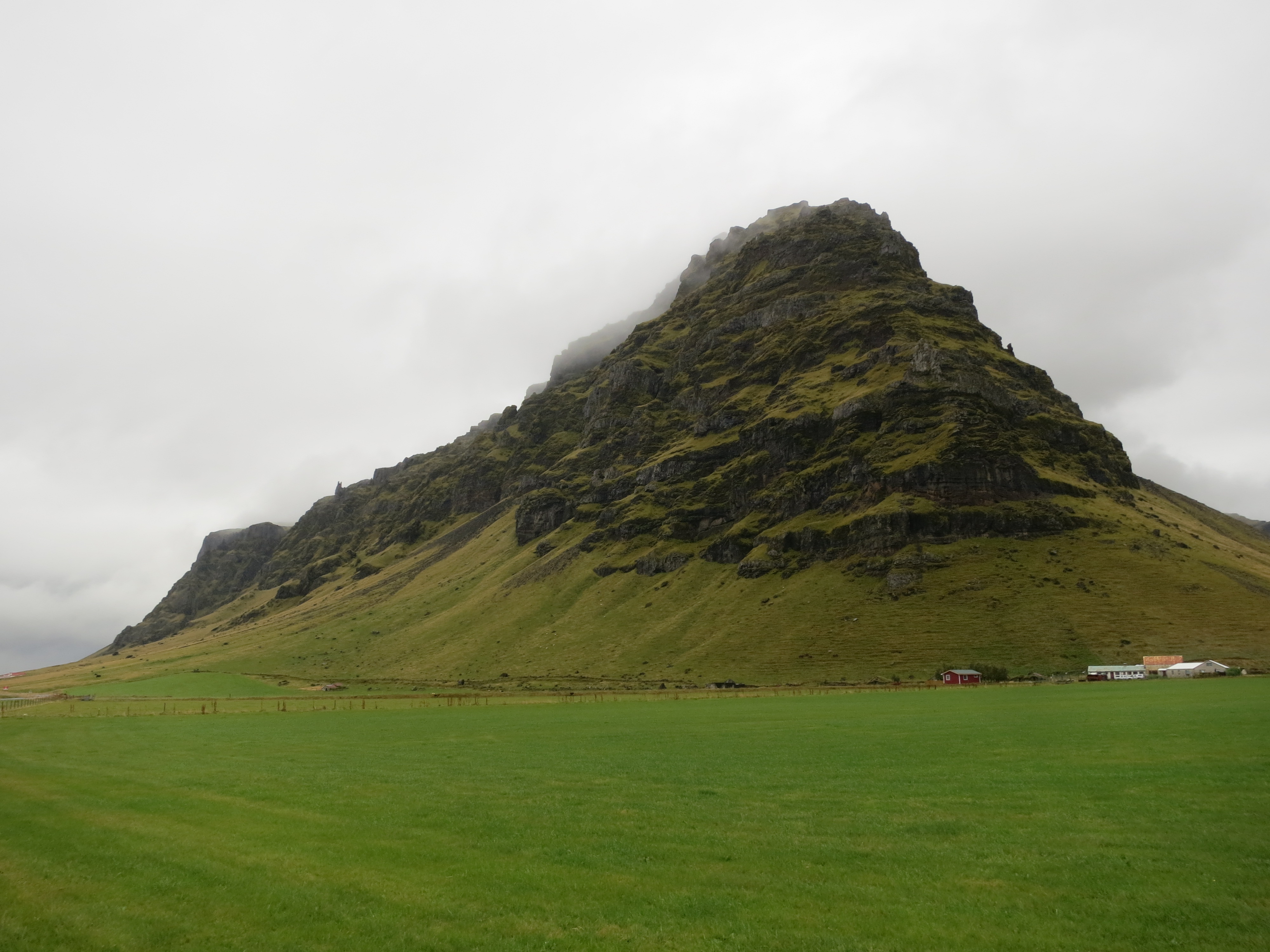 We continued driving along the ring road, Highway 1, and after a quick 20 minute drive found ourselves at the foot of the Eyjafjallajökull volcano. This volcano is notable in that it caused, during it’s 2010 eruption, an almost complete halt to air travel between North America and Europe due to the huge ash cloud it produced. There was a parking lot on the side of the road that allowed us to capture a few photos. The rain had stopped at this point, so we were able to stand outside and allow the breeze to help dry us off a bit as well. After about 15 minutes we packed back into the car and continued.The volcano