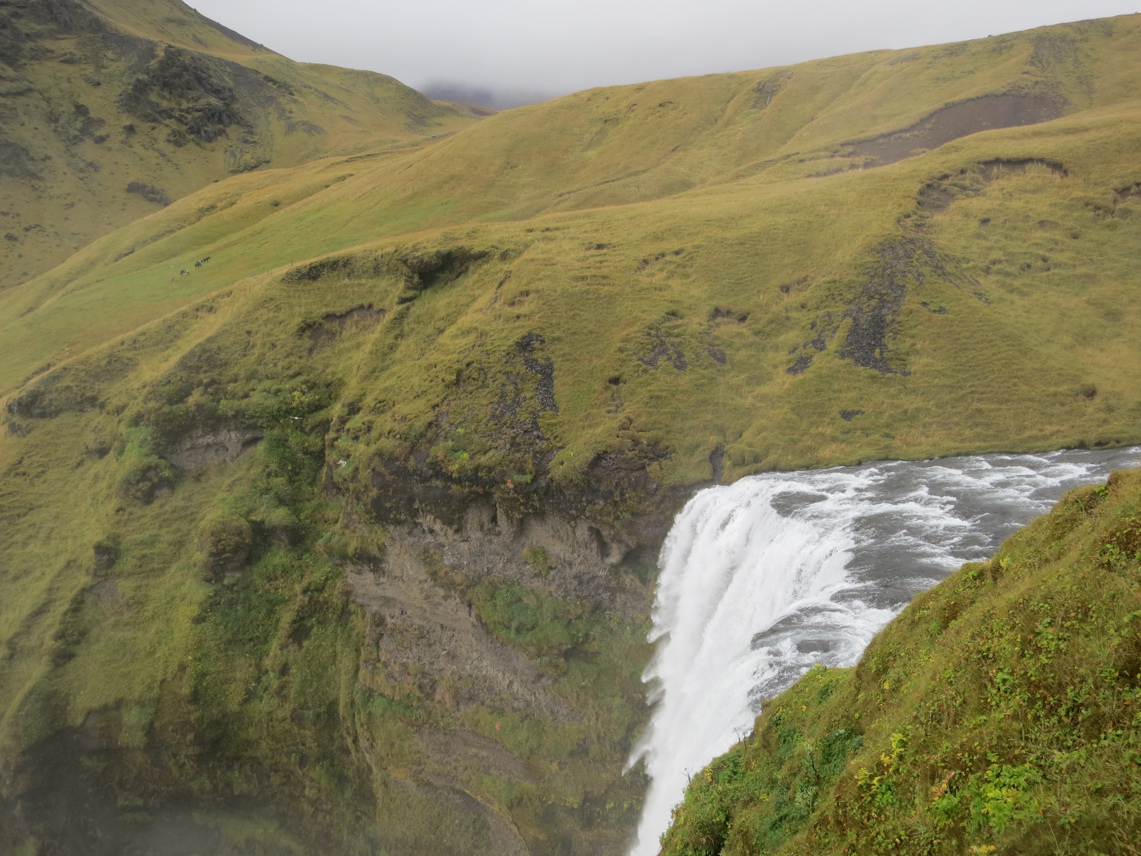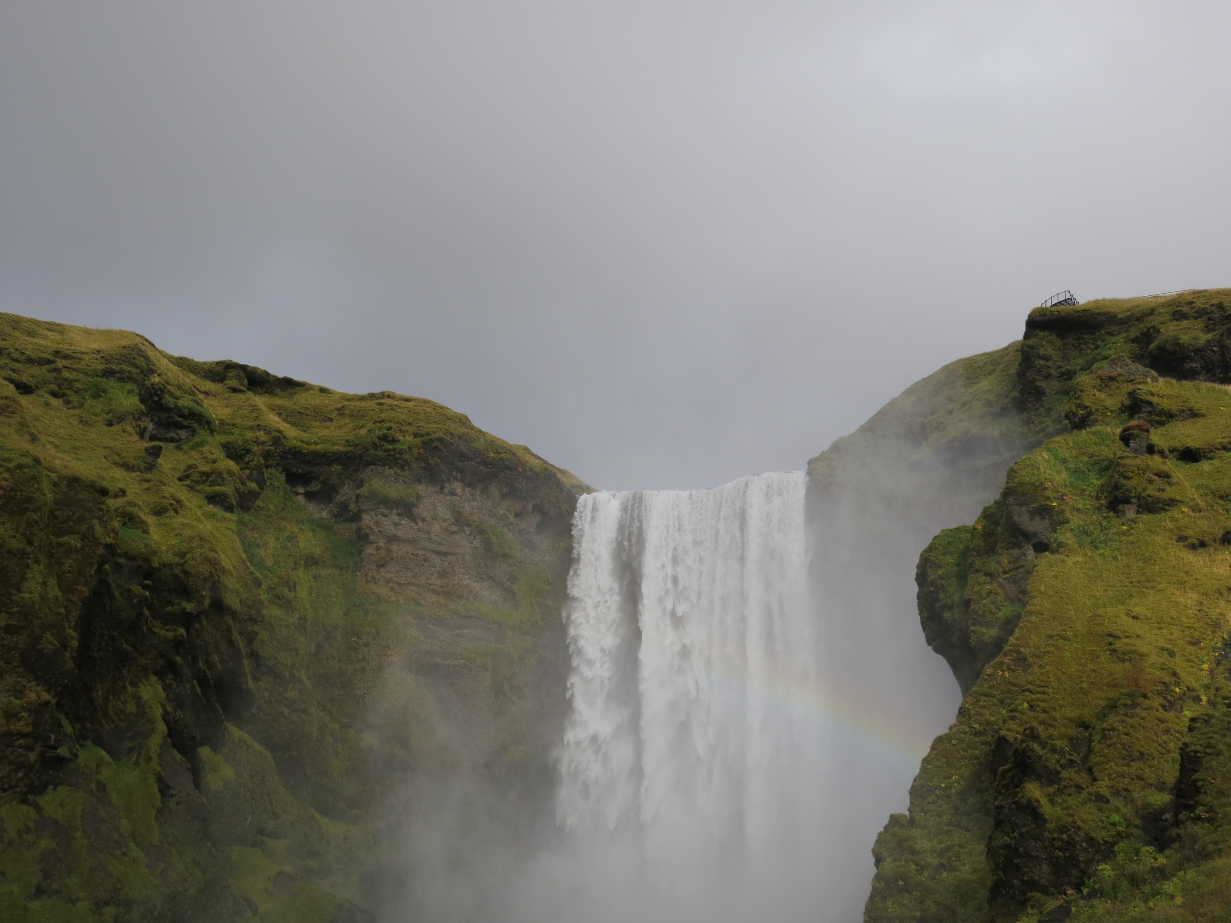 The next stop, the Skógafoss waterfall, was a short 15 minute drive along the ring road. We got out of the car to grey but dry skies, and started walking towards the waterfall, however the rain picked up just after we left the car, so we turned around and diverted to the visitor centre for a quick lunch. We had a small lunch in the visitor centre, and by the time we had finished eating the weather had cleared, and we continued our walk up to the waterfall. Instead of going to the base of the waterfall, we climbed a set of stairs to reach the top. This gave an impressive view both of the waterfall and of the coast, which was just a short distance away.Skógafoss from the base, with a rainbow on the right