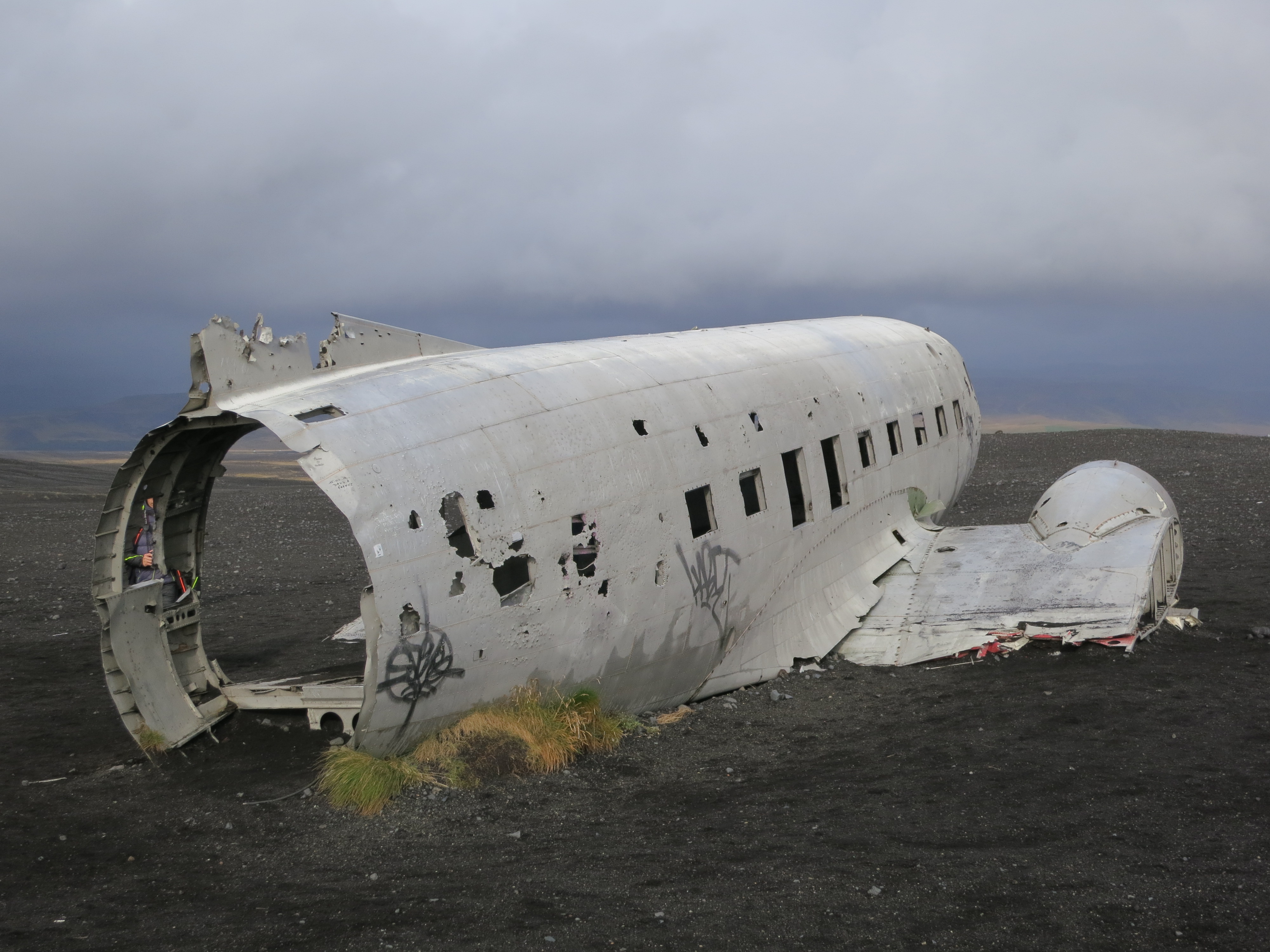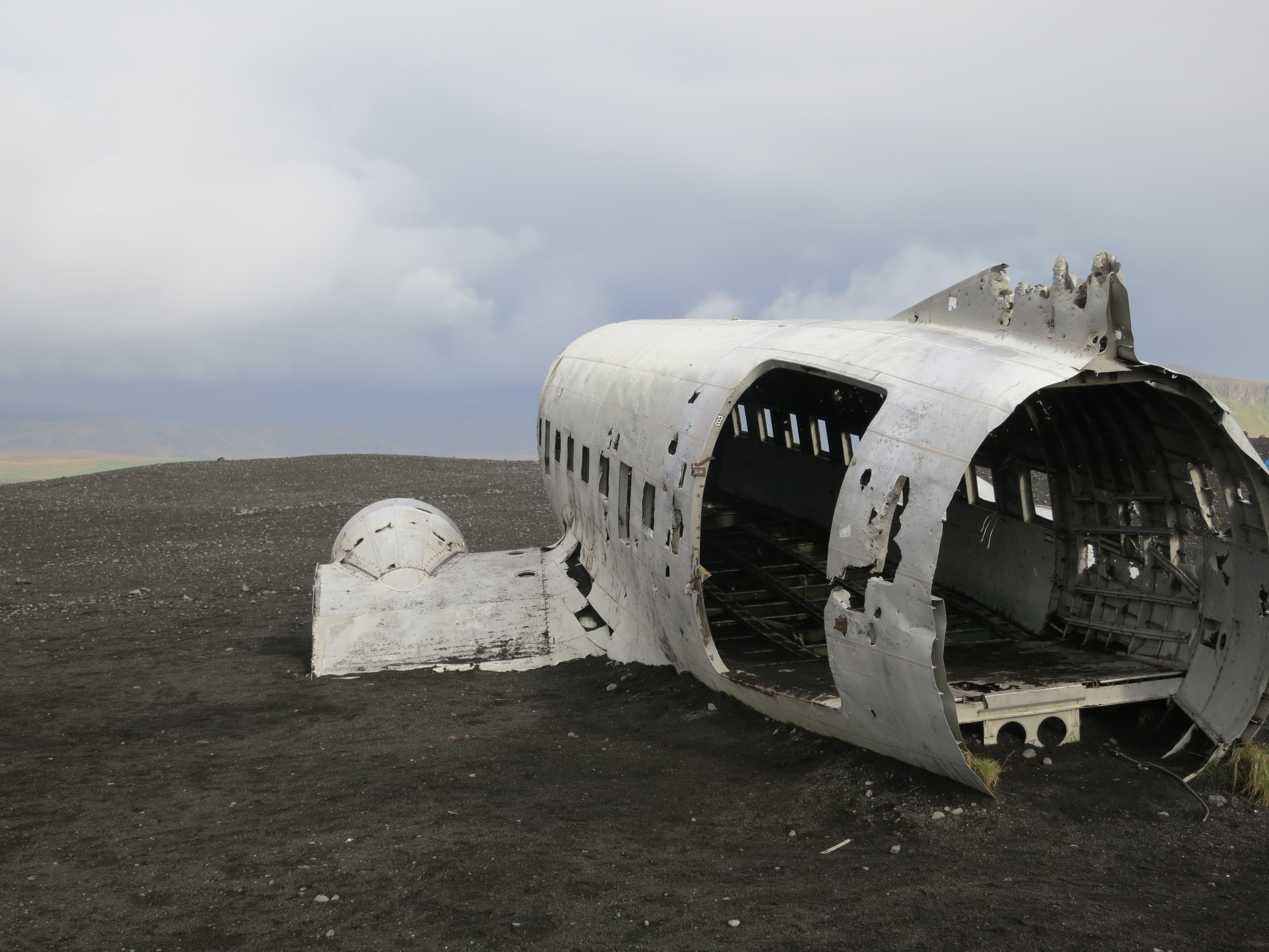 The trip continued along Highway 1 for another 10 minutes before we reached the parking lot of the Sólheimasandur plane wreck. In 1973, a U.S. Navy DC-3 crash-landed on the beach in Sólheimasandur. The crew survived, however the U.S. Navy chose not to recover the wreck, so it remains on a black sand beach not far from the water. The walk from the parking lot to the plane fuselage took just under an hour; after spending about 10 minutes taking photos of the wreck we walked to the ocean to touch the surf for ourselves. The walk to the plane was mostly uneventful, except for an intense 5 minute rainstorm which blew through. The walk back was similarly uneventful, except for a similar 3-minute rainstorm. Luckily it was quite windy, so by the time we had gotten back to the car we were mostly dry once again. Thick base layers and a good waterproof shell on the torso were key - our legs were able to dry and we didn’t find ourselves getting cold since our core didn’t get wet.The walk to the beach was pretty barren