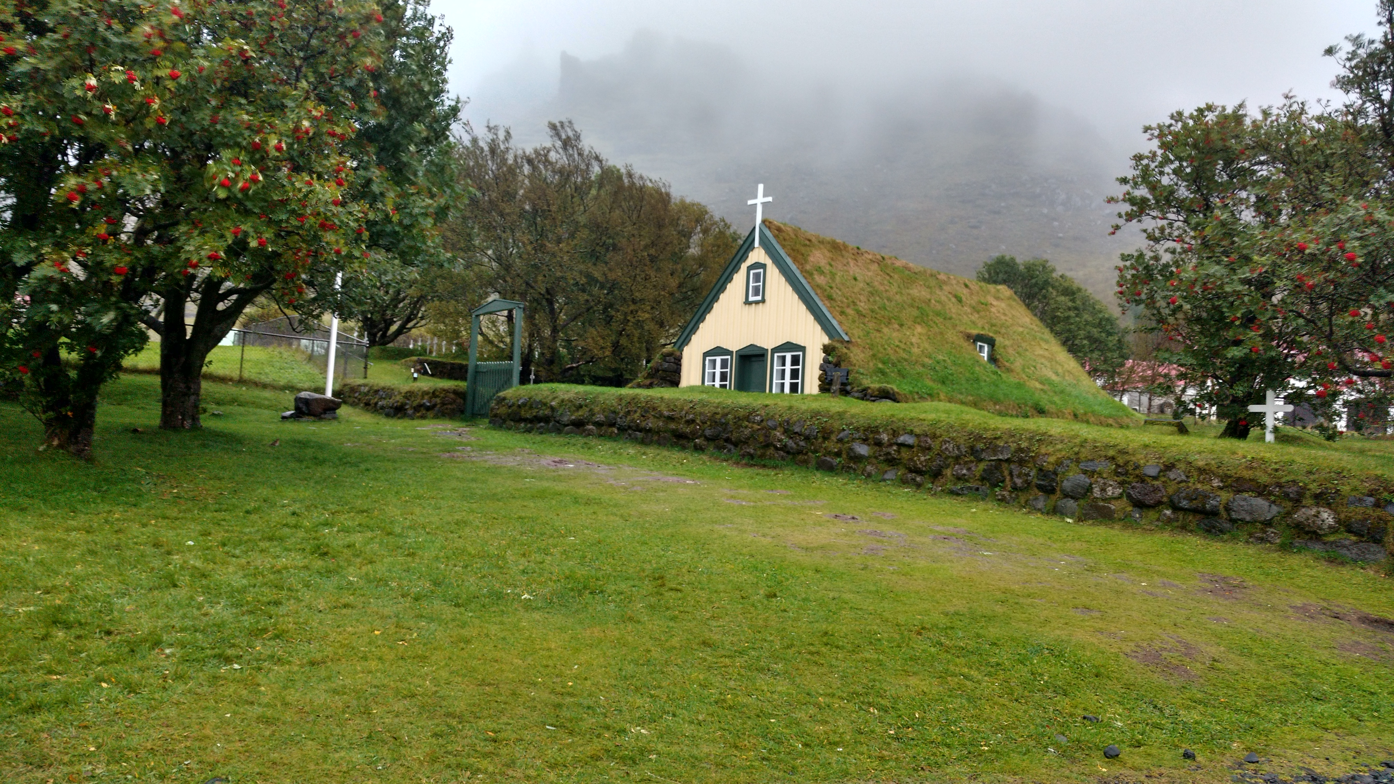 We continued driving, and passed the Hofskirkja turf church. We took a few photos, however it was still raining so we chose not to get out. It was neat to see, but hardly a destination to visit.