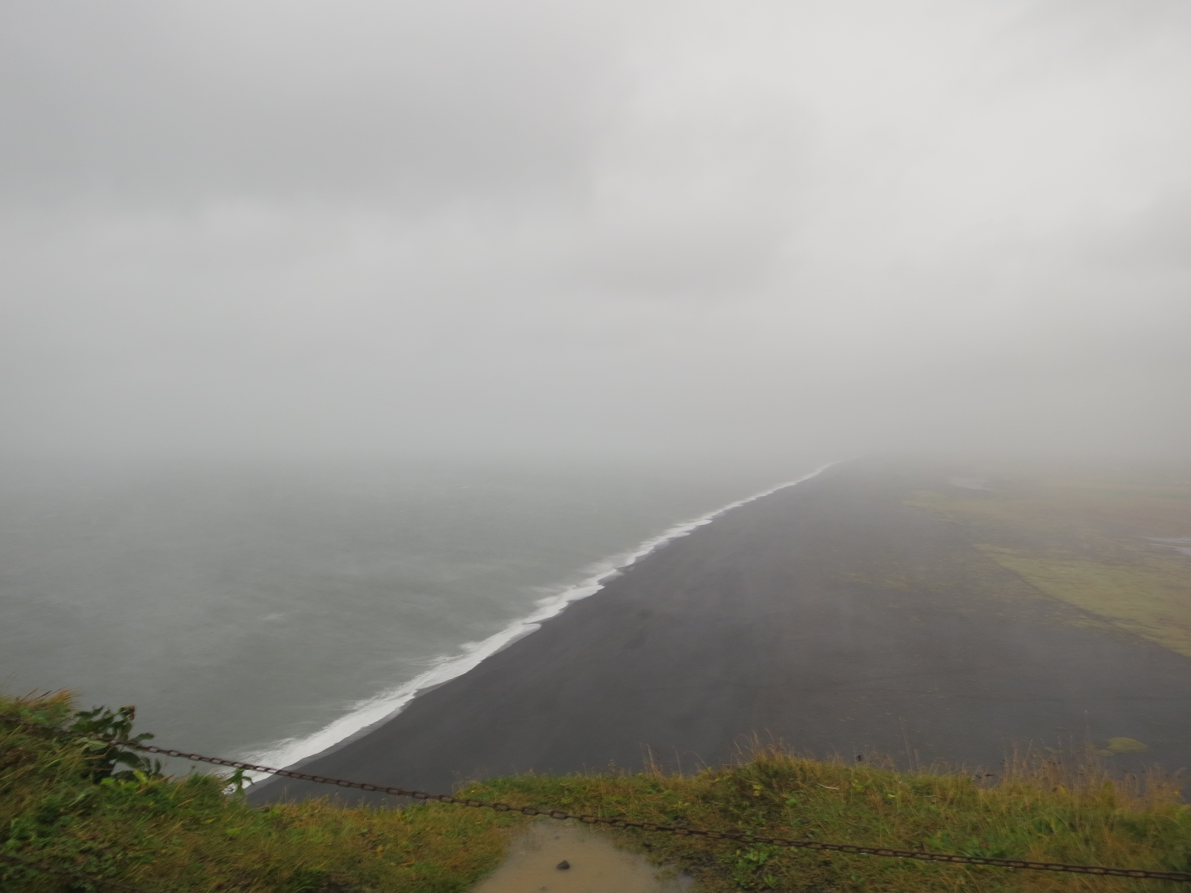 Our first stop was not far from the guesthouse, however the heavy winds slowed down our progress. We drove up to the Dyrhólaey lighthouse, which involved carefully navigating a windy single car-width road in the rain and blowing wind. Once we parked, we struggled to open the doors due to the strength of the winds. I parked the car facing into the wind to help avoid damage to the door, however that made opening the doors a very challenging exercise. After leaving the vehicle, we quickly made our way towards the lighthouse since the rain was coming down very hard. We got some really cool views of the beach down the coast, however the wind made it pretty difficult to stand upright so we didn’t walk all the way to the lighthouse. We turned around and made our way back to the car, and got in giggling from the adrenaline rush that came associated with being high up during heavy winds. In total we were perhaps out of the car for 4 minutes, however we were completely drenched (even while wearing waterproof clothing). We cranked the defrost in the car and started driving down the hill to get back to the ring road.Looking down towards the beach. The chain wouldn't have helped.