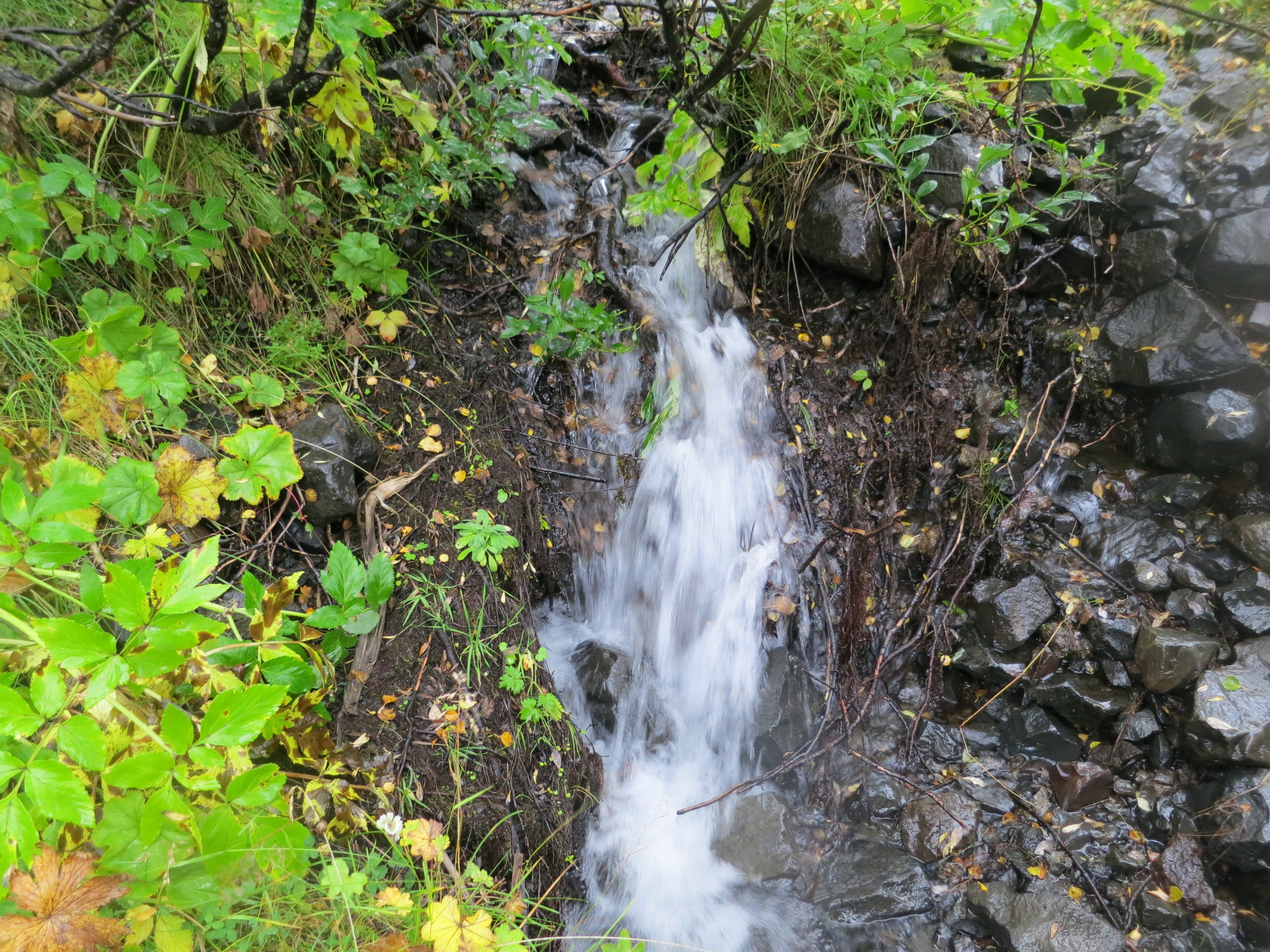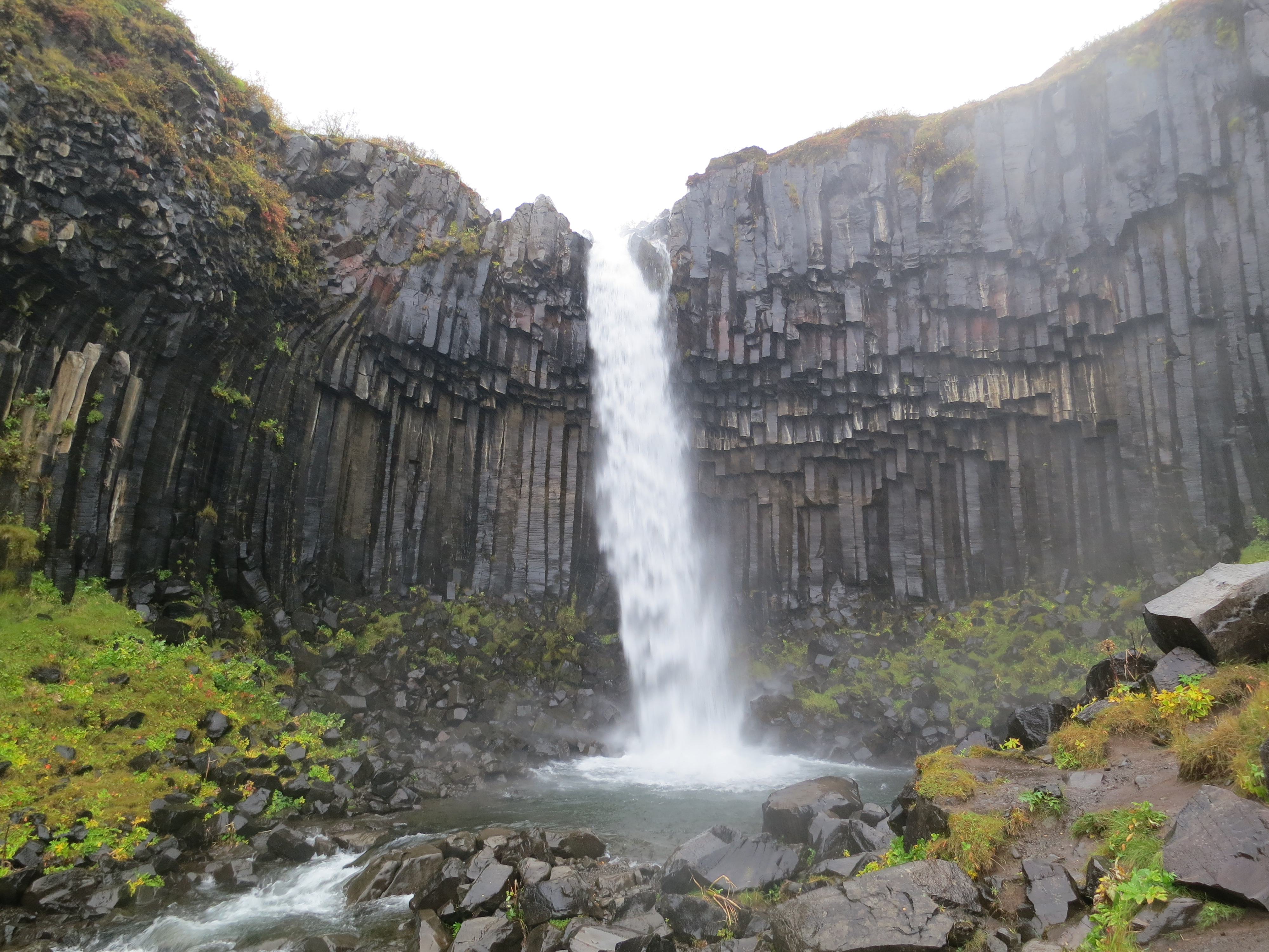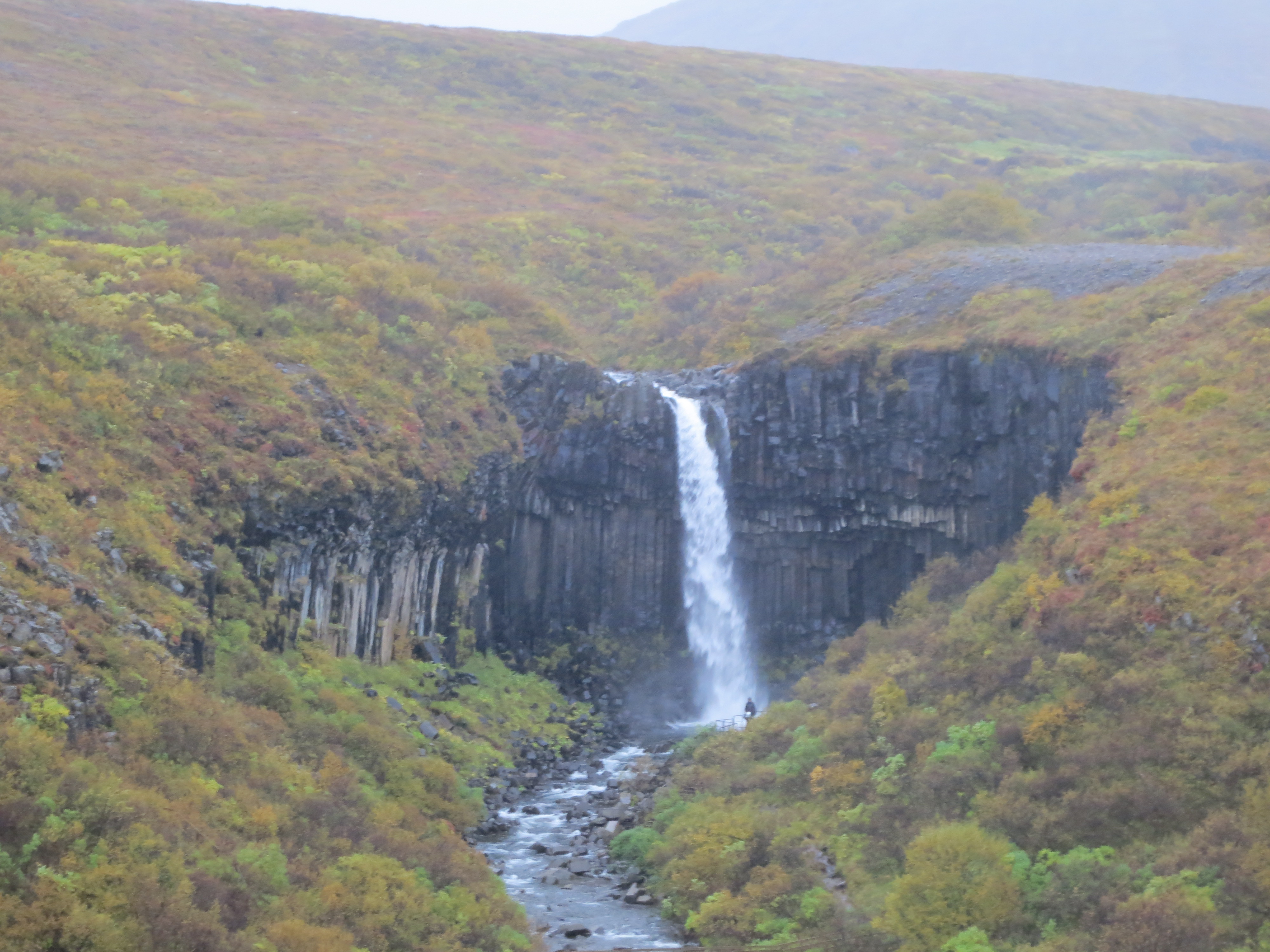 The drive continued for another hour, before we pulled into the parking lot of the Vatnajökull national park. Here we had a quick lunch in the cafeteria, and quickly exchanged some of our clothes for drier options. I changed my wool socks, as they had become drenched. My boots were doing a fine job keeping water out, however my socks absorbed the water dripping off my pants while I drove. I decided not to change into dry pants since I knew they were only going to get wet again. Once in slightly drier clothing, we began a hike to the Svartifoss waterfall. The hike was about 2.5 km in each direction, but with the rain slowing progress it ended up taking us just over an hour to complete the hike. Svartifoss was impressive to see up close; the rock surrounding the waterfall is a series of columnar basalt columns which give it a very distinct look. Apparently this structure was one of the inspirations for the Hallgrímskirkja church we previously saw in Reykjavík. By the time we finished the hike we were all dripping wet; and most decided to change once again into dry clothes. I wasn’t cold, just uncomfortable, so I chose to keep the clothes I had on and push onwards.A river along the way