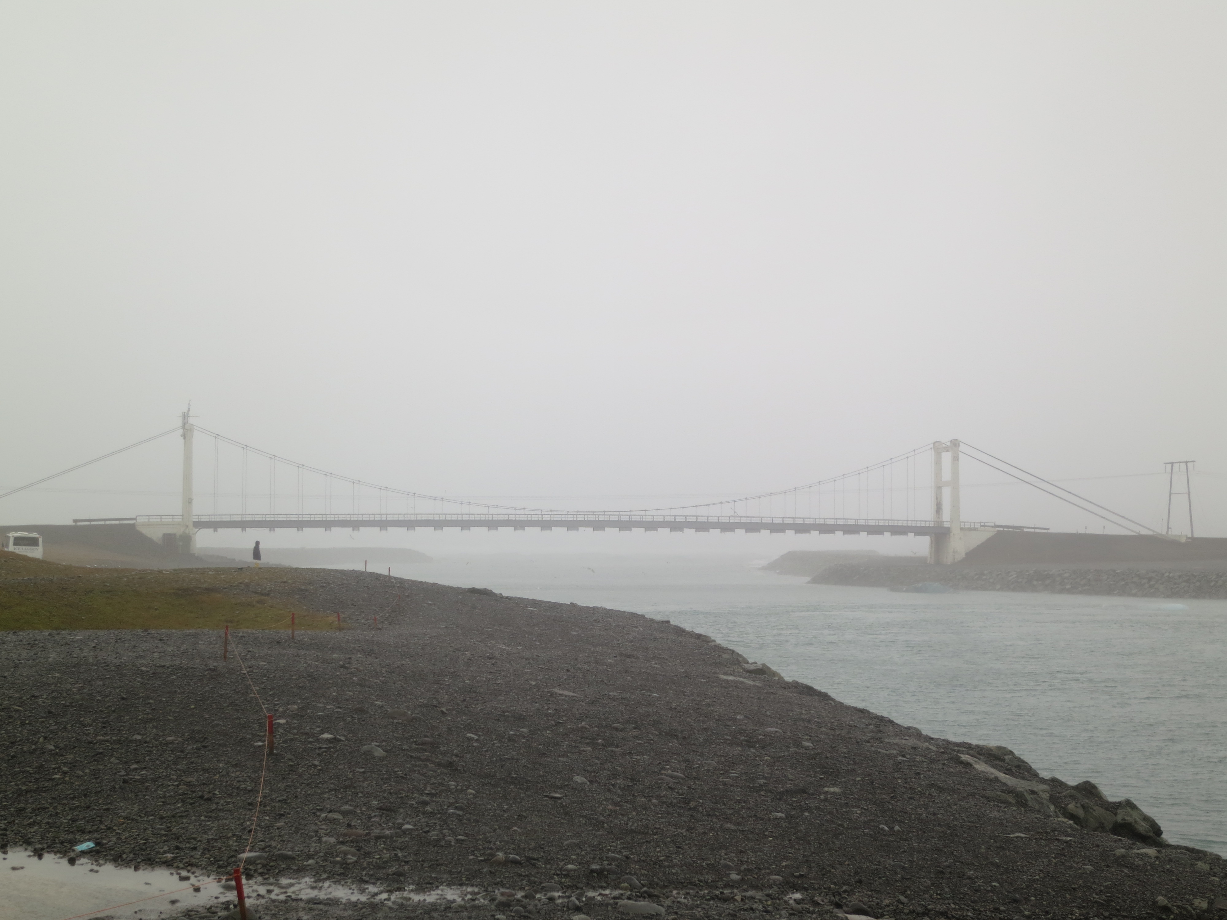 Behind the bridge is the ocean; the icebergs use this river to leave the island