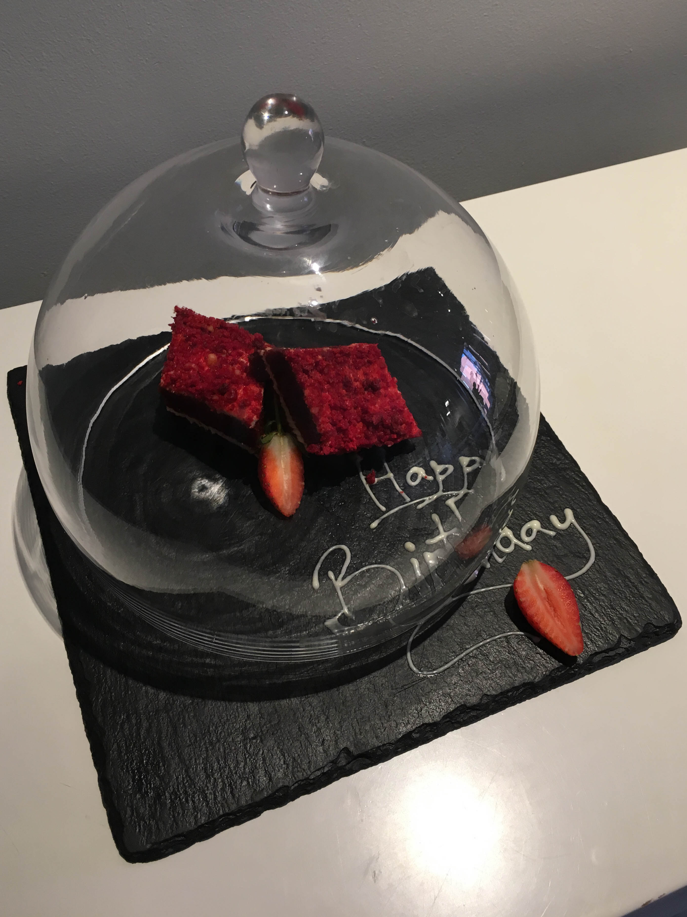 The visit to the apartheid museum lasted for two hours, and shortly before 14:30 we got back onto the bus for the last time. The bus took us back to the hotel, dropping us off around 15:00. We had a bit of time before dinner, so we had a cocktail with the friends we had made on the trip. We spent an hour or so in the hotel bar, after which we returned to our hotel room. We discovered that Belinda had two pieces of red velvet cake delivered to the room with birthday wishes written in icing on the plate. It was a very thoughtful gesture! We packed, then went to a final dinner with the entire tour group at 18:30.