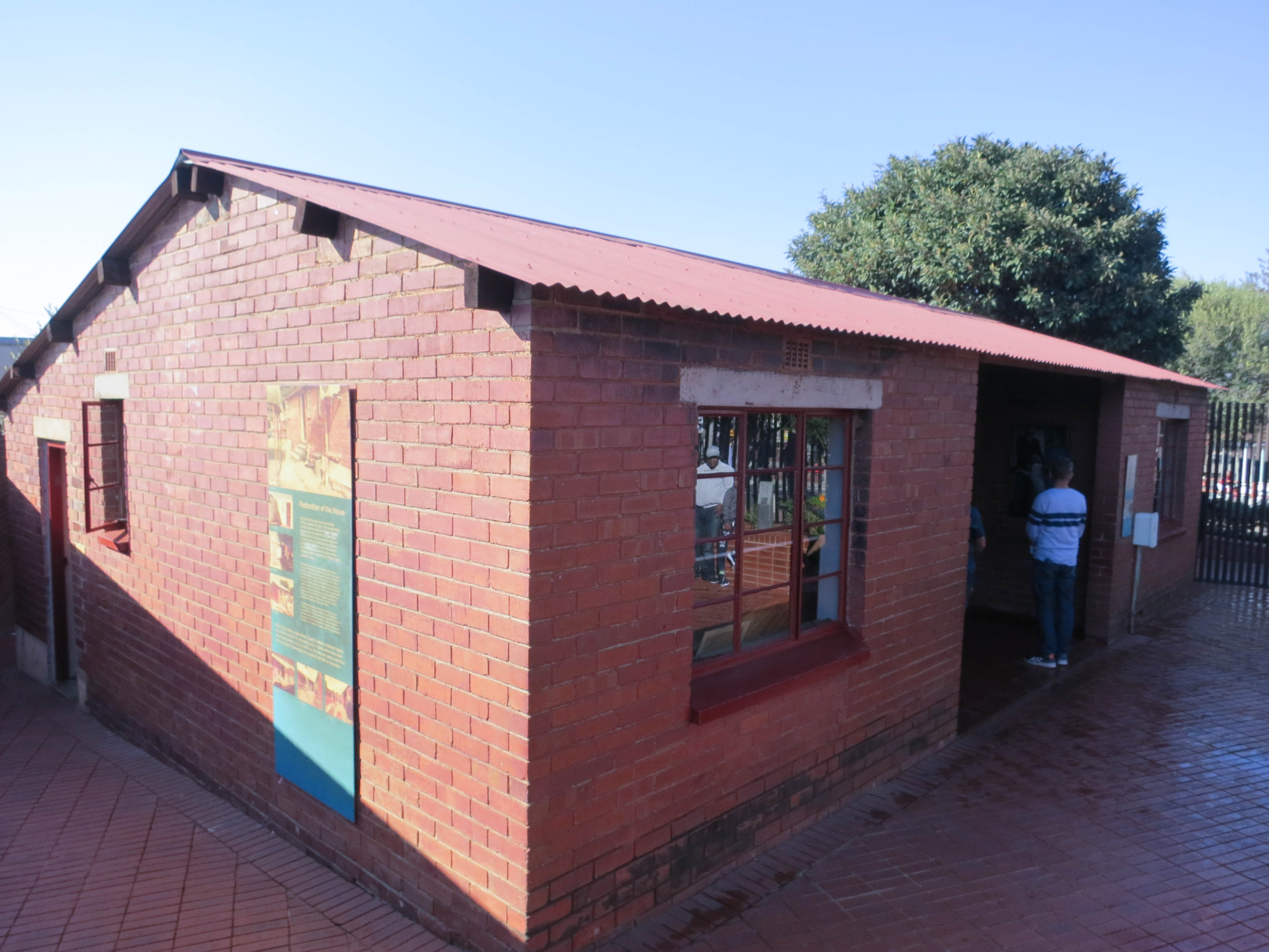 The bus left the hotel and drove to the township of Soweto, which was in the southwest of the city. The name is an abbreviation of the ‘South Western Townships’, and during apartheid it was one of the major districts that black families were forced to live in after being forced out of Johannesburg. WE took the M1 highways south, passing a large amusement park named Gold Reef City. There were a number of gold mines in the region between Johannesburg and Soweto, and you can still see the tailing piles as you drive through the city. Once we were in Soweto the bus took a road through a residential neighbourhood, in order to show us the different types of accommodations people were living in. There were still communal housing structures built during apartheid being lived in, but there were also a lot of more typical houses all packed together. The bus pulled back onto the M68 highway, then drove past the Chris Hani-Baragwanath Hospital, a large hospital in Soweto that was only able to treat black patients during the apartheid regime. We continued on driving past the Orlando towers, a pair of cooling towers from a decommissioned coal power plant in the neighbourhood. Today, these cooling towers are colourfully decorated, and are the site of a bungee jumping business. Shortly afterwards the bus stopped, letting us off in front of the house that Nelson Mandela lived in prior to his imprisonment. The house has been converted into a small museum that focused on his and his second wife’s life in the house. We spent about a half hour learning more about the Mandela’s before continuing on.