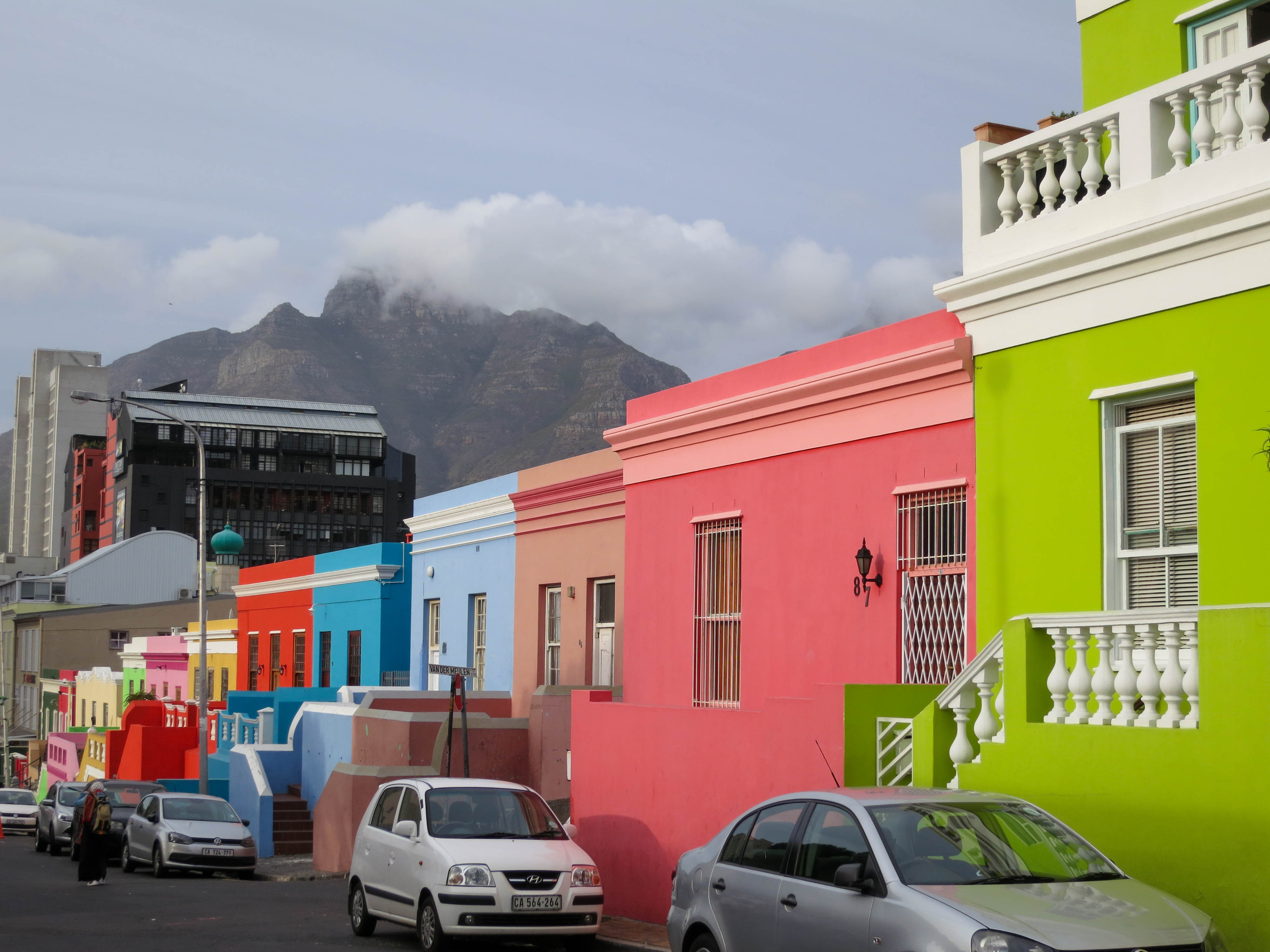 Several of the colourful houses in the Bo-Kaap neighbourhood with Table Mountain in the background