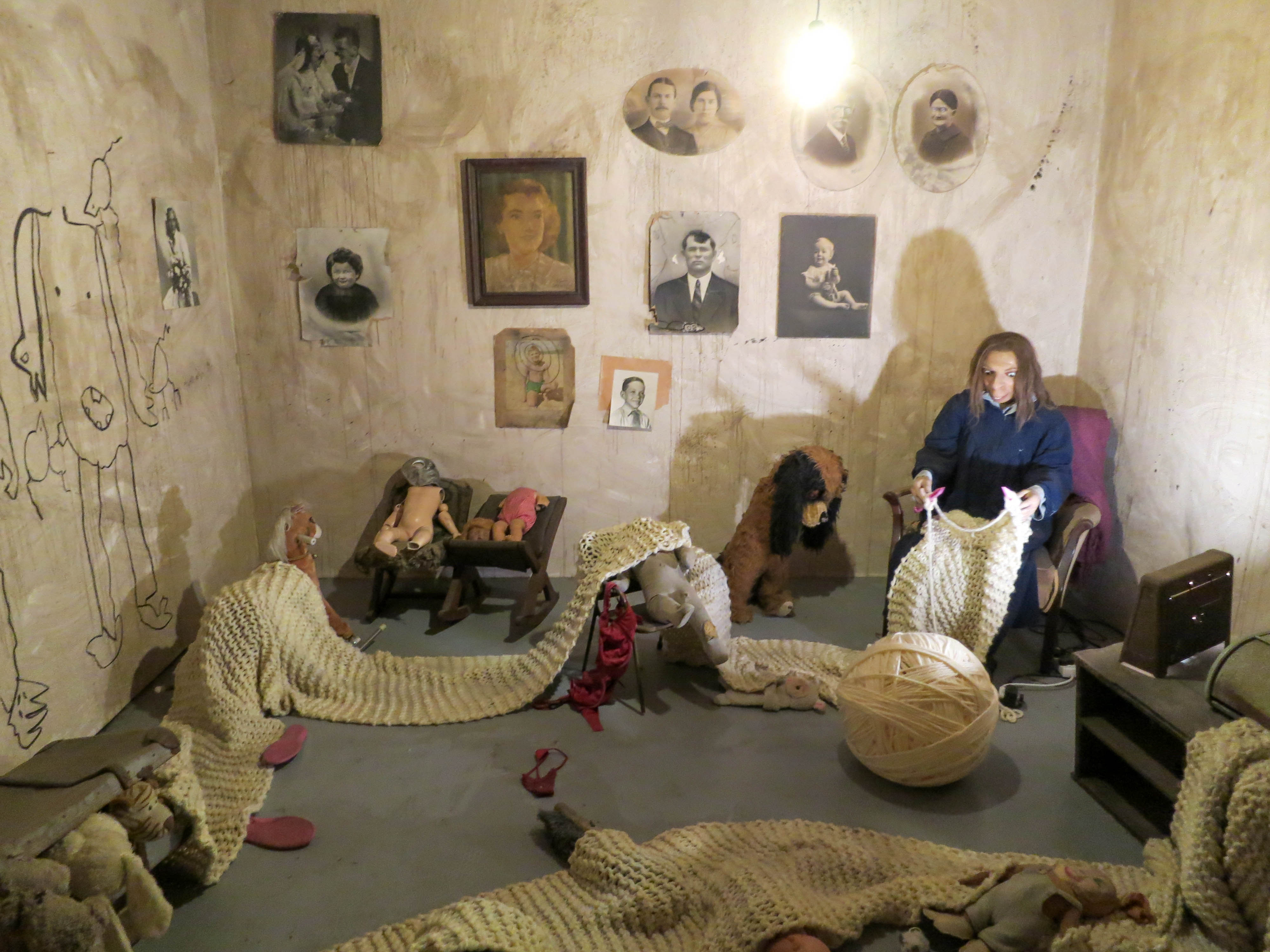 One art installation had several rooms with these creepy characters. The scarf being knit followed us through the rooms in the installation.