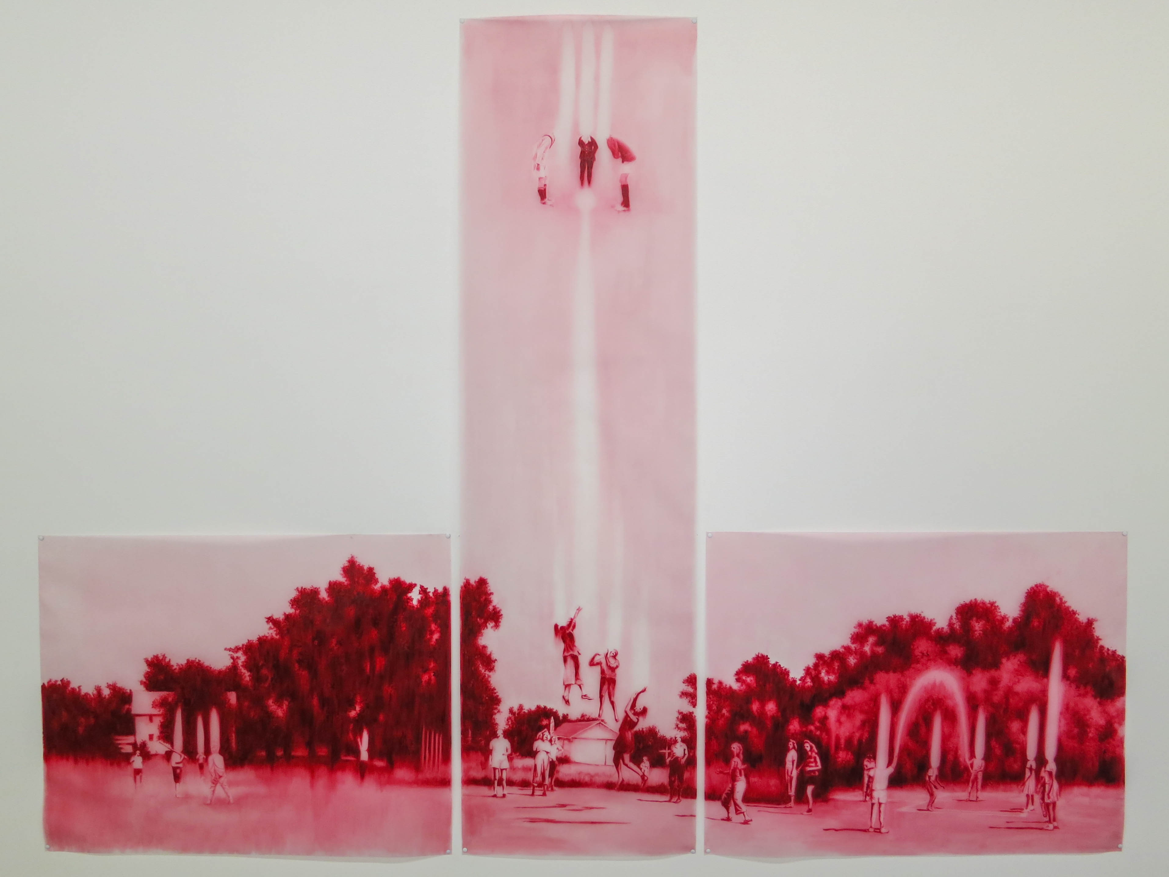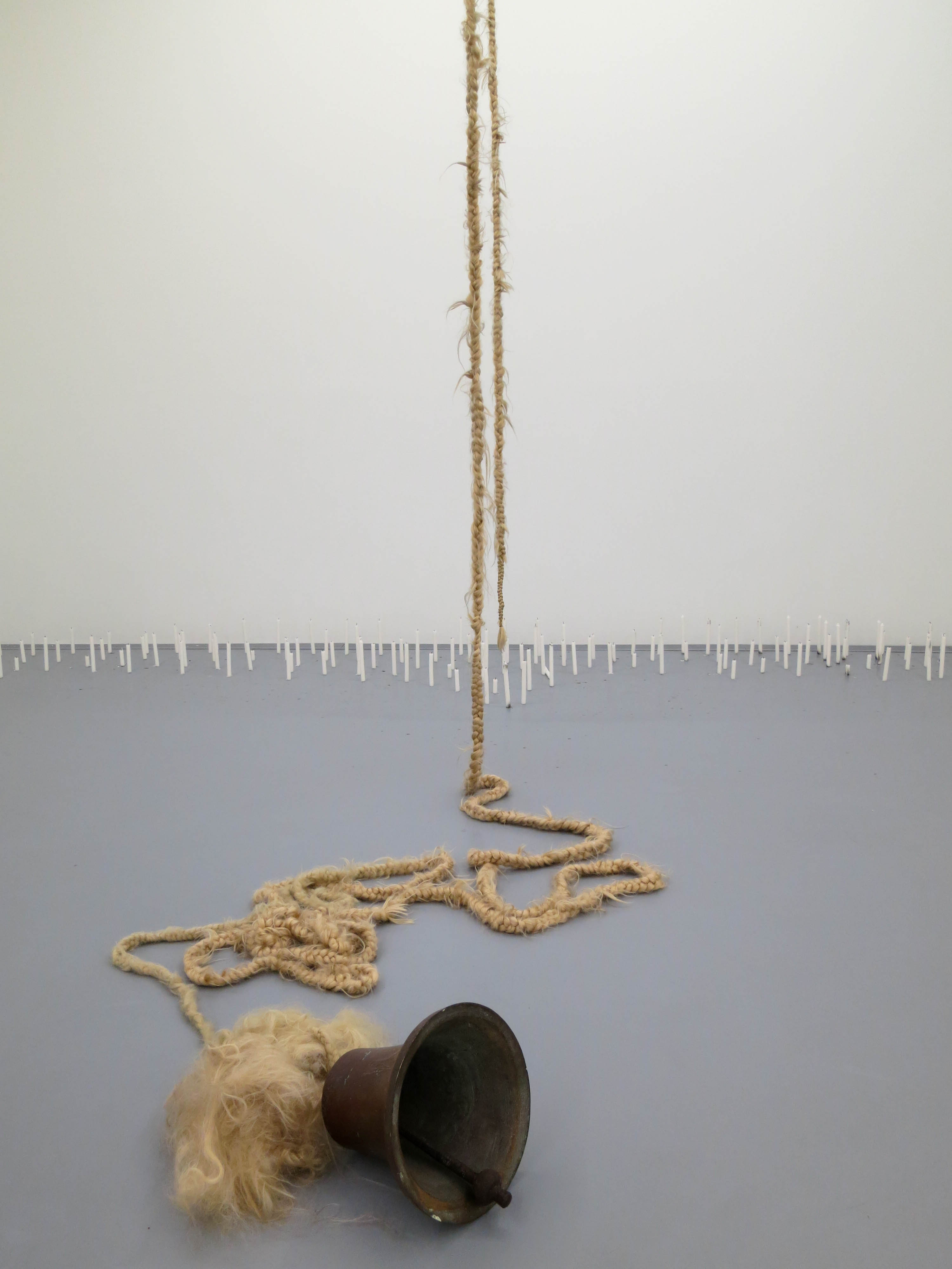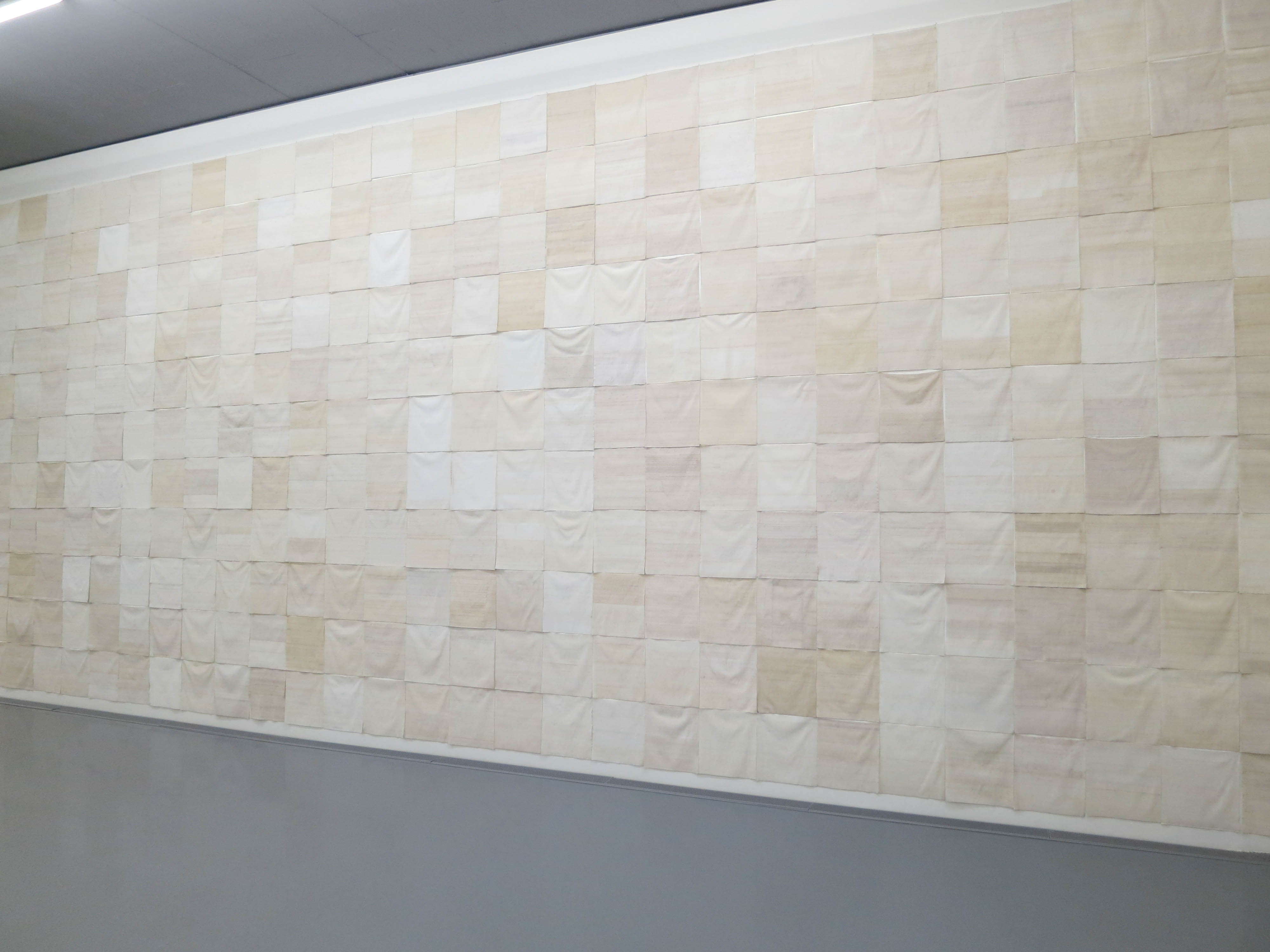 All 4 walls of the room were covered with hand-made sheets. The differing colours came from the oils in the hands of the people who created each sheet.