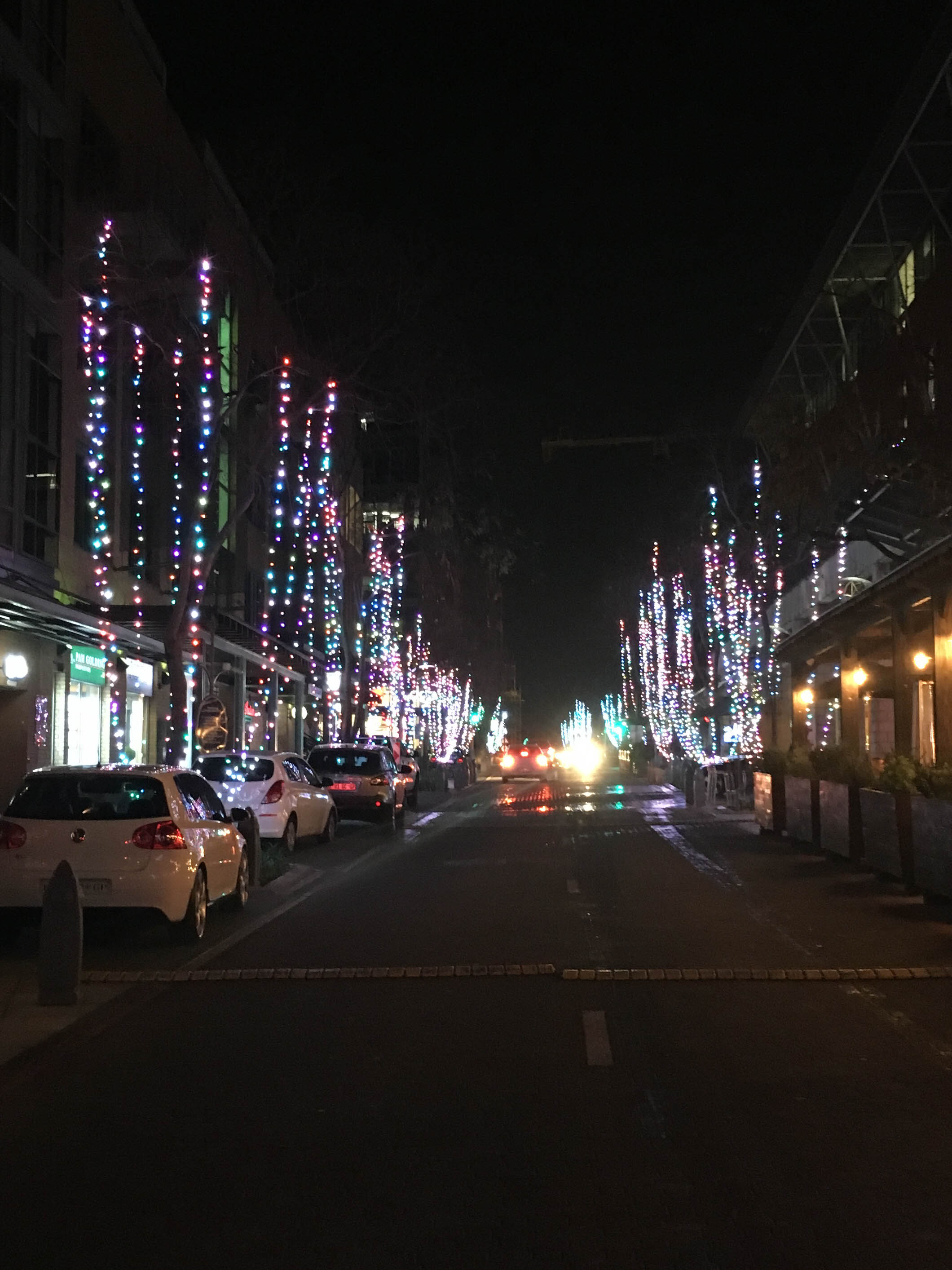 The road outside our hotel had colourful lights on display