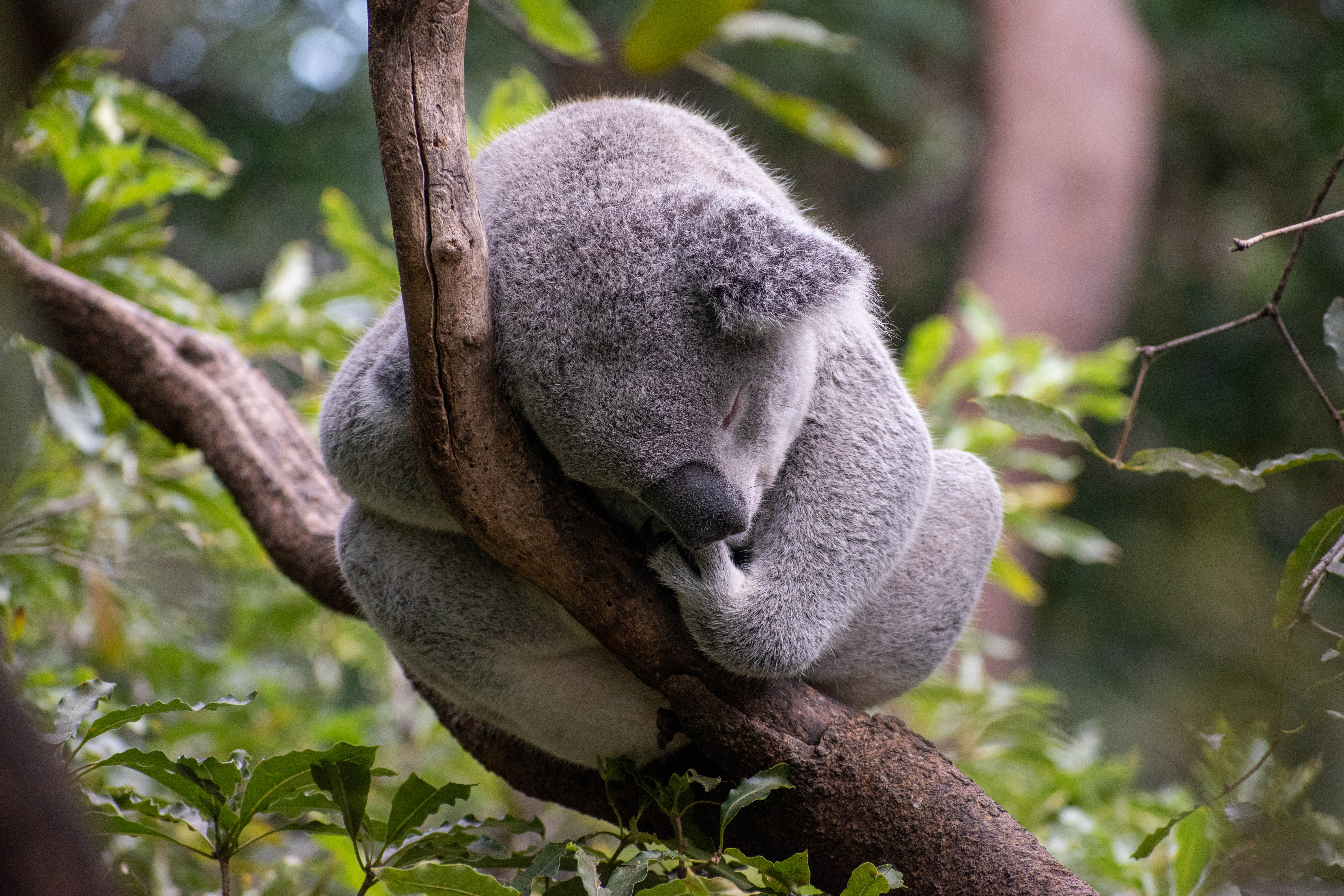 As we rode the Sky Safari up to the main entrance, we had views of animals like giraffes and elephants in their enclosures, and the skyline of the Central Business District in the distance. The views were a great introduction to the zoo! After we reached the top of the hill and disembarked from the gondola we had a short walk down to the main entrance, and we were in the zoo. We started by going to the right, towards the reptile world. The first enclosure in that direction was for the koalas, which we turned into. This was just one of several places in the zoo where koalas live; but this area was notable in that it had a viewing platform that started on ground level, and spiralled up on top of itself, giving visitors a 360 degree view of the koalas living in the trees here. The first koalas we saw were not particularly active; they all appeared to be sleeping.