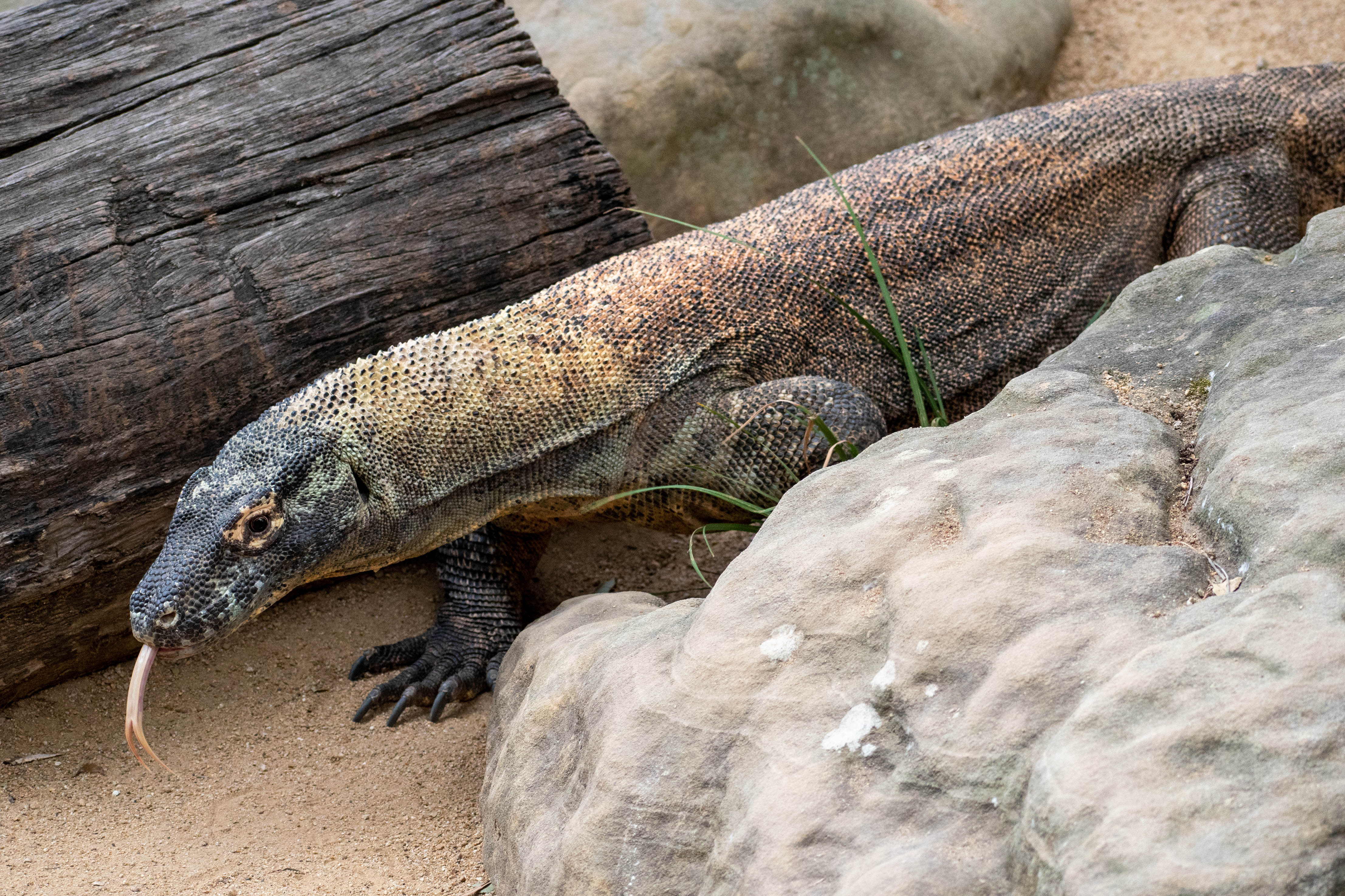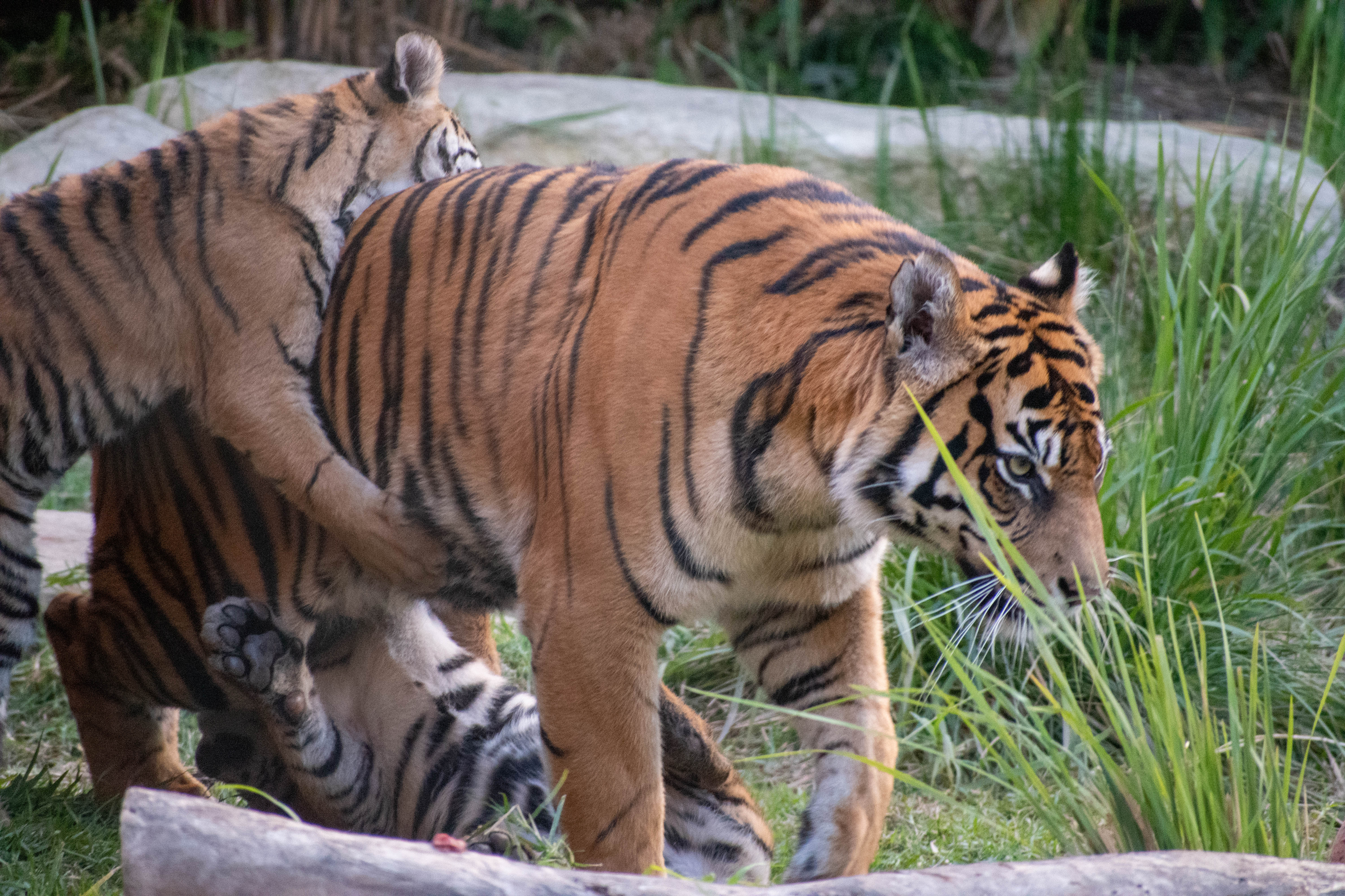 After we left the aviary we took a right turn and found the elephant enclosure. Here we saw a pair of Asian elephants grazing on some grass. Once again, an impressive animal that wasn’t quite as impressive seeing in a zoo. The next animal enclosure we went to was the sun bear enclosure, which was also where we began lining up to see the new tiger cubs. The Taronga zoo has an ambush of tigers from Sumatra, one of who gave birth late last year, and they had a special exhibit setup to showcase these magnificent animals. It took about 5 minutes of waiting before we were able to enter the tiger exhibit. They had built a mock-up of an airplane, and showed a short video that gave us the impression that we had flown from the zoo to the jungle of Sumatra, and once the video was complete a door on the far side of the plane opened and allowed us to walk into the tiger area. I suspect this was something they set up in order to help manage the crowd, but it was actually a really clever way to transport people into a different mindset ahead of viewing something special. The first tiger enclosure held the grandparents of the tiger cubs - there were two tigers sleeping on a platform. The next enclosure held the mom and her three children, who were playing around while their mom watched. We spent a good ten minutes watching the young cubs play, first just amongst themselves but then eventually with their mother. The cubs were no longer babies but were clearly not full grown either. It was a great experience. The final enclosure in the tiger area held the father, all on his own. He was initially just lounging on the ground, however as I stopped to get a photo I did something which got his attention - he looked up, right at me, roared, then leapt to his feet and began to charge towards me. It was a pretty startling moment, luckily he stopped before reaching the fence, turned around, and went back to lounging where he had started. It was a very unsettling experience - watching this large animal begin running towards me got my adrenaline pumping. I still don’t know what I did that would have caught his attention - my camera flash was off and I had already taken several pictures without any notice. Regardless, it was an interesting story to be able to tell.