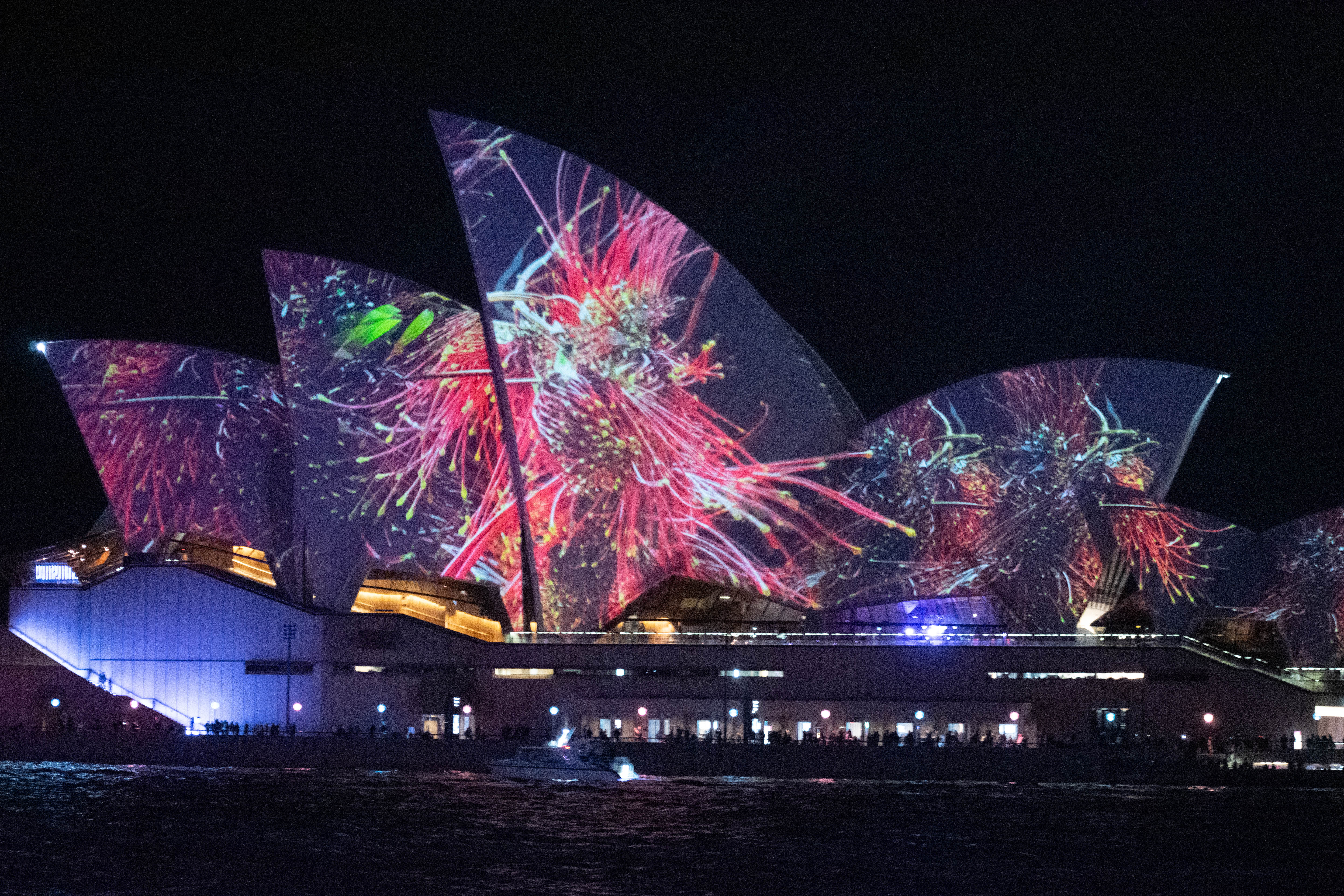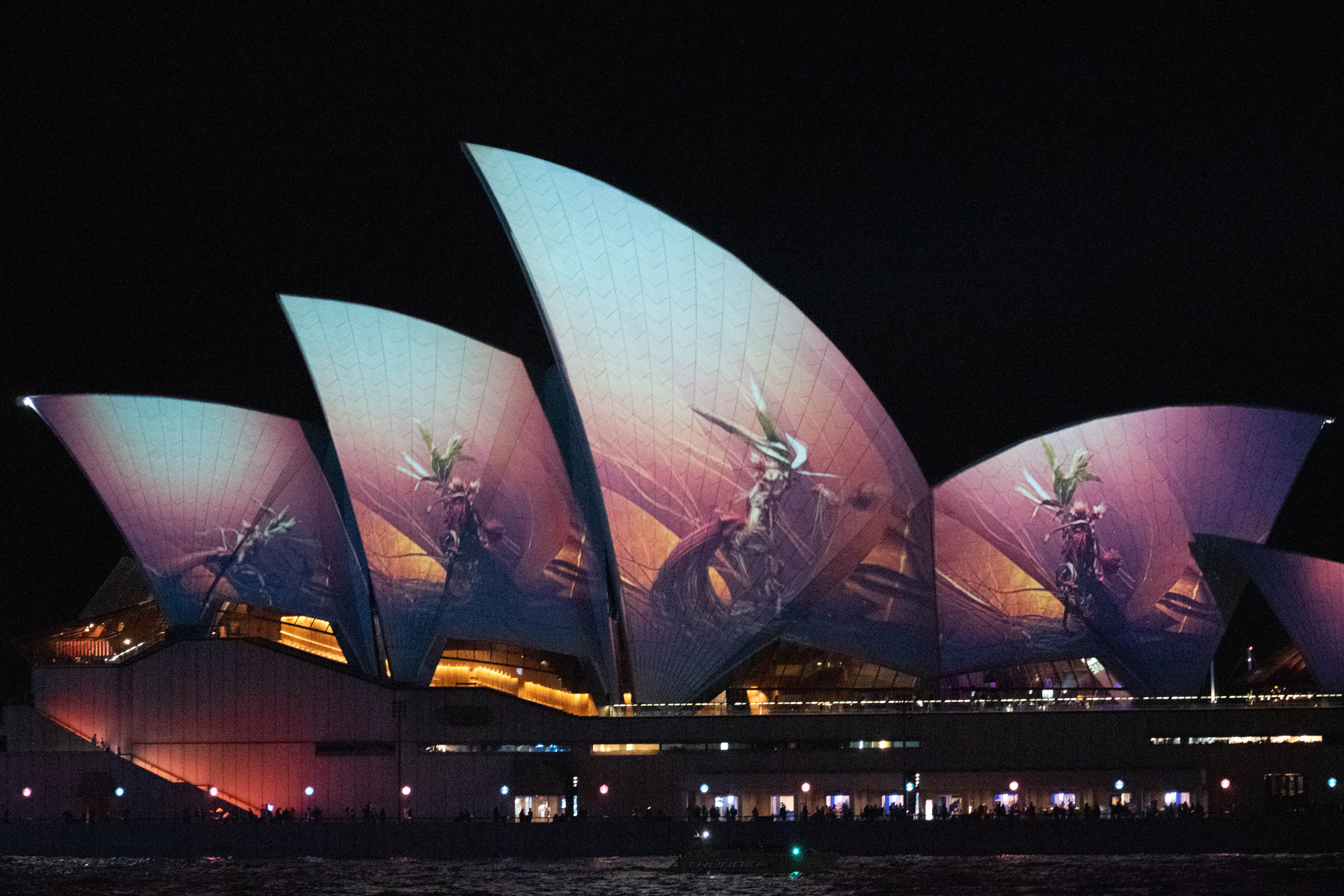 We walked down through the rest of the zoo, and left just as the park was closing. The wharf was busy with families leaving the zoo, but we were able to find seats on the next ferry. It was a quick ride back to Circular Quay as the sun was beginning to set. We arrived shortly after 17:00, and since the sun wasn’t fully down the Vivid exhibit hadn’t started. We chose to do dinner downtown, and then see the Vivid exhibit. We pulled out Google Maps and decided to have dinner at a well-reviewed Japanese restaurant, named Kid Kyoto. It was a short walk from the station, and we arrived to a restaurant that was pretty much empty. When we asked for a table, however, we learned there was only one table free as the rest were reserved. It was our lucky night! We ordered a nice selection of dishes, including a pair of katsu pork bao sandwiches, tuna sashimi, chicken skewers, and a pork rump dish with pork. Each dish was delicious, and we really enjoyed our meal. After dinner we walked out into the CBD and begin exploring the Vivid displays. We started on the western side of the wharf, where there was a full building projection on the Museum of Modern Art that we spent a few minutes watching. We then walked along to the wharf and were able to see both the lights setup on the Harbour Bridge along with the video being projected onto the Opera House roof. This display was spectacular - the projection was incredibly crisp and bright even though it was being projected from across the harbour onto the building. This was clearly a very technically advanced display.