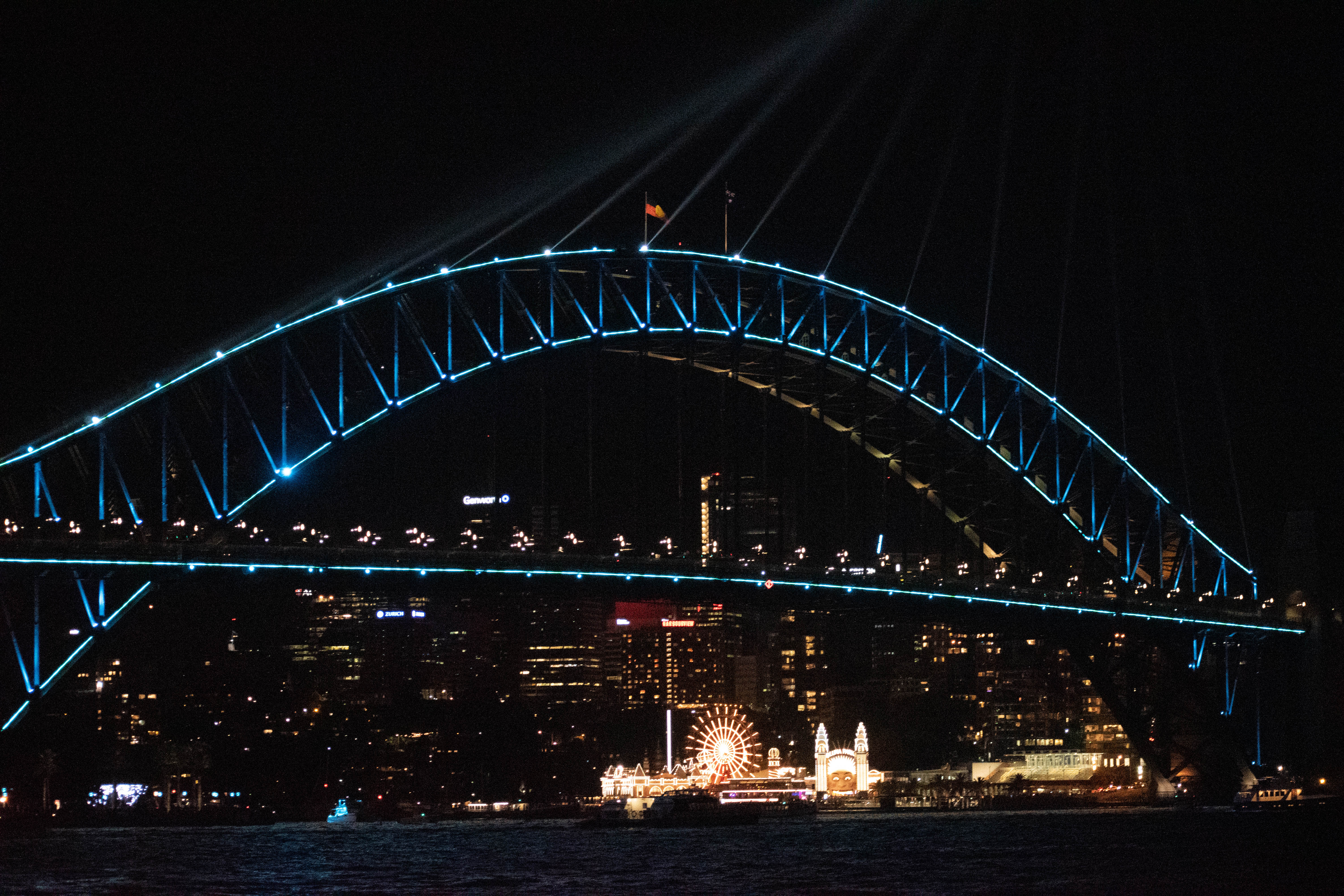 The Harbour Bridge lit up, with Luna Park visible in the background