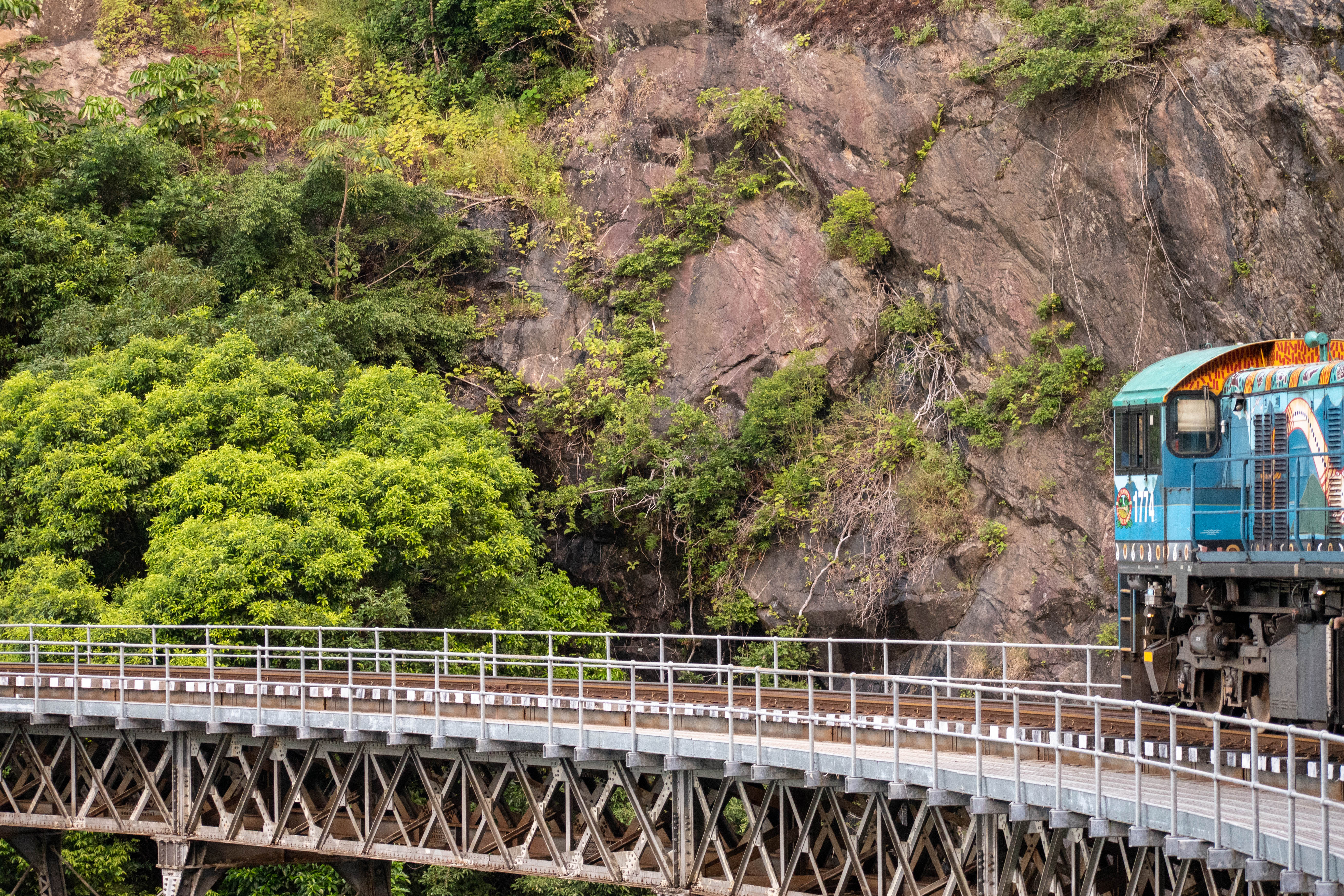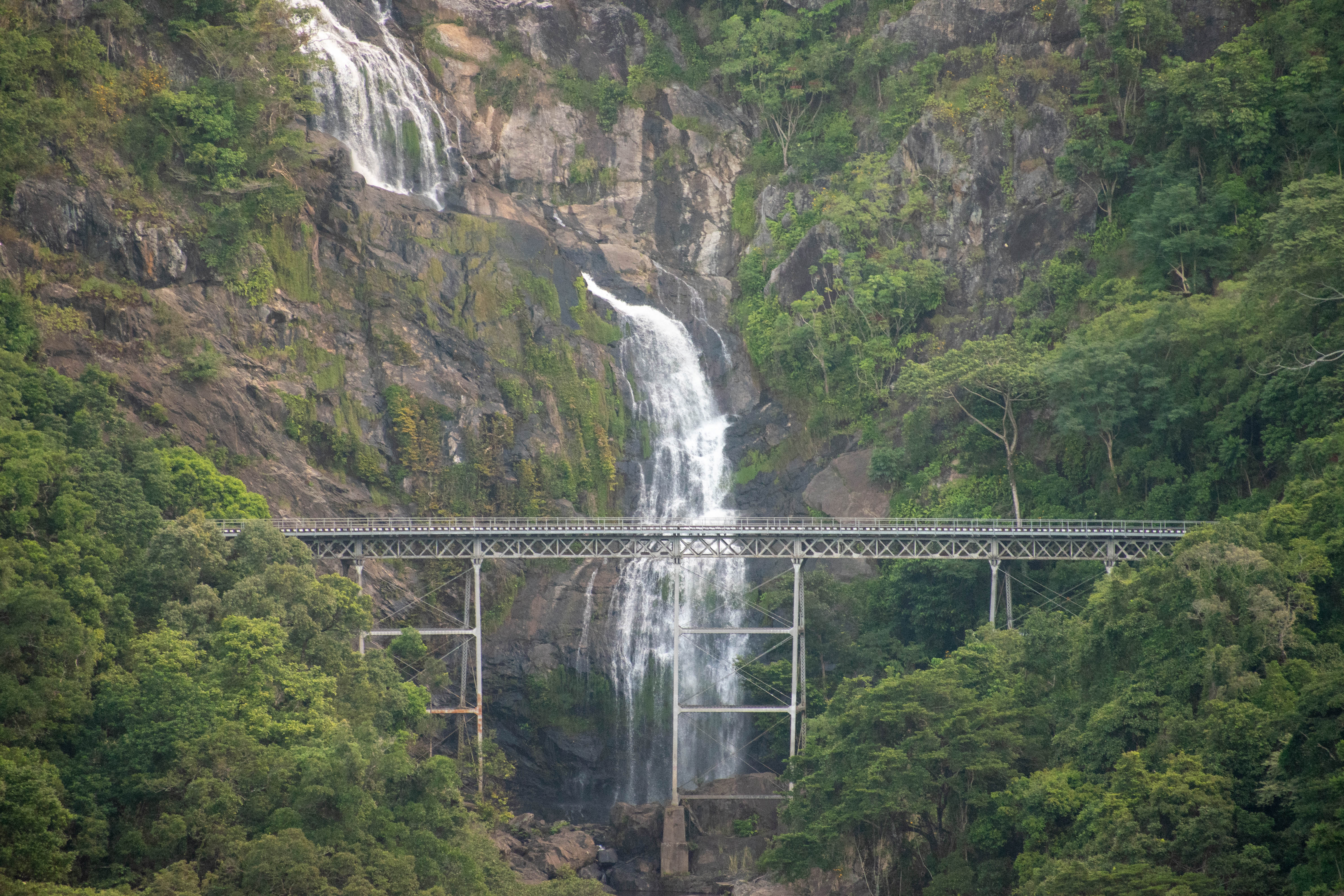 As the line climbed higher into the mountain we got better and better views of the city of Cairns, the mountain range itself, as well as the ocean. About halfway through the trip we crossed the most impressive bridge on the line, which allowed the train to pass Stoney Creek Falls. Here the engines slowed down to give us a better view both of the waterfall to the left hand side of the train, but also the gorge out to the right hand side of the train. The bridge itself is an example of a curved lattice railway bridge, and it is itself a beautiful structure nestled right into the side of the mountain. The train geek in me was very impressed.
