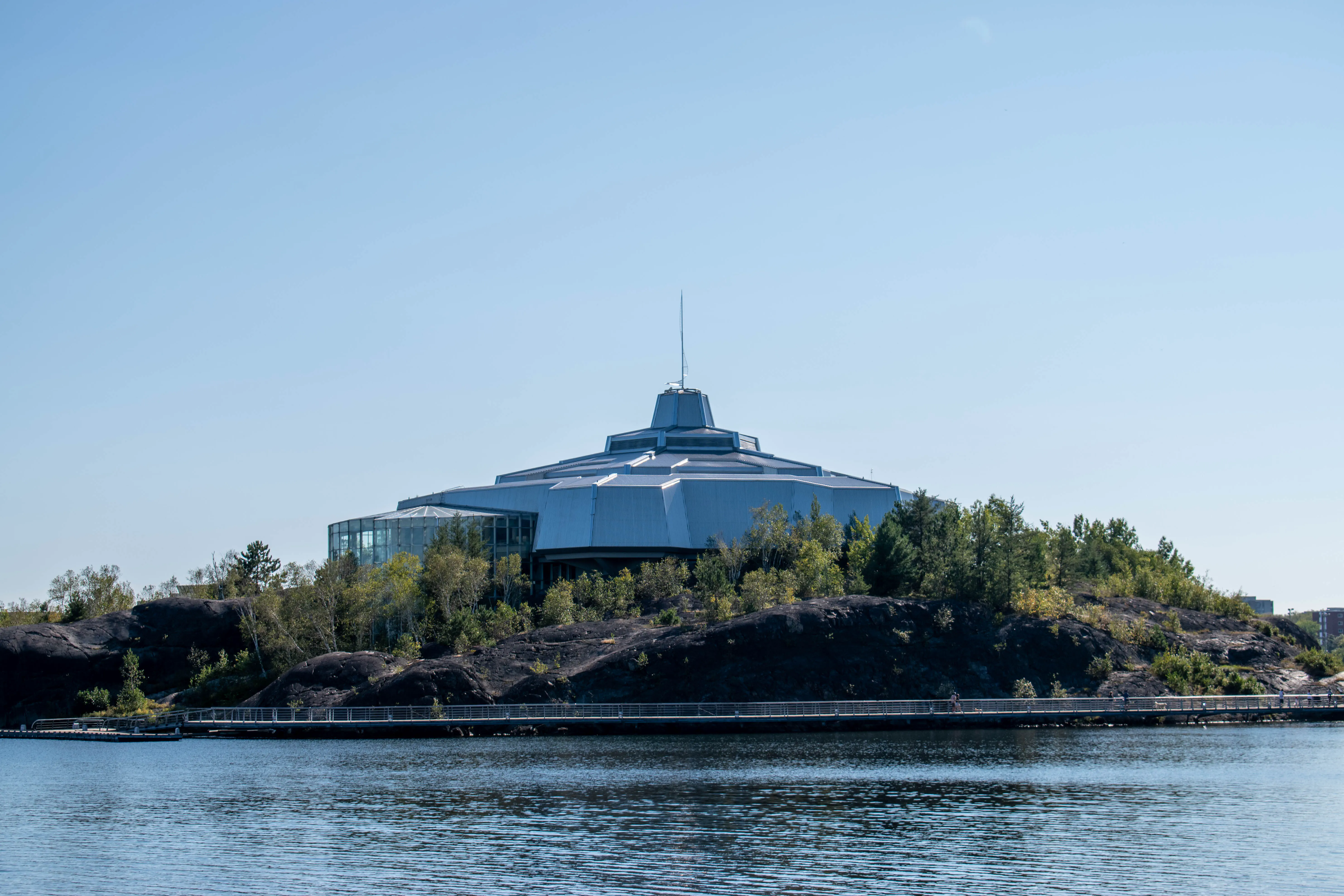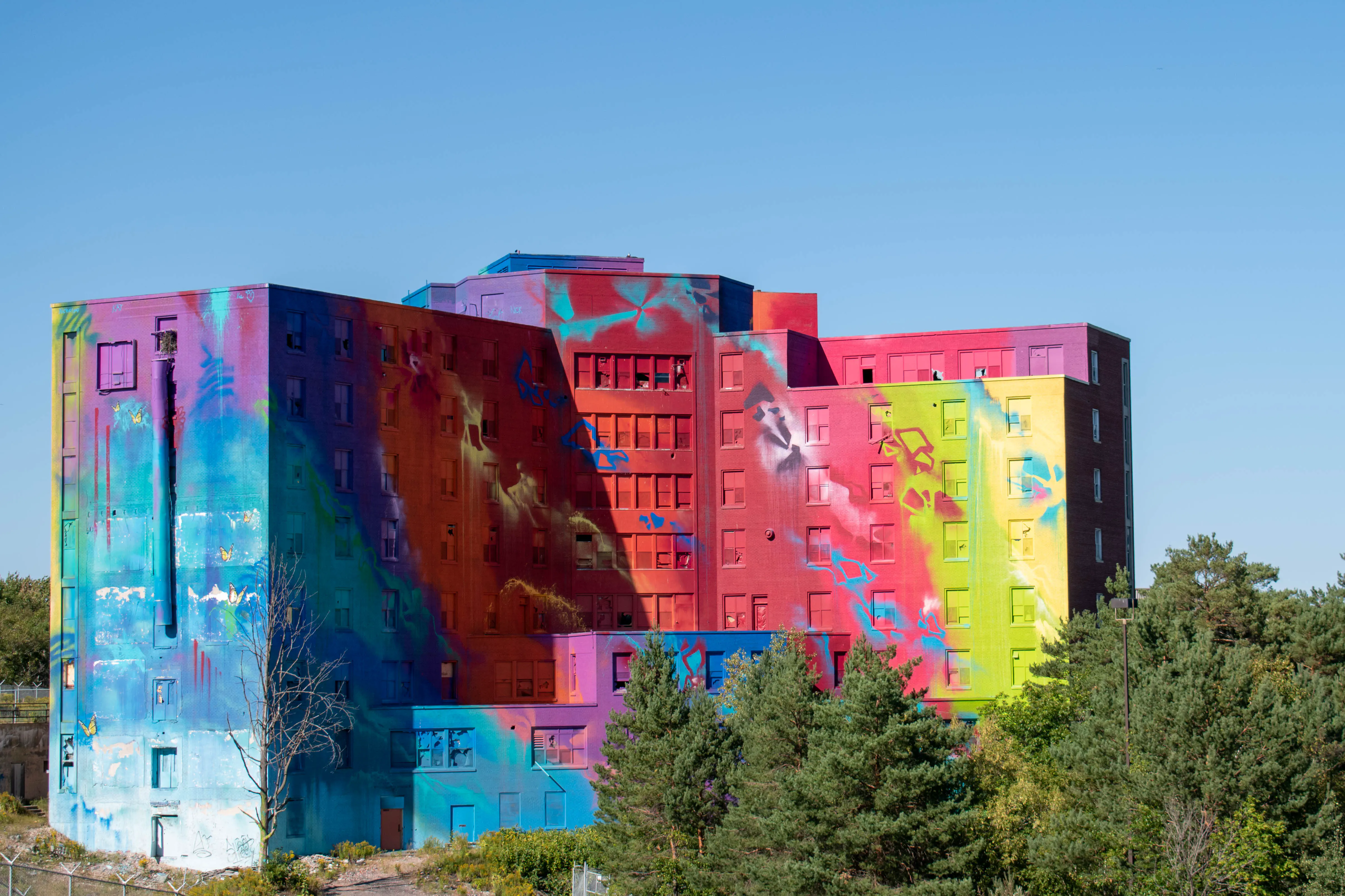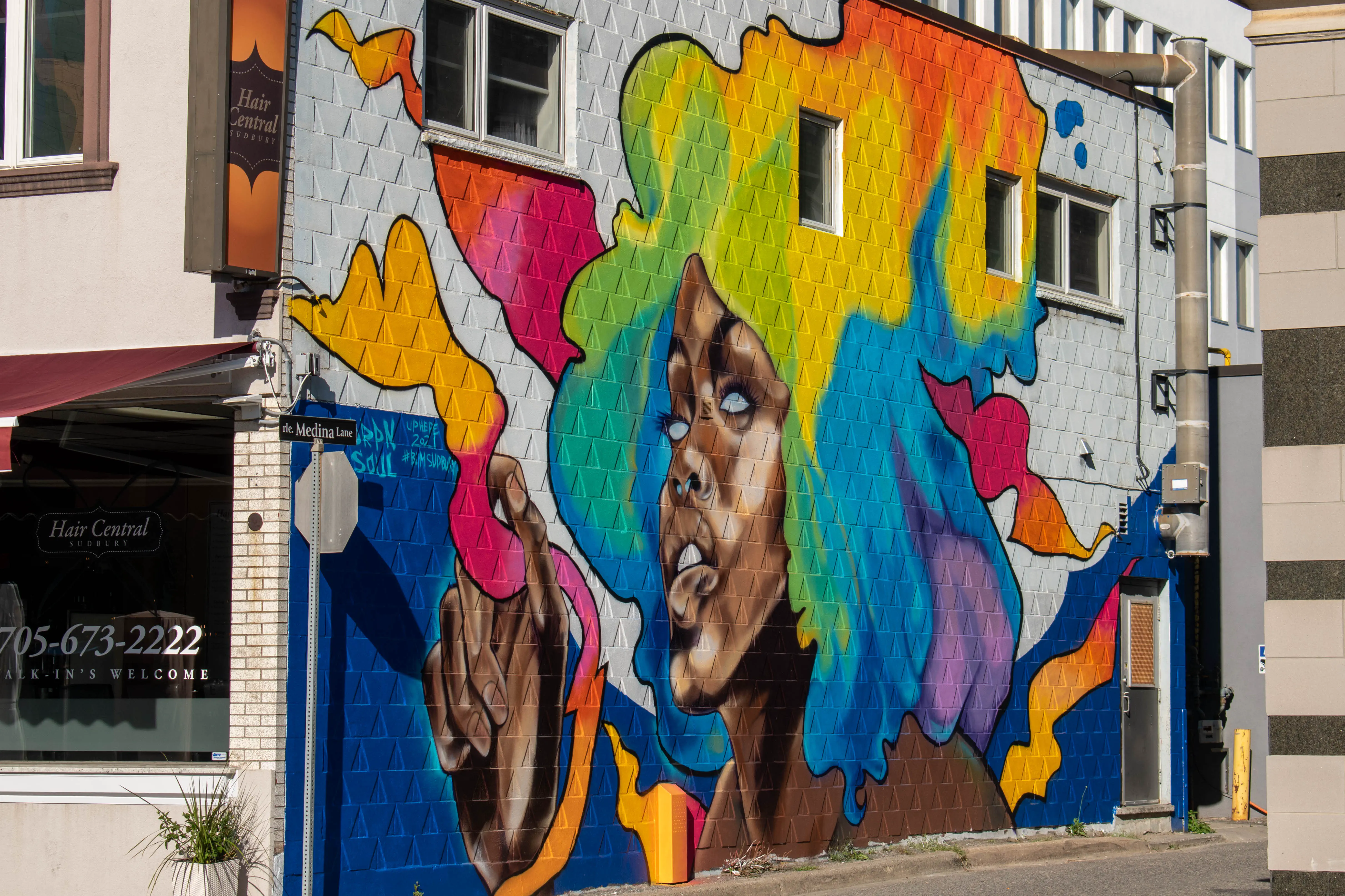 The next place in Sudbury that we visited was the site of Canada’s largest mural. The city had a graffiti artist, known as RISK, decorate the 80,000 square feet exterior of the old Sudbury hospital in 2019. The resulting multi-colour display is the largest mural in Canada. After parking we took some photos of the hospital, and then walked along the Bell Park boardwalk towards Science North and took in the sights of Hermit’s Bay. We returned to the car around 17:00 and drove downtown.