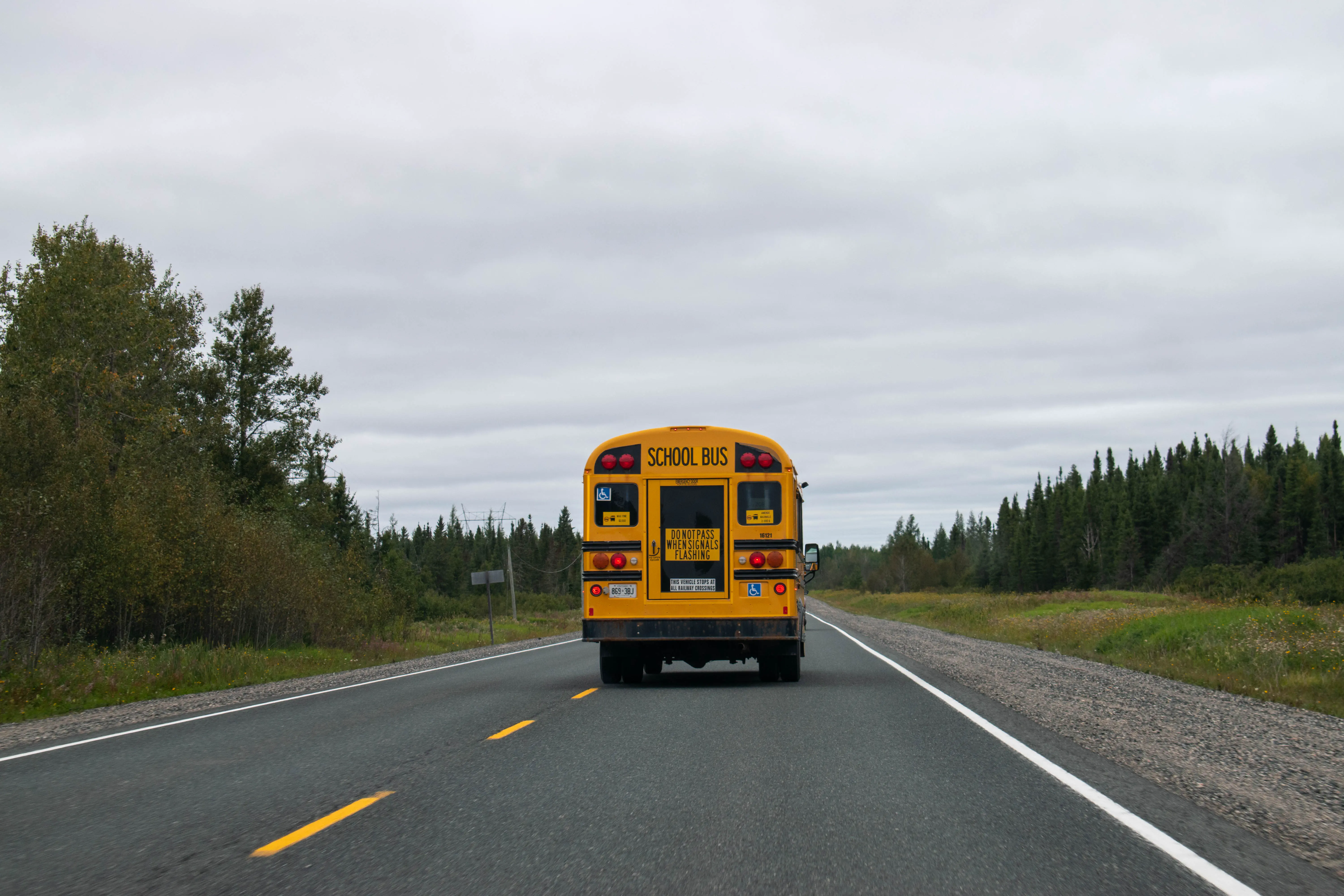 Once we left Timmins we settled back into being on the highway. When the Tesla navigation system has a destination set, it will warn you if your driving behaviour is going to prevent you from reaching the set destination given the amount of battery charge still in the car. The navigation system will suggest a maximum speed, and it will remind you of this if you exceed it. Thankfully we had more range than we needed, but we were still keeping to roughly the speed limit while we were driving on ON-655. In some cases this was not fast enough for the vehicles around us - at one point a school bus sped past us doing easily 110 km/h. Ironically enough, shortly after we were passed by the school bus we encountered a road construction crew that was repaving the highway, and we had to stop since our lane was being used to route opposite direction traffic around the construction. We saw the school bus that had passed us only a couple of cars ahead.
