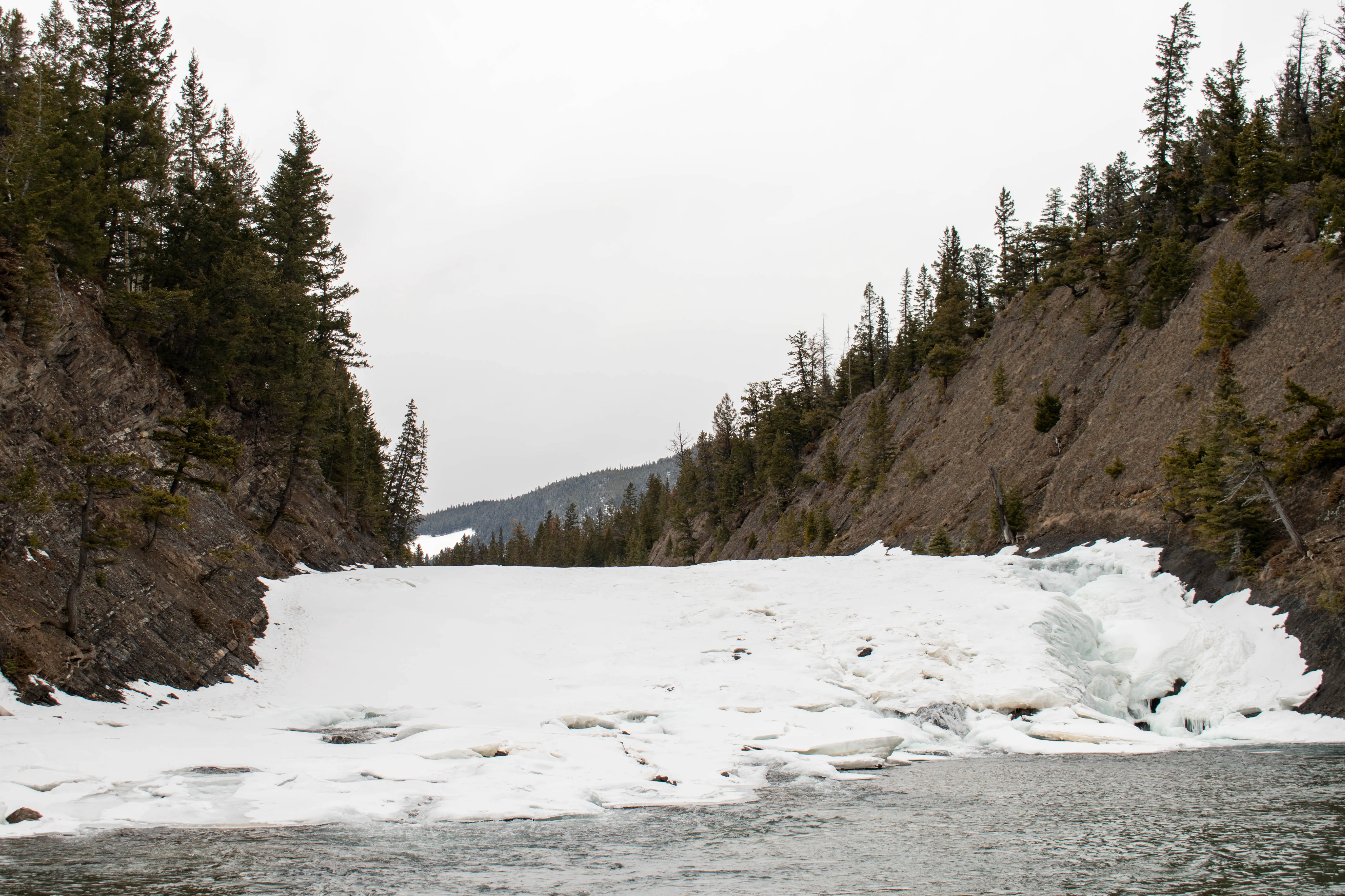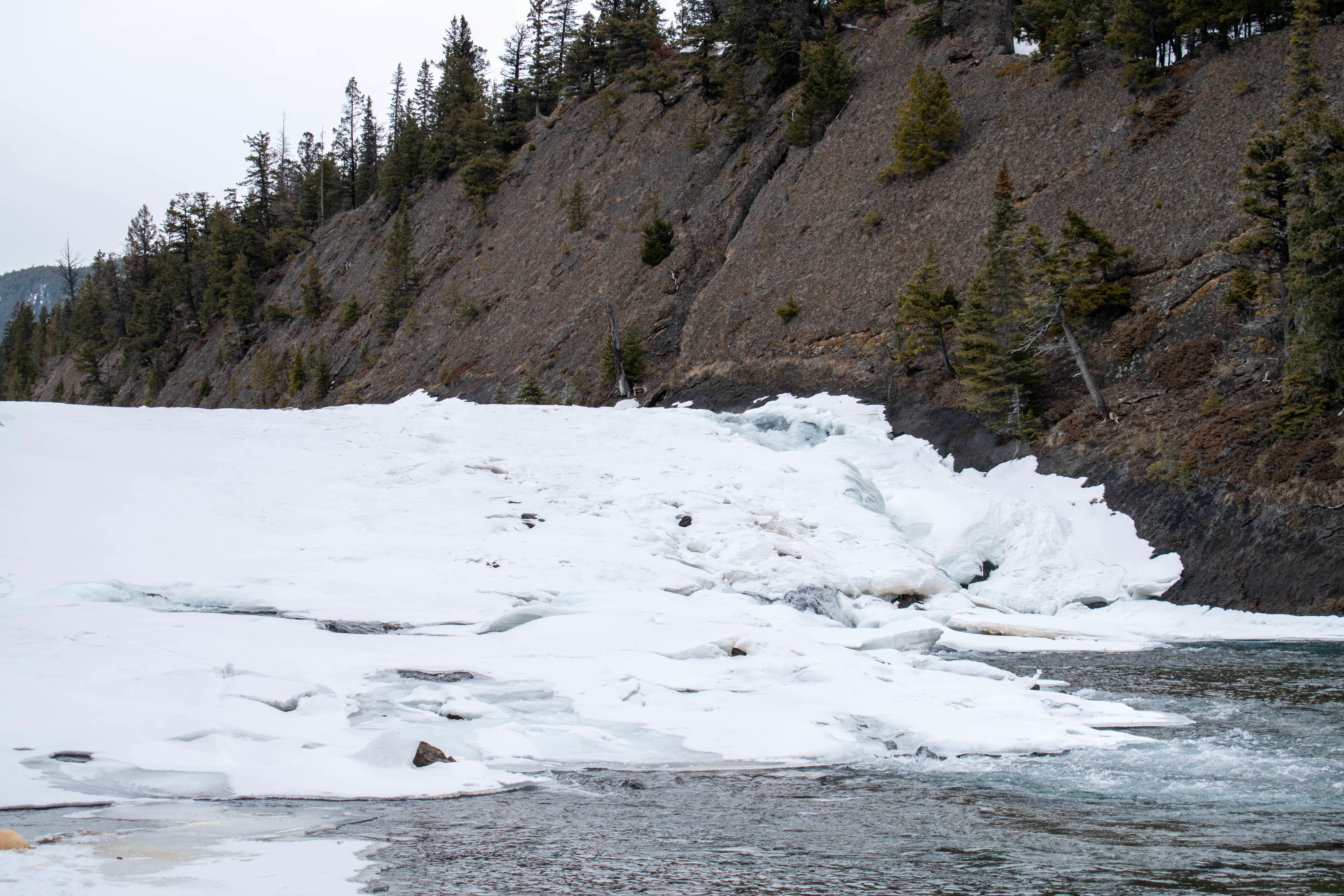 A classic walk in the town of Banff takes you along the Bow River, to Bow Falls. I did this walk several times while in Banff; and the ice formations you can see on the river are pretty impressive.