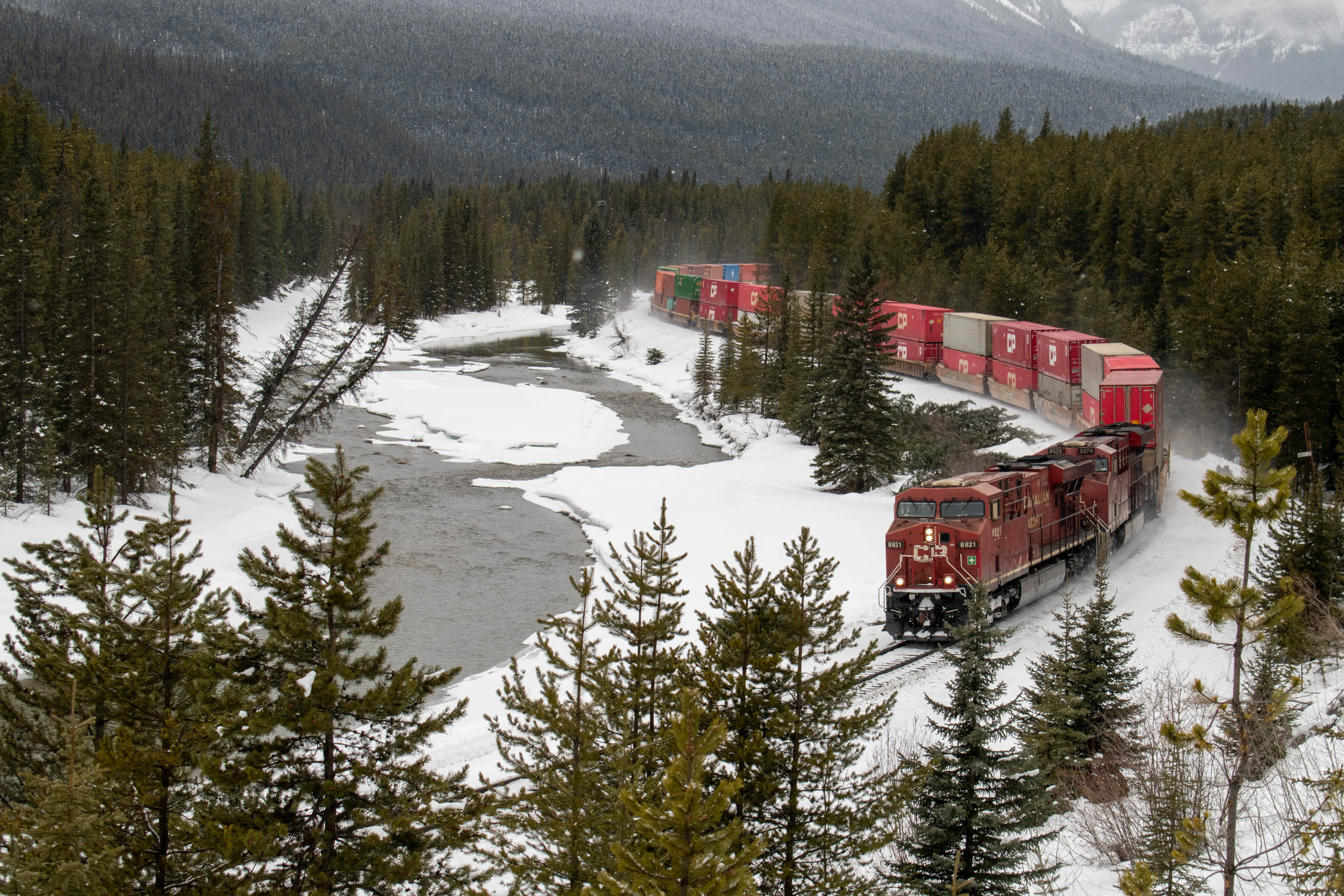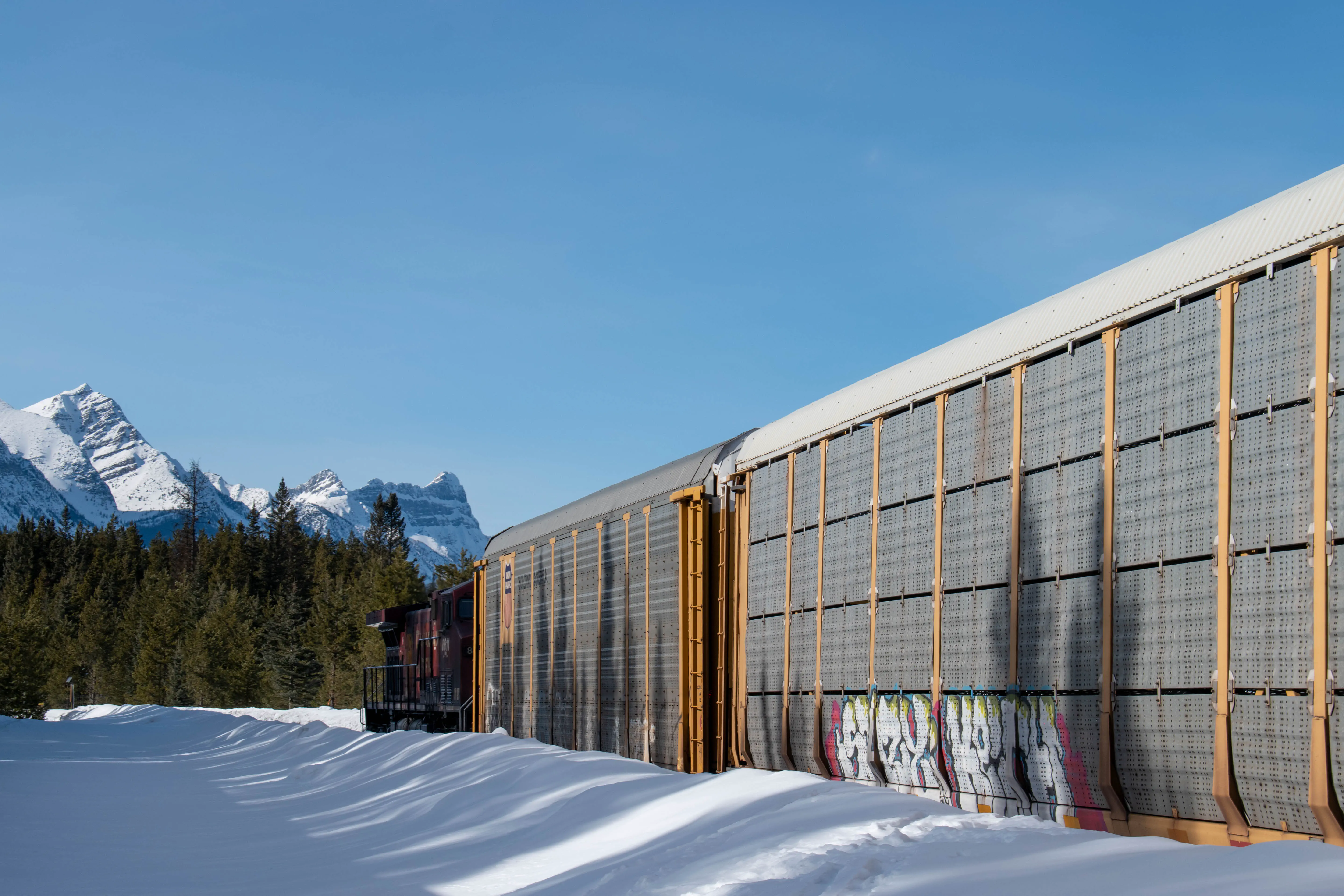 This might be one of the most iconic places for taking train photos in Canada. In the years after the second World War, the Canadian Pacific employed a photographer named Nicholas Morant who generated much of the photographic material used by the Canadian Pacific marketing department to popularize the country with tourists. His favourite place to take photos of trains was a curve along the Bow River, east of Lake Louise, and this spot is now known as Morant’s Curve in recognition of his work. I only visited Morant’s Curve once, but was very lucky that an eastbound train decided to appear during the brief period of time I was there.