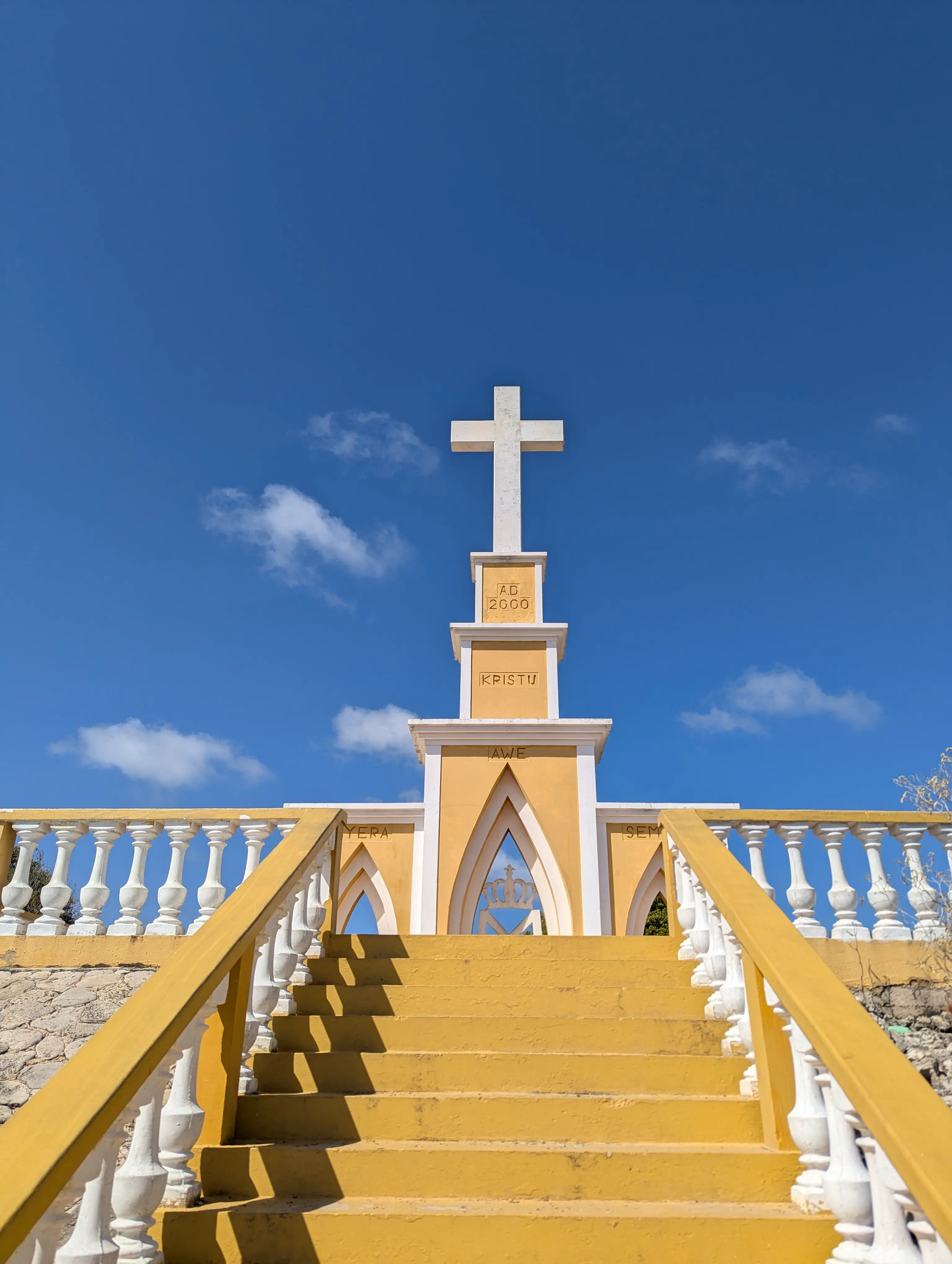 The boat returned us to the dock shortly after noon; after unloading our gear, rinsing it and hanging it in our locker for the week, we returned to the room for a shower. We had lunch in Mom & Dad’s room at 1:15 in the afternoon, and finished it shortly after 2 PM. After we had finished eating we got into the truck and went for a drive up to Seru Largu, a large cross on the top of a peak on the island which gave great views to both sides of the island.