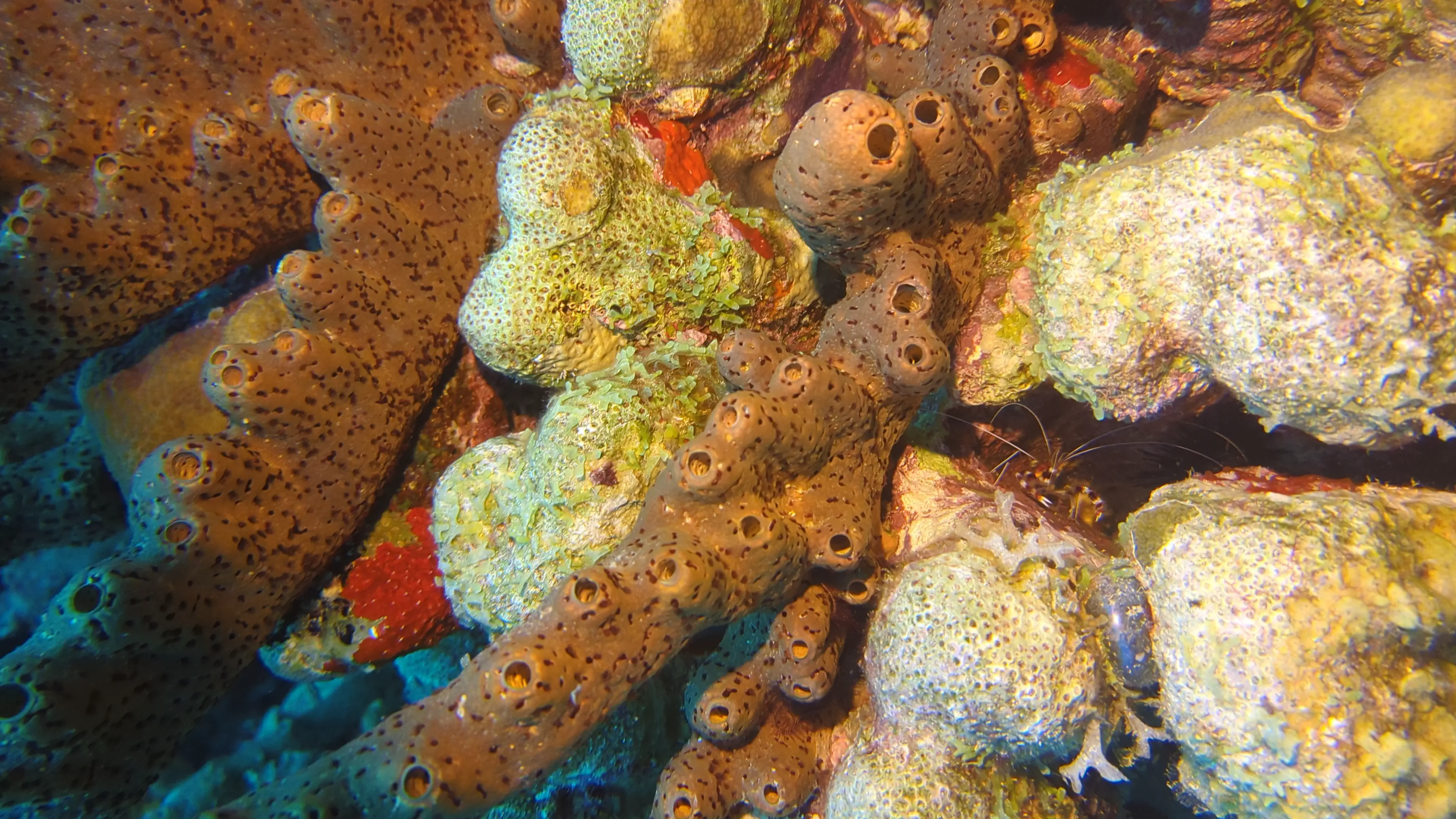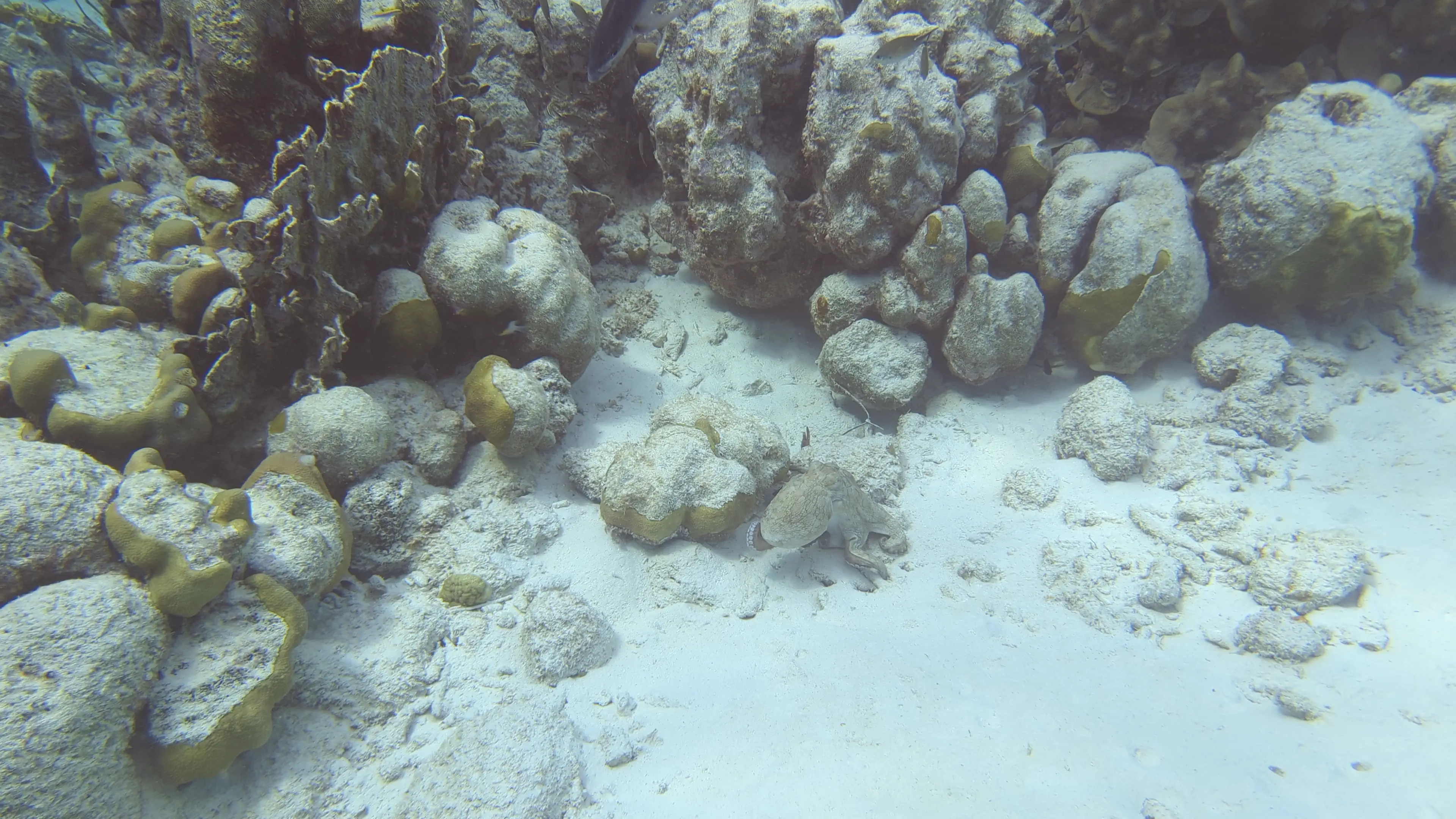 We returned shortly after noon, and went through the usual routine of rinsing our gear and getting it packed back into the locker before heading back to our room and getting cleaned up. We joined Mom in her room for lunch shortly after 1 PM. After lunch we went back down to the dive shop and got our gear out to do a shore dive on the house reef. I had reset my camera case and tested it after lunch, and thankfully it worked well for the dive. We swam to the ‘right’ from the dock, and went for a full 30 minutes before turning the dive. We passed by the wreck of the Machaca, and then swam back on the top of the reef past the coral nursery. We ended the dive shortly before 60 minutes with lots of air remaining. We saw an octopus, a moray eel, and a couple of spotted snake eels in the shallow water. The octopus was particularly interesting as we got to see it swim - in Mallorca the octopi we saw were all stationary, so seeing it swim was a new experience!