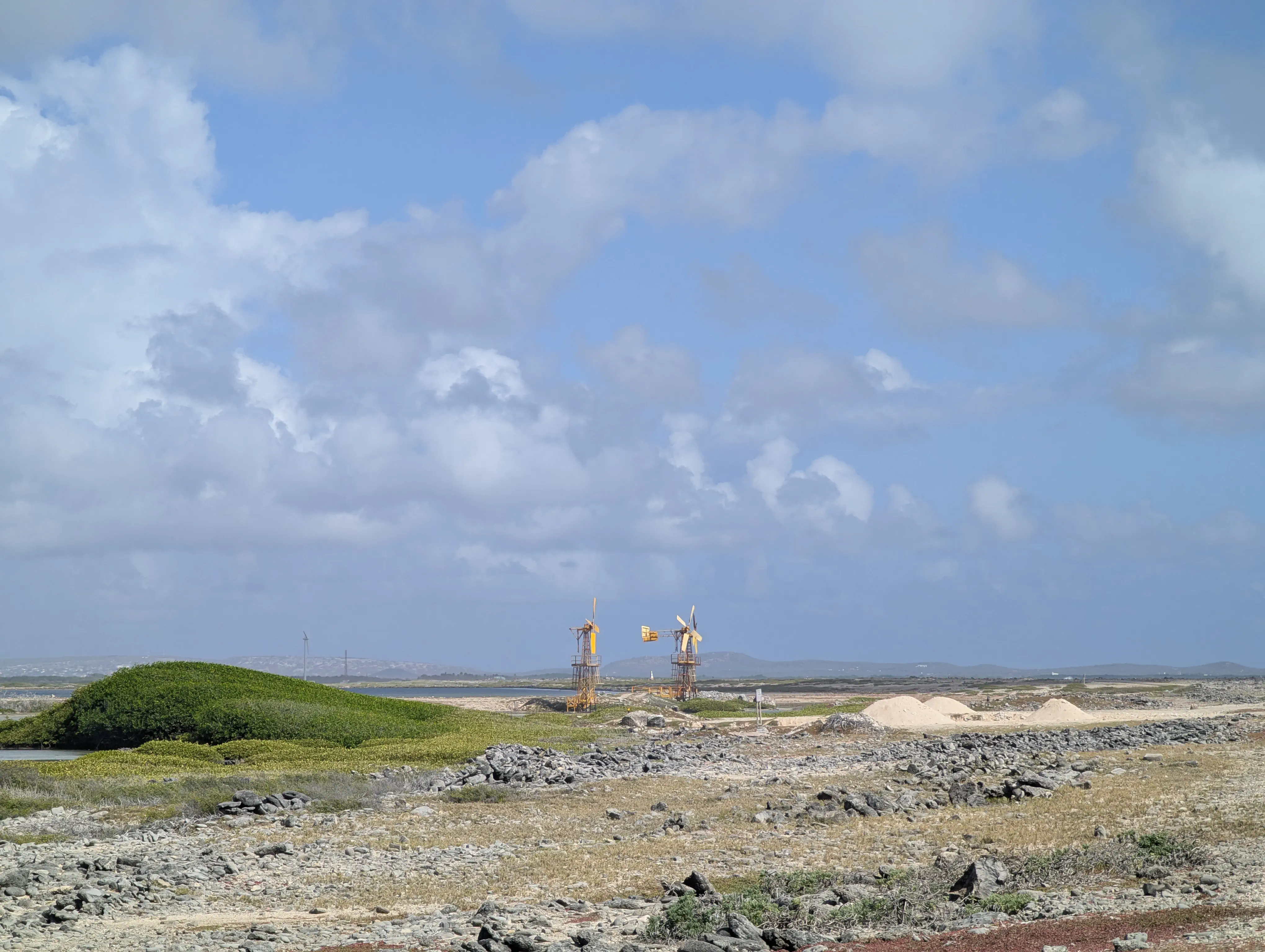 Leaving Sorobon the road remained paved, but it was only wide enough for a single vehicle. Travel in both directions was allowed, so when we encountered other cars both cars had to slow and have our right tires off the pavement in order to safely pass. As we drove south we stopped at a few points to look out over the ocean, but there was really not a lot specifically to stop and see. It wasn’t long after leaving Sorobon that the terrain changed from low scrub brush to the salt flats where the sun evaporates the ocean water and yields salt which is collected for export. A short way into the salt flats we saw a pair of old style windmills, which presumably power something involved with the salt facility.