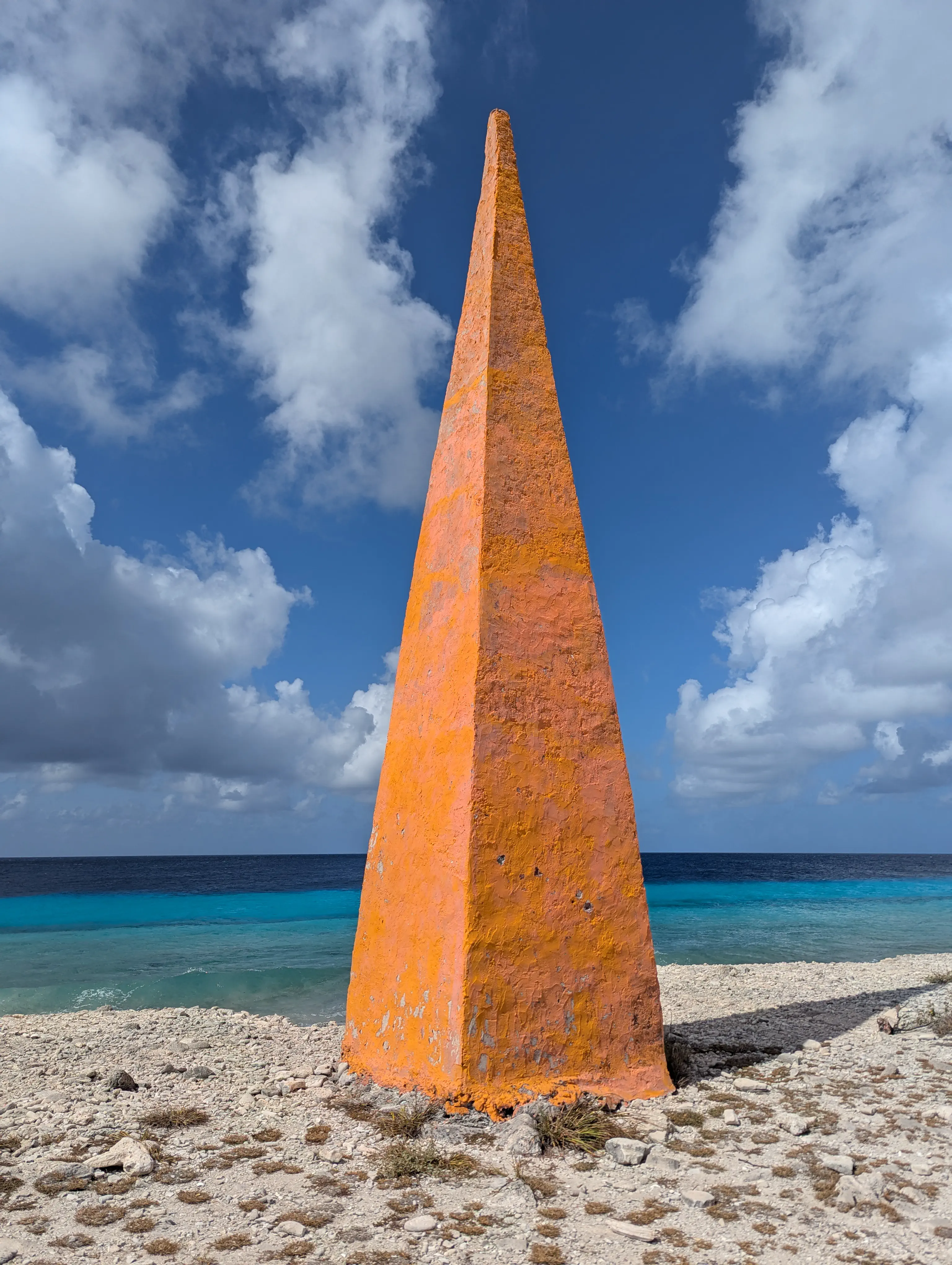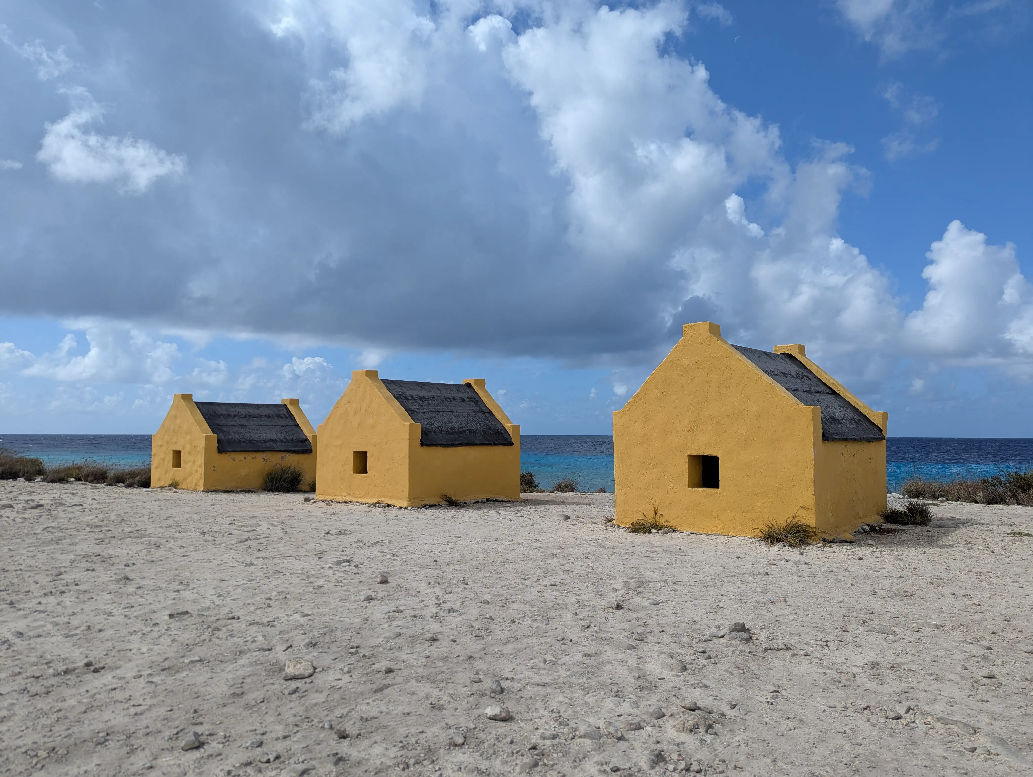 It was just after leaving the lighthouse that we started encountering a stream of golf carts driving towards us. The road was still a single lane wide, so the drive slowed down as we kept having to carefully pass each golf cart. It seemed like the golf carts were rented by people visiting the island for the day from the cruise ship as a way to see the sights, but it did make driving on the road a bit more challenging. A short distance after the lighthouse we encountered a set of small yellow buildings which used to house slaves which worked in the salt industry on the island. In the early days of the salt trade they would live in Rincón on the weekends, and travel down to load ships with salt during the week. While they were loading ships they’d live in these little yellow buildings. It was interesting to read a bit more about the history of the salt industry on the island; for example there were 4 piers where ships could load salt, and based on the colour of the adjacent monolith the boat would know the grade of salt they were receiving. There was an orange pillar near the slave houses; we had seen a white pillar near the current salt pier which was apparently a holdover from the original days.